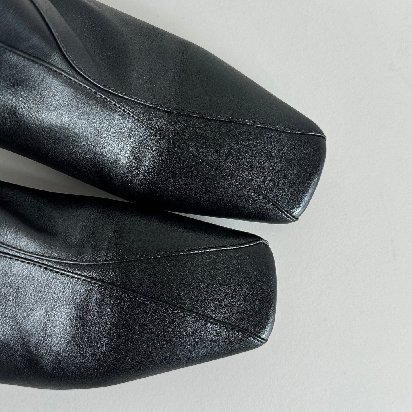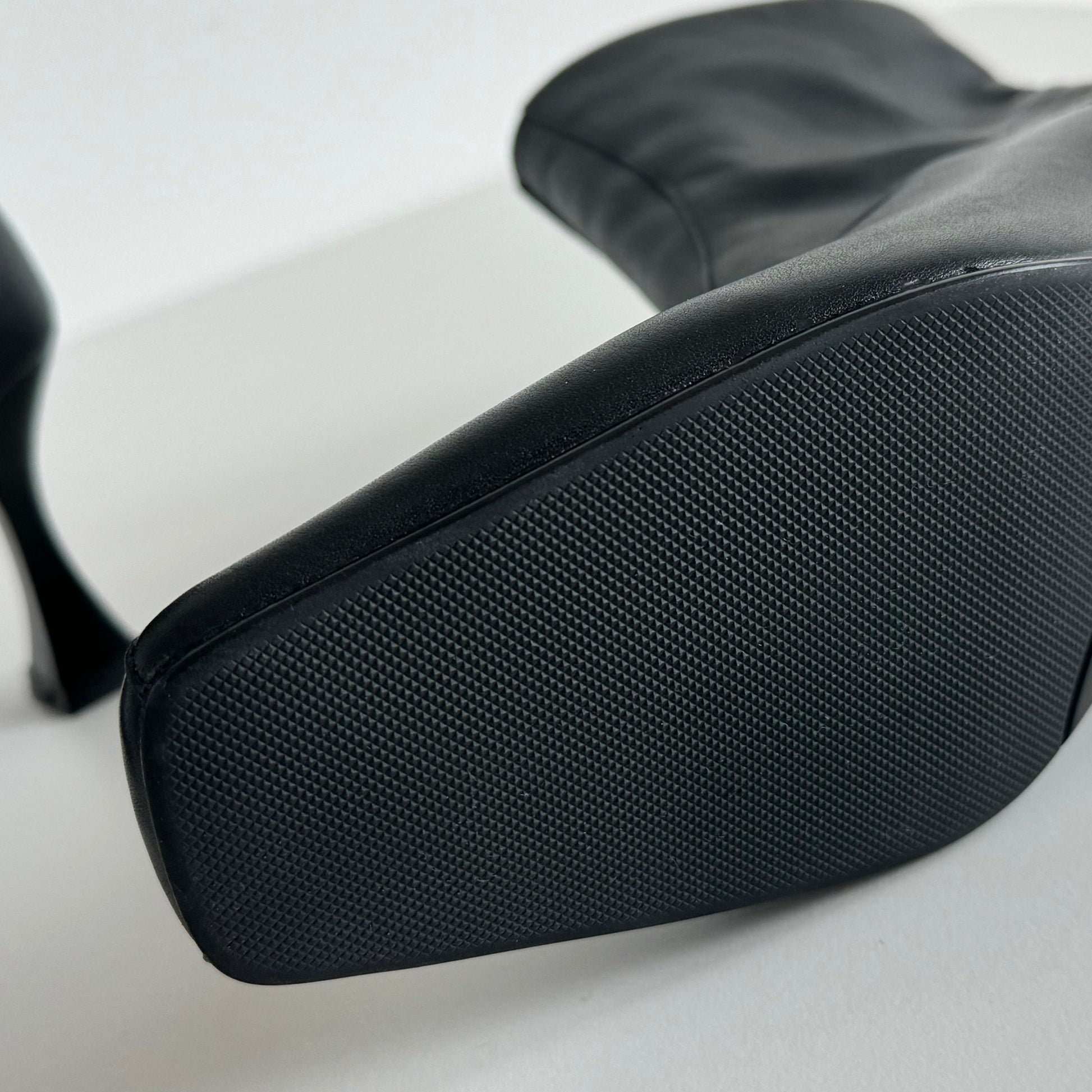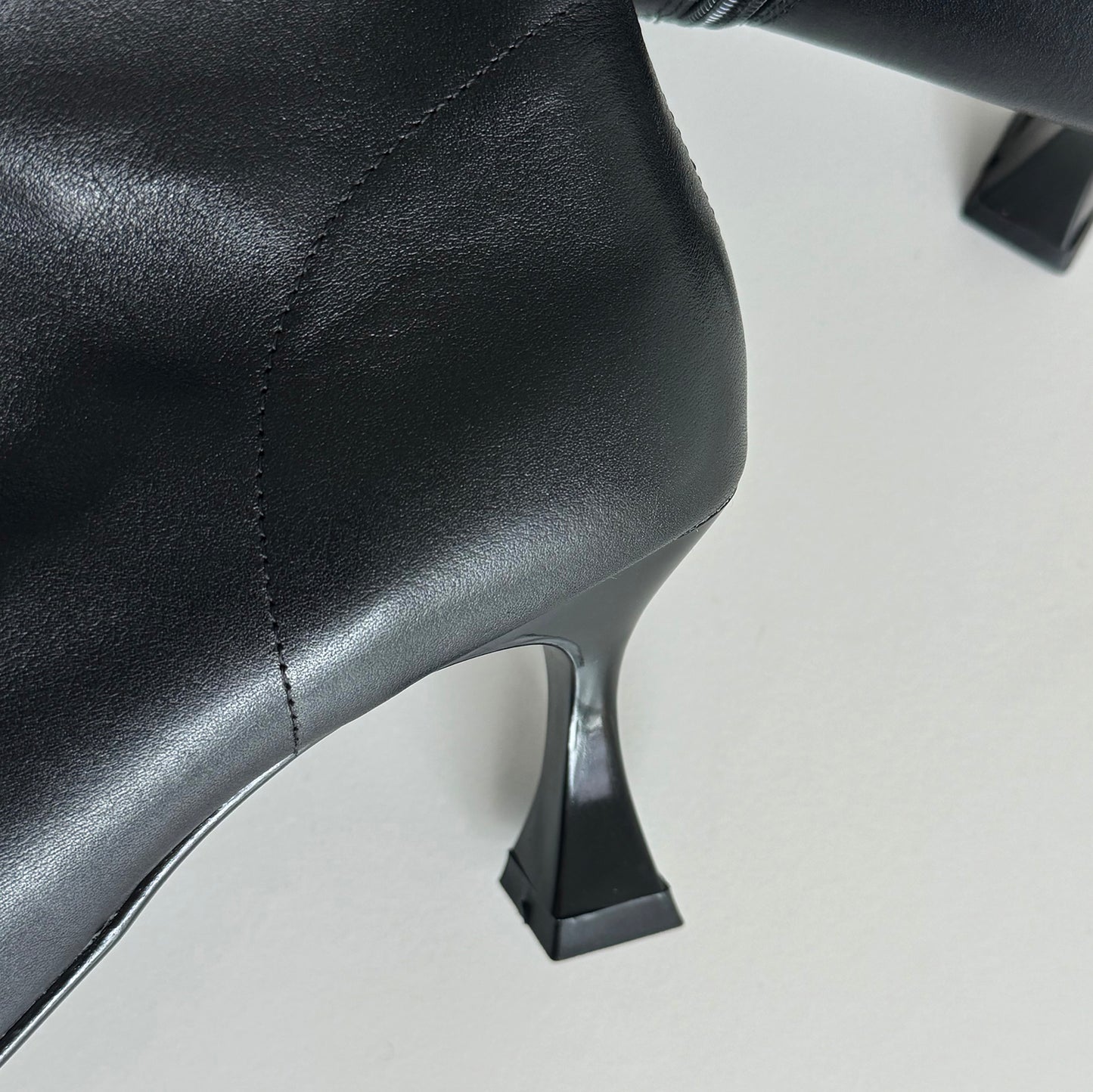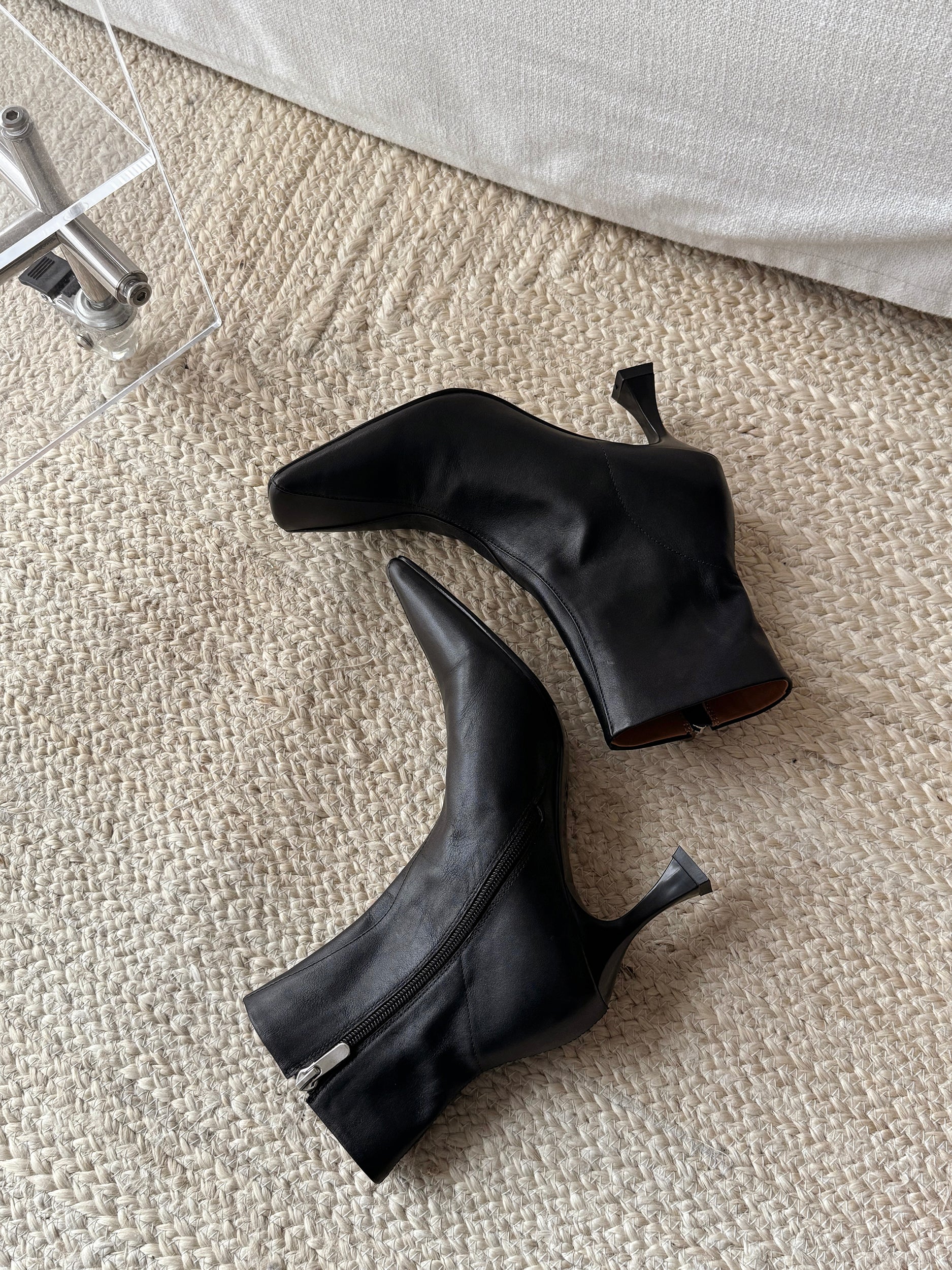 Ankle boots are designed with genuine leather, high heel, square toe and side zip up.