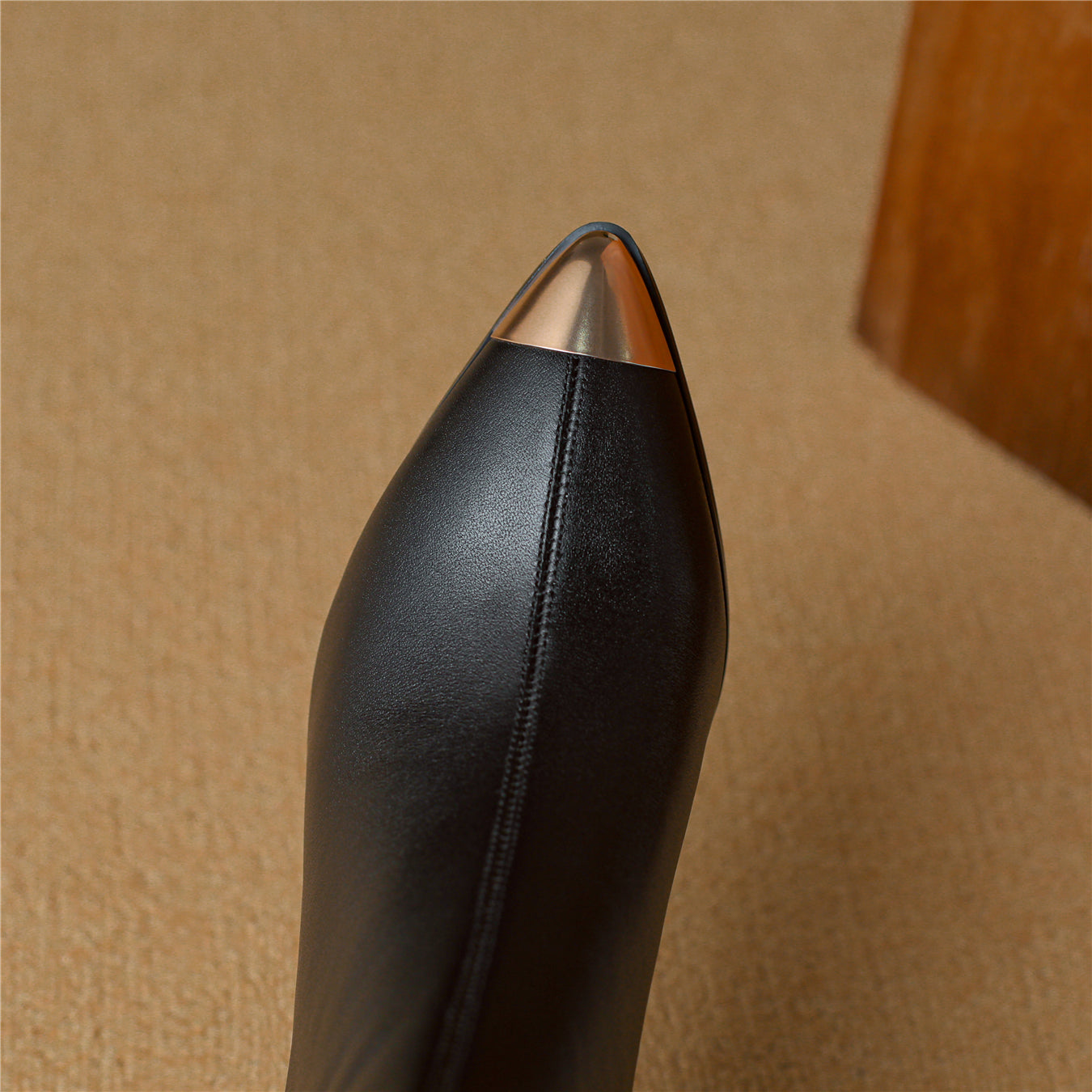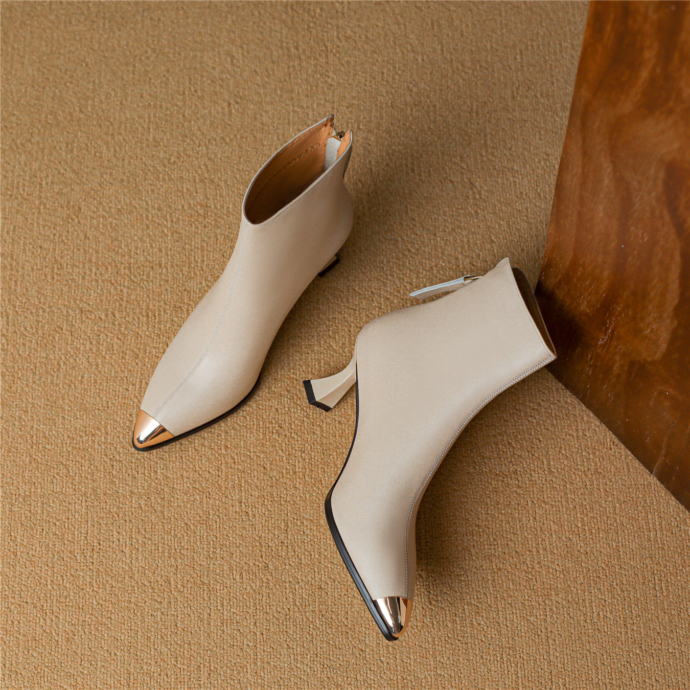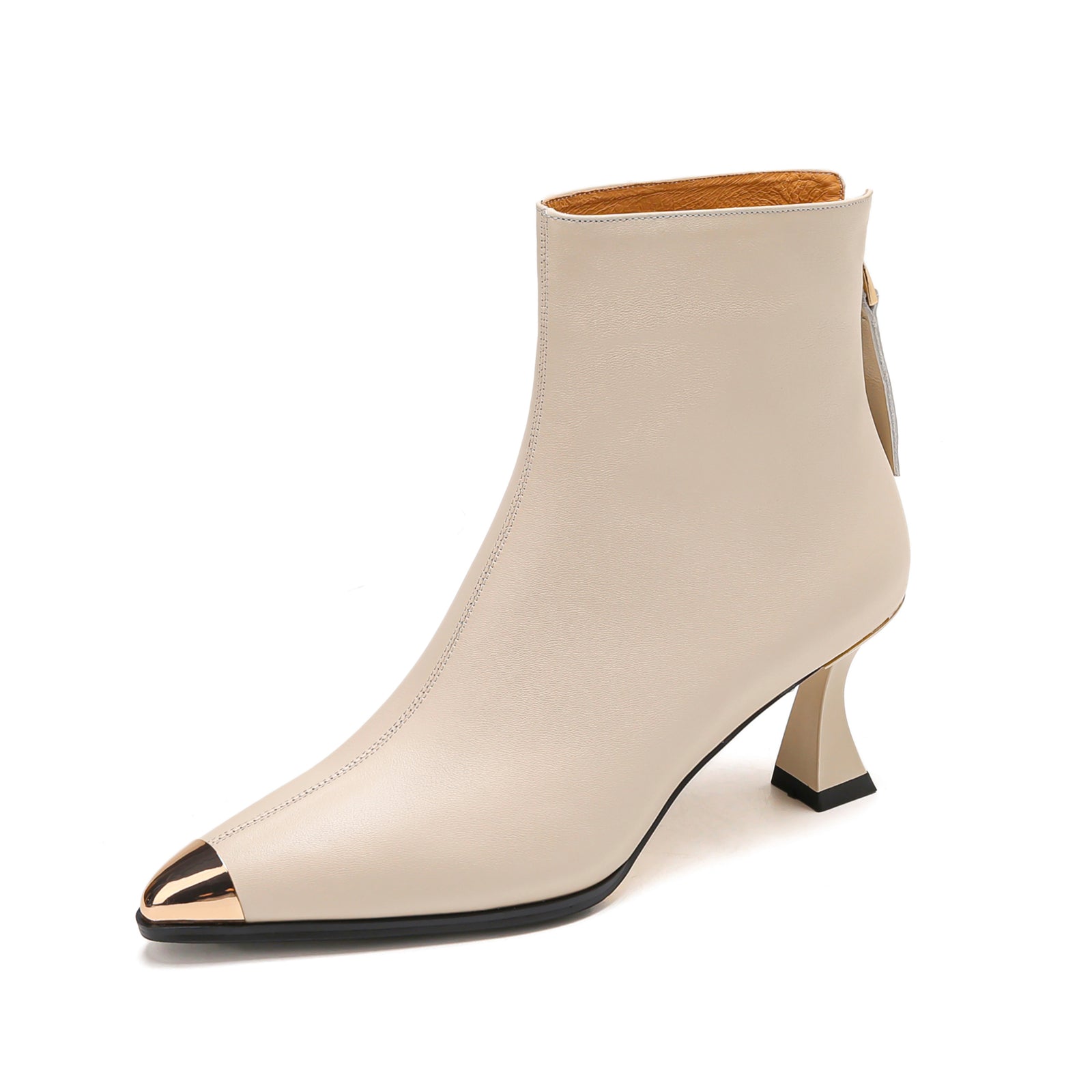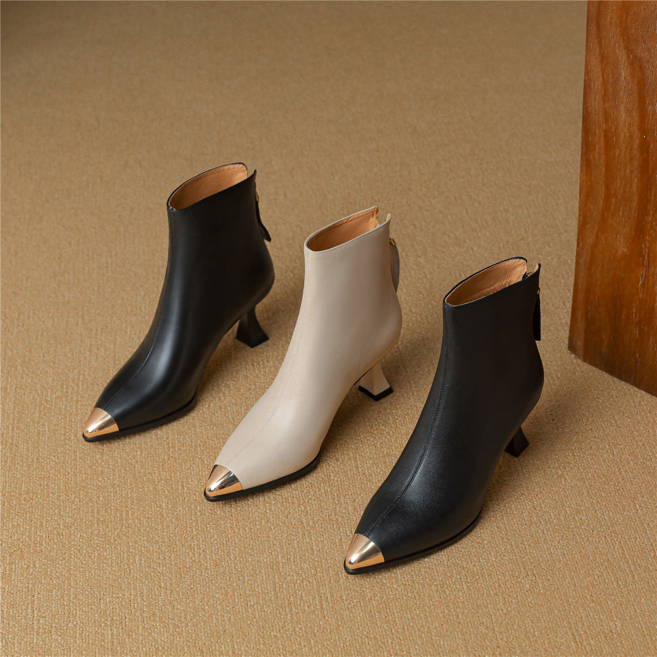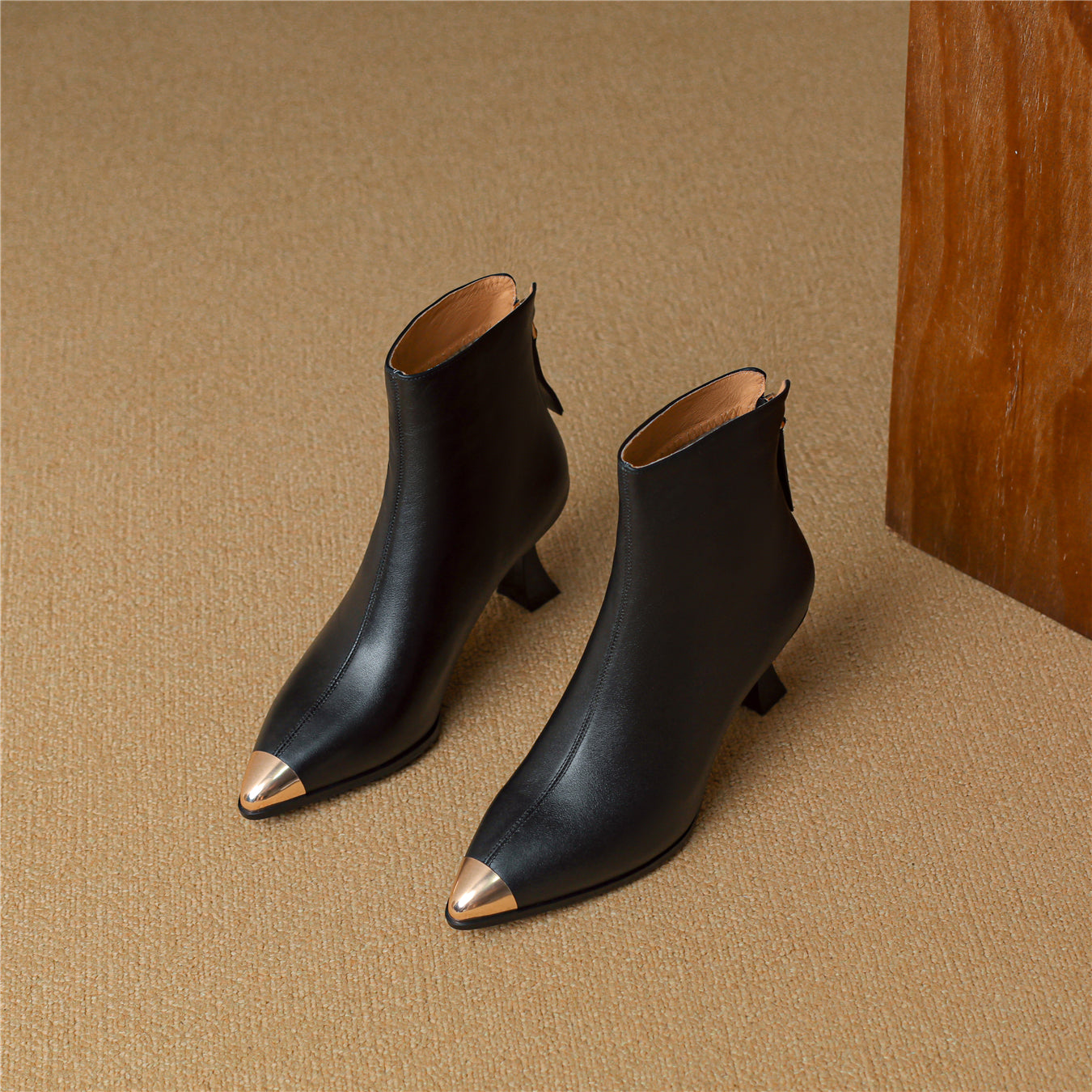 Ankle boots are designed with pointed toe, genuine leather, zip and kitten heel.
