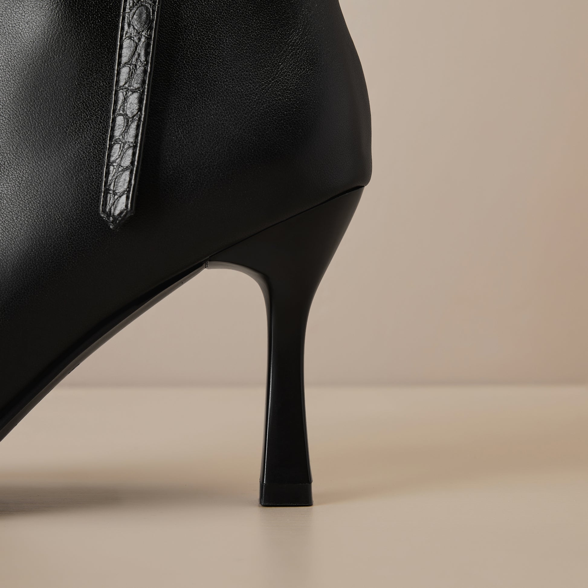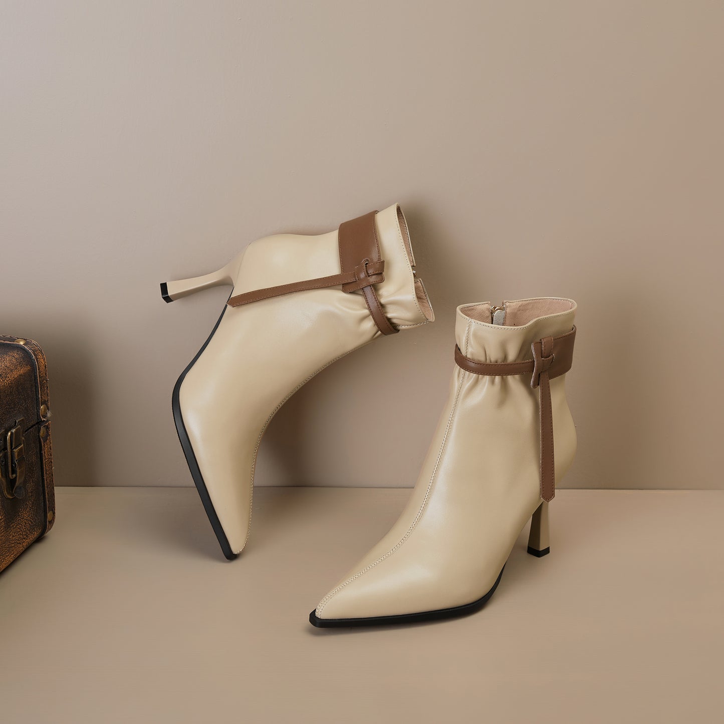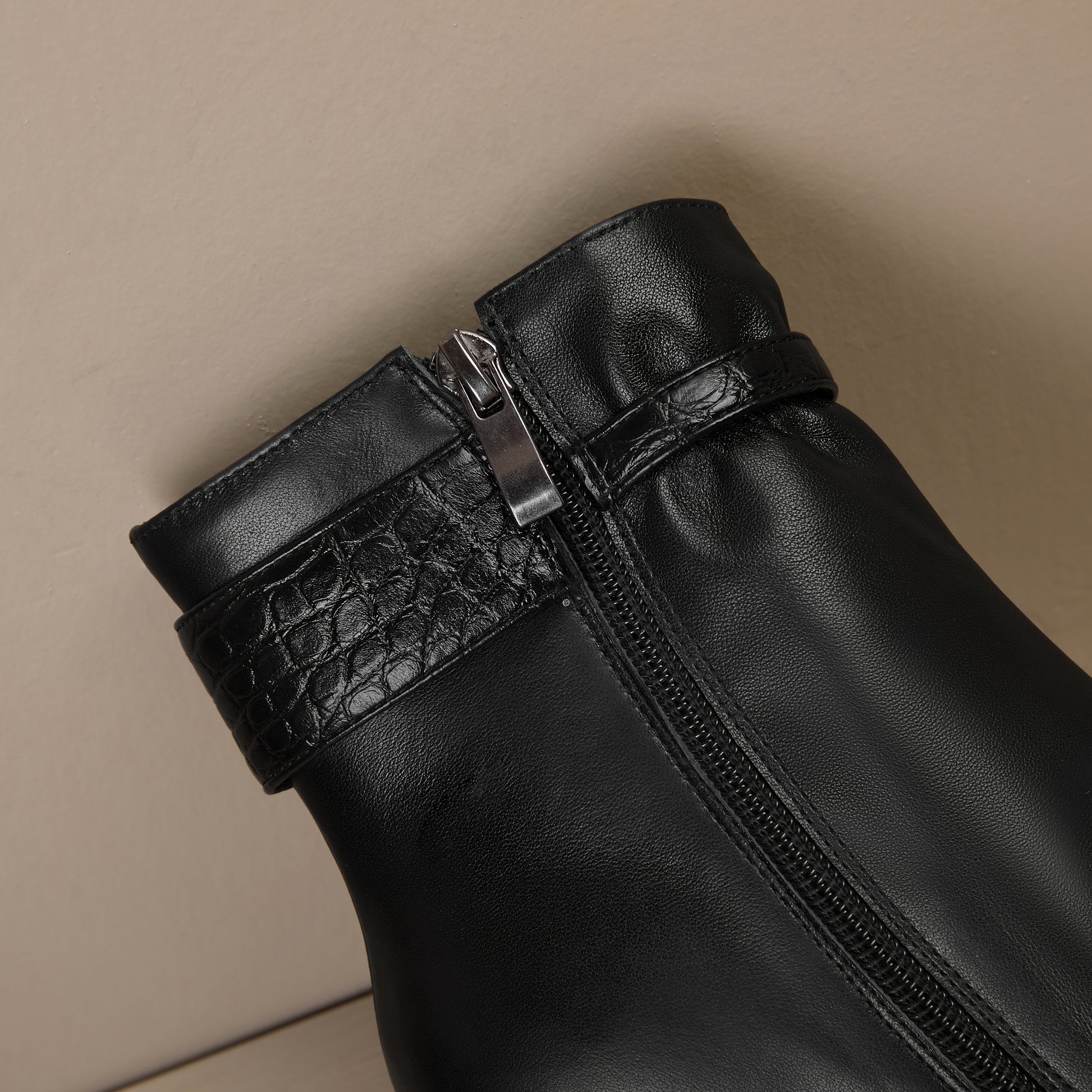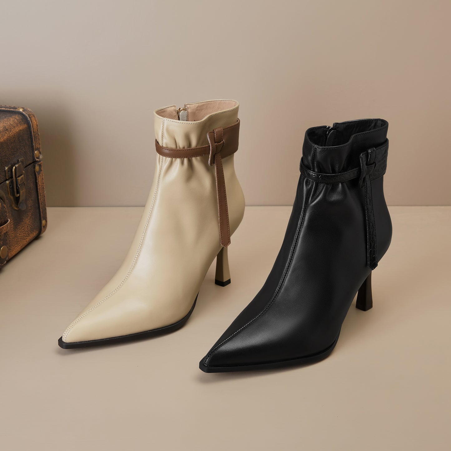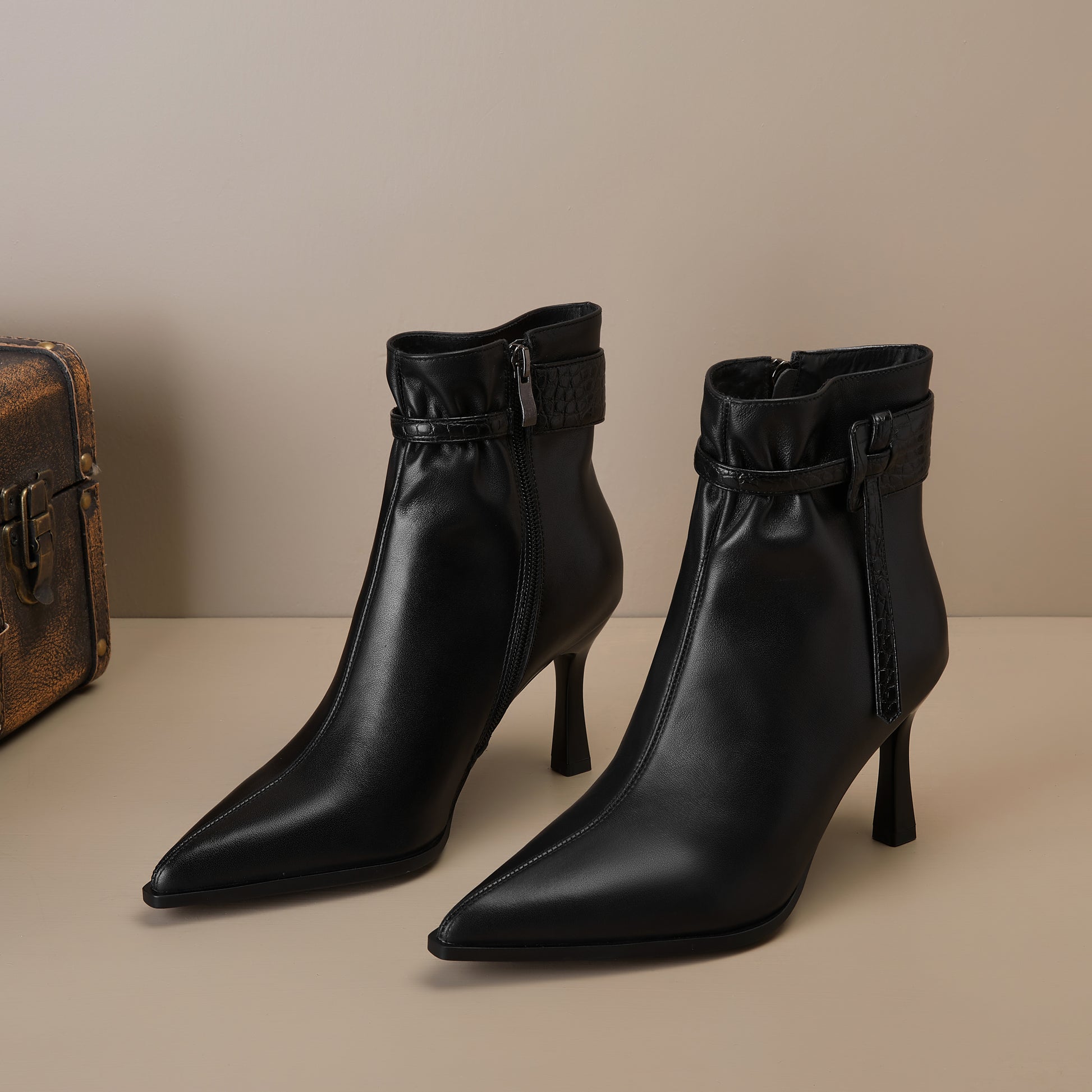 Ankle boots are designed with genuine leather, high stiletto heel and side zip to keep up with fashion trend.
