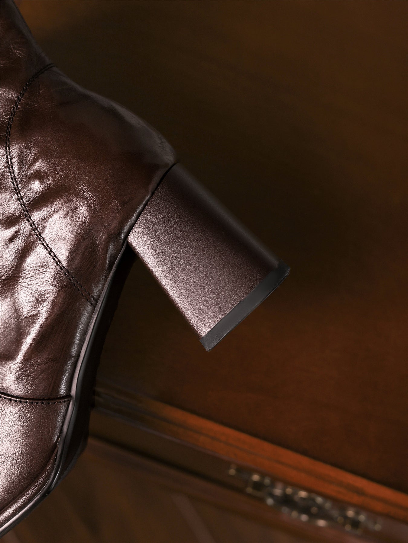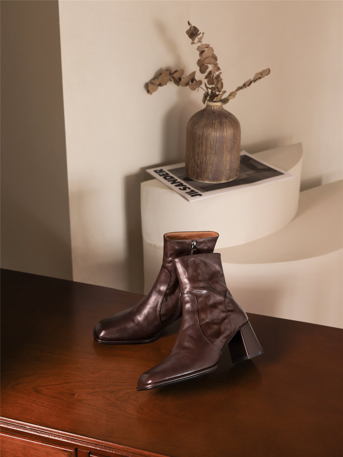 Ankle boots are designed with square toe, genuine leather, zip and block heel.
