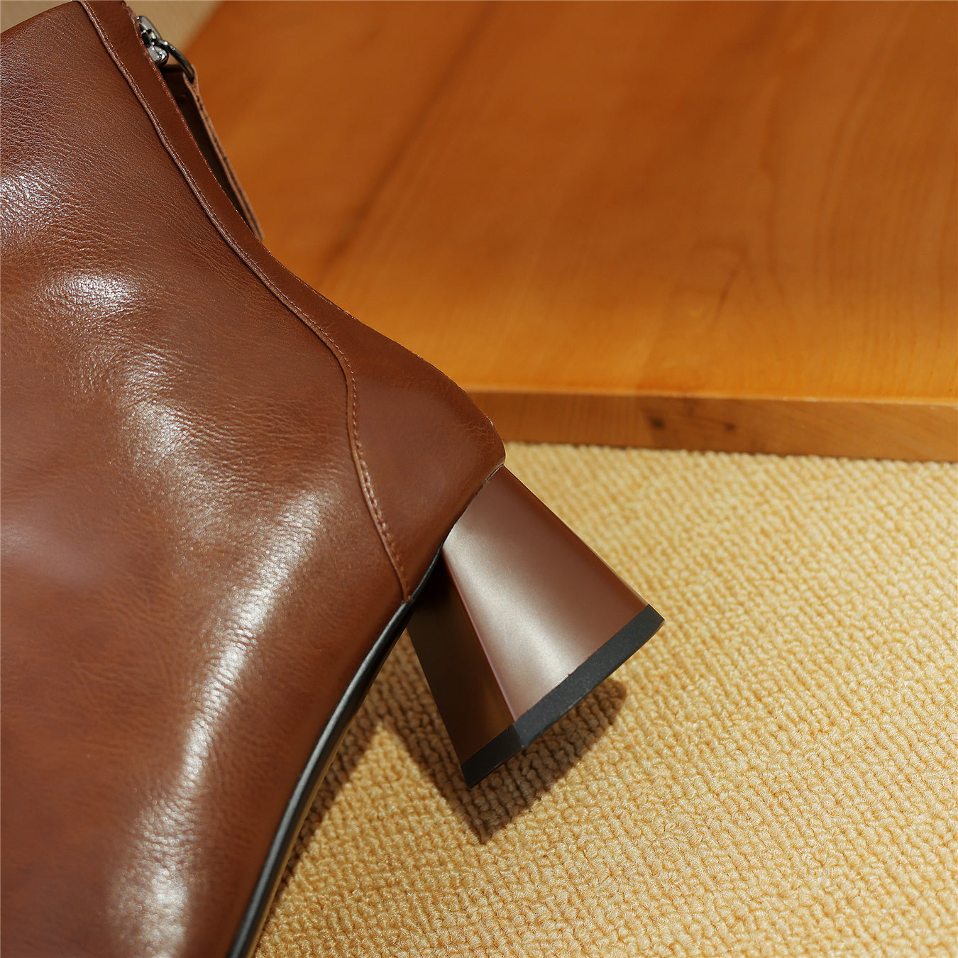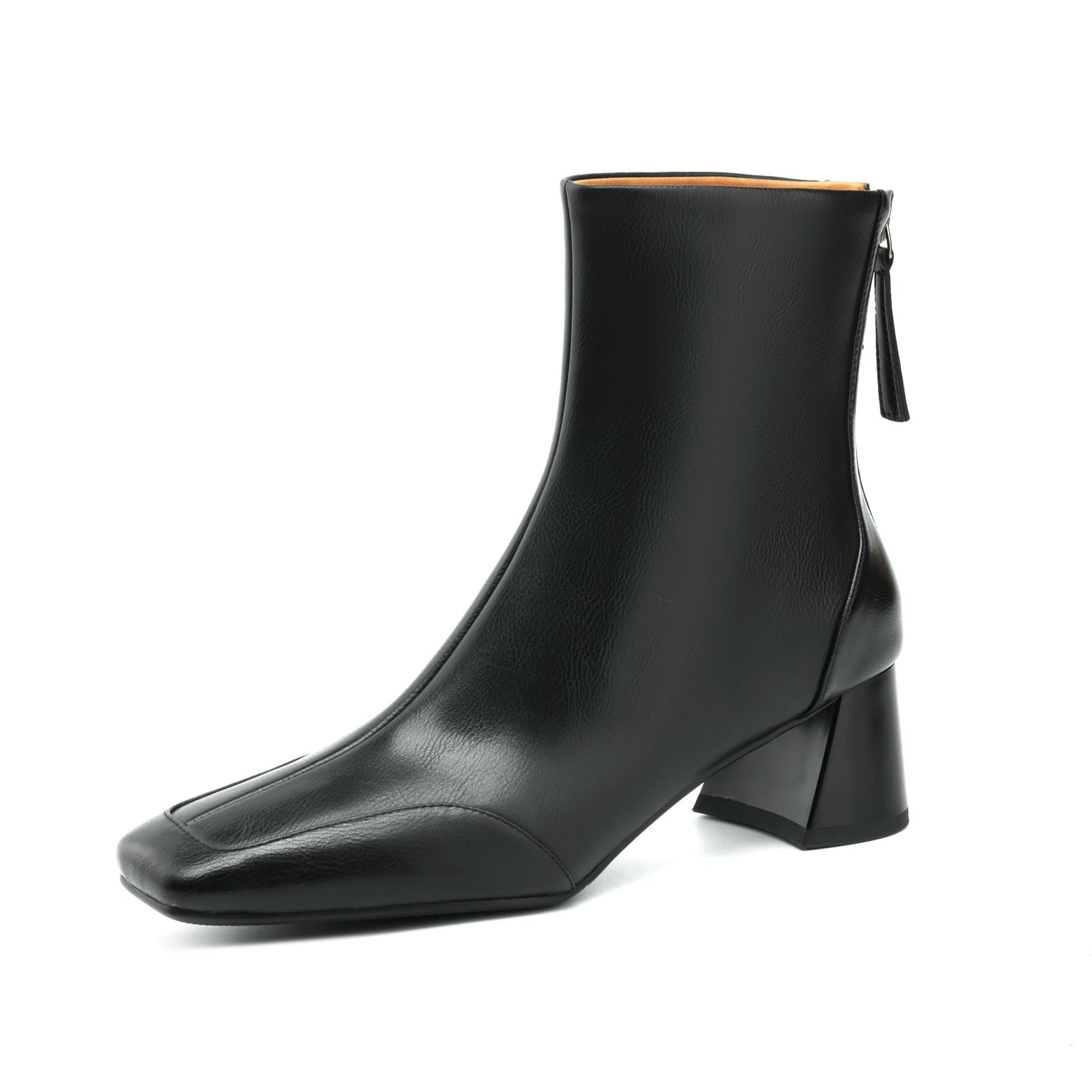 Ankle boots are designed with genuine leather, chunky heel and zip up to keep up with fashion trend.