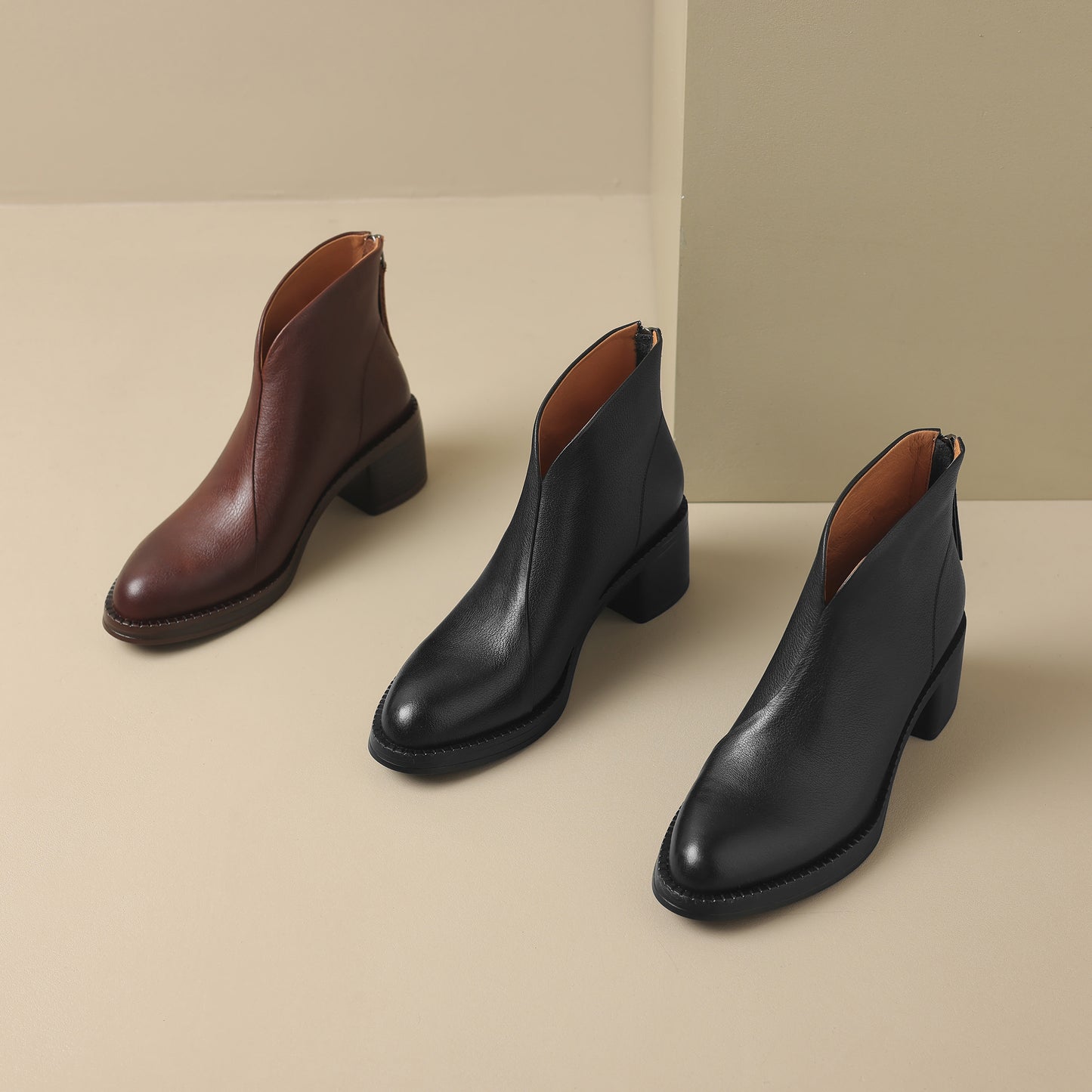 Ankle boots are designed with genuine leather, block heel and zip up to keep up with fashion trend.