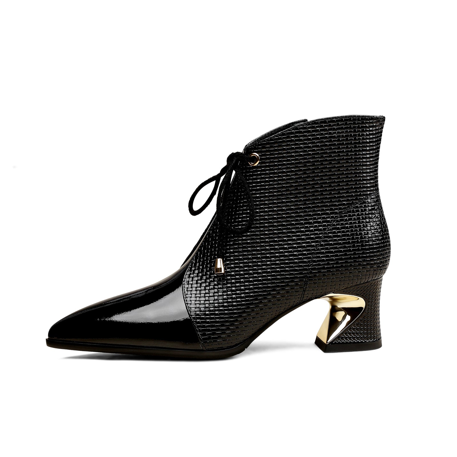 Ankle boots are designed with pointed toe, assorted leather, zip and spool heel.