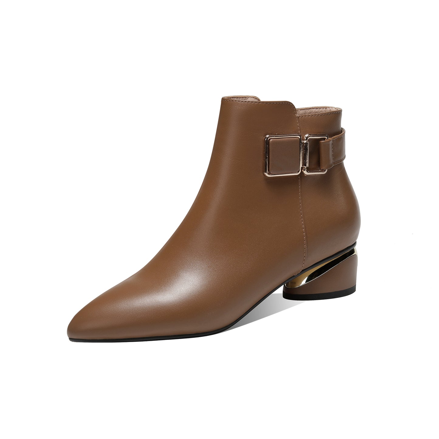 Genuine leather ankle boots designed with pointed toe, side zipper, buckle and chunky heels can go with almost all your outfits.