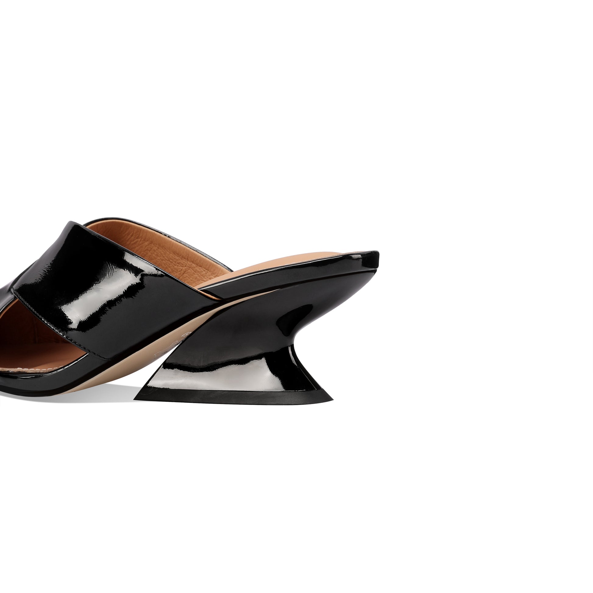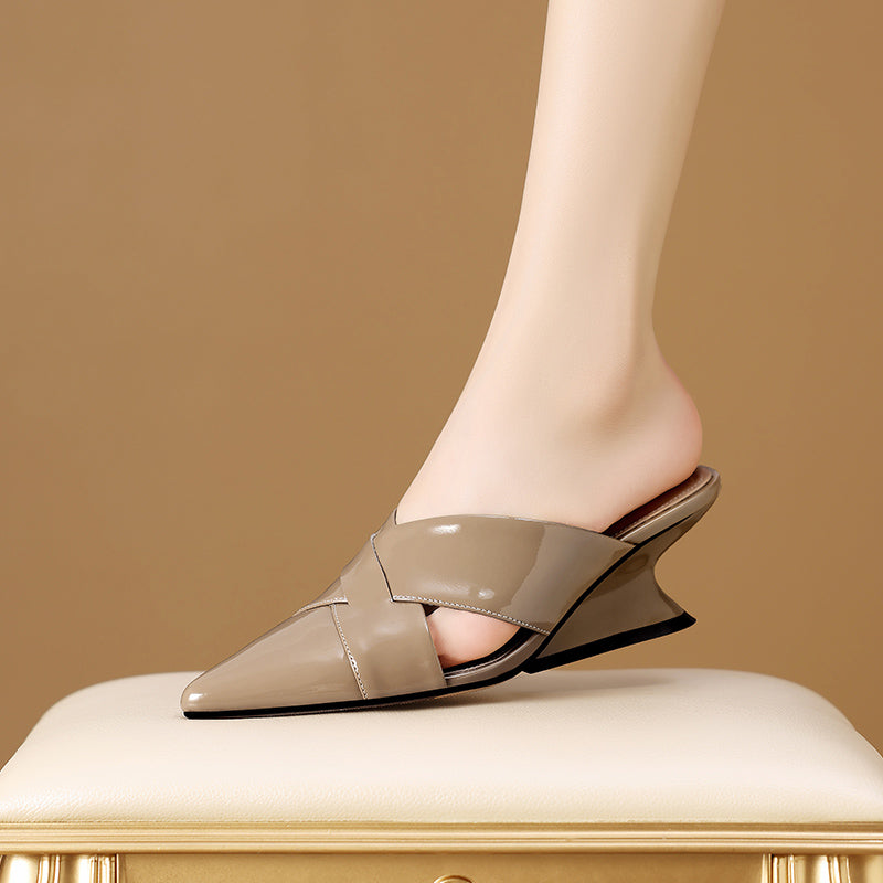 Patent leather slippers designed with pointed toe and unique chunky heels to keep up with fashion trend.
