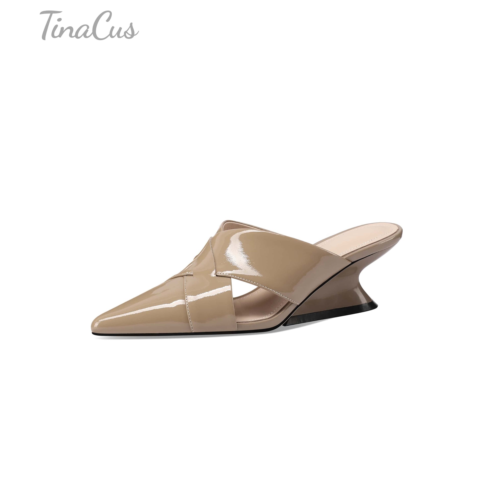 TinaCus Women's Pointed Toe Glossy Patent Leather Handmade Mid Heels Chic Sandal Slippers