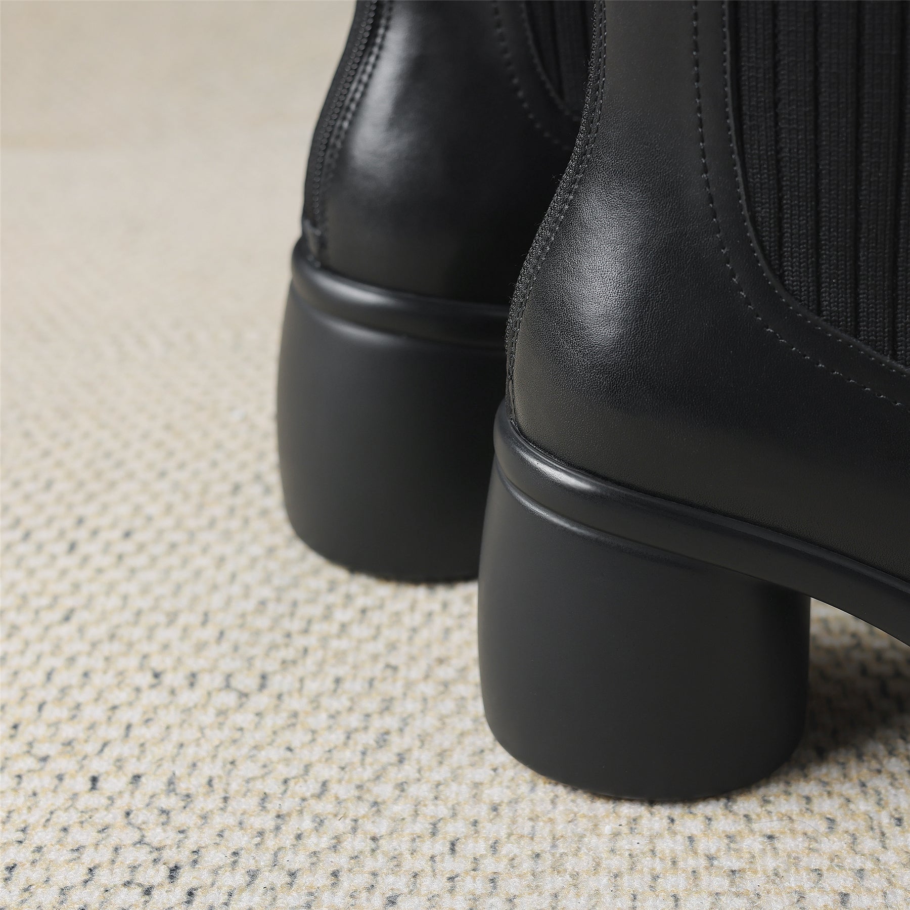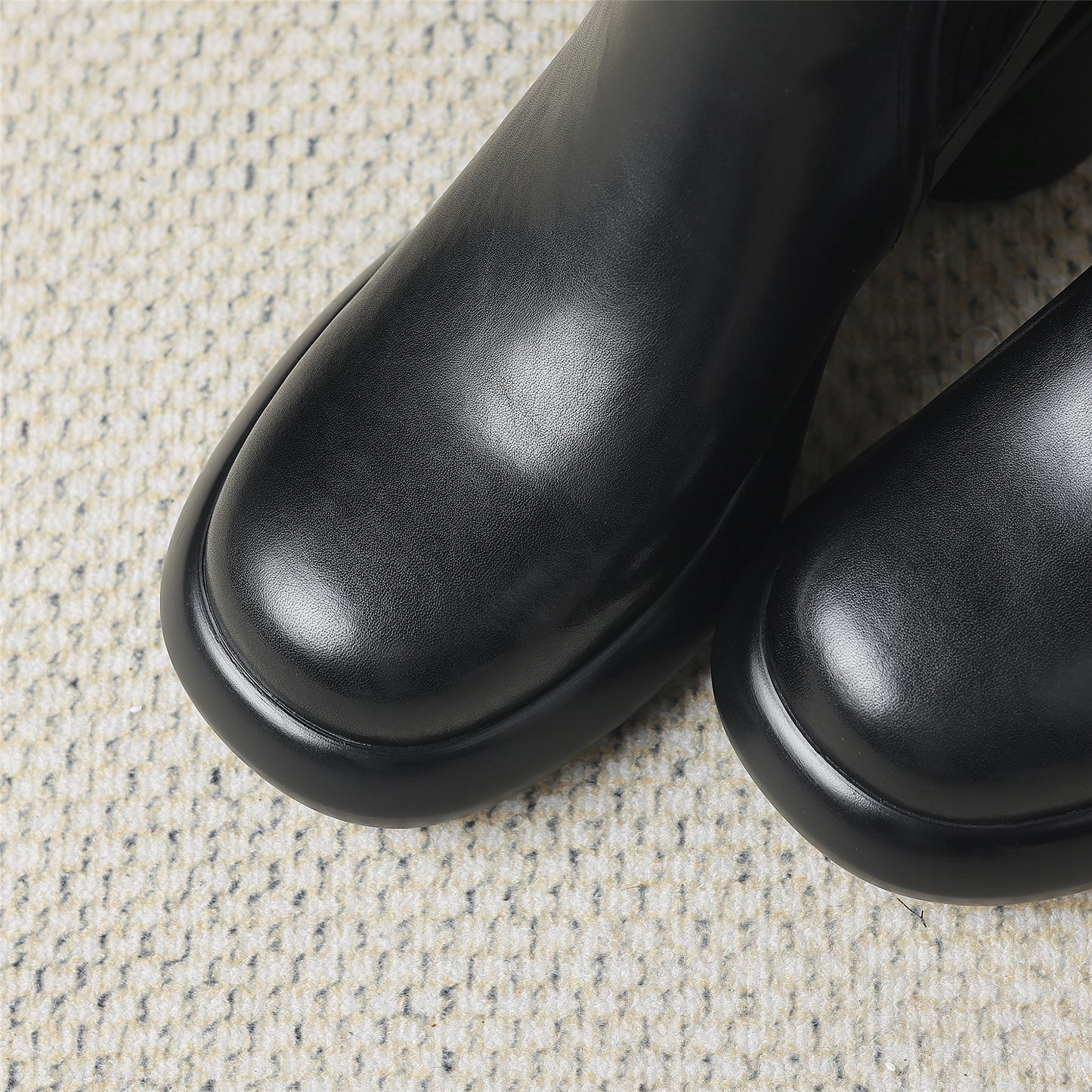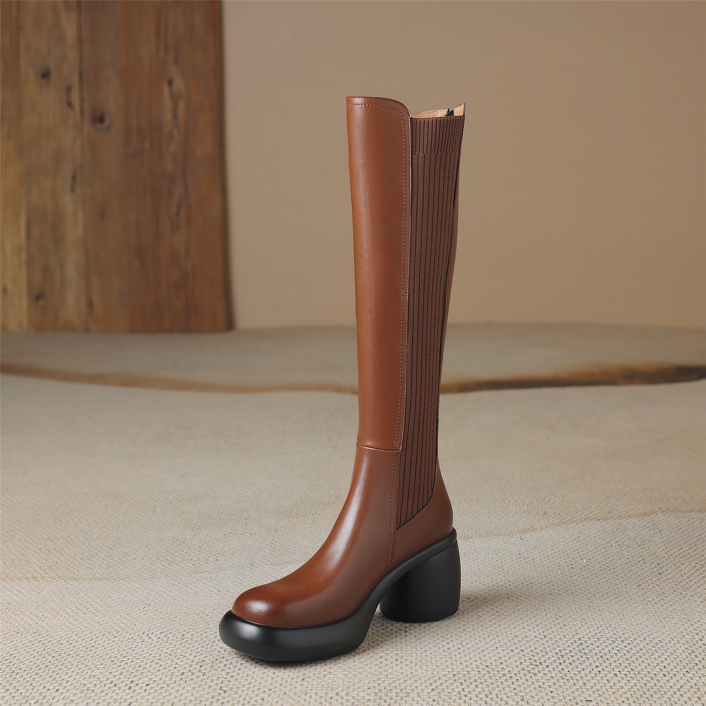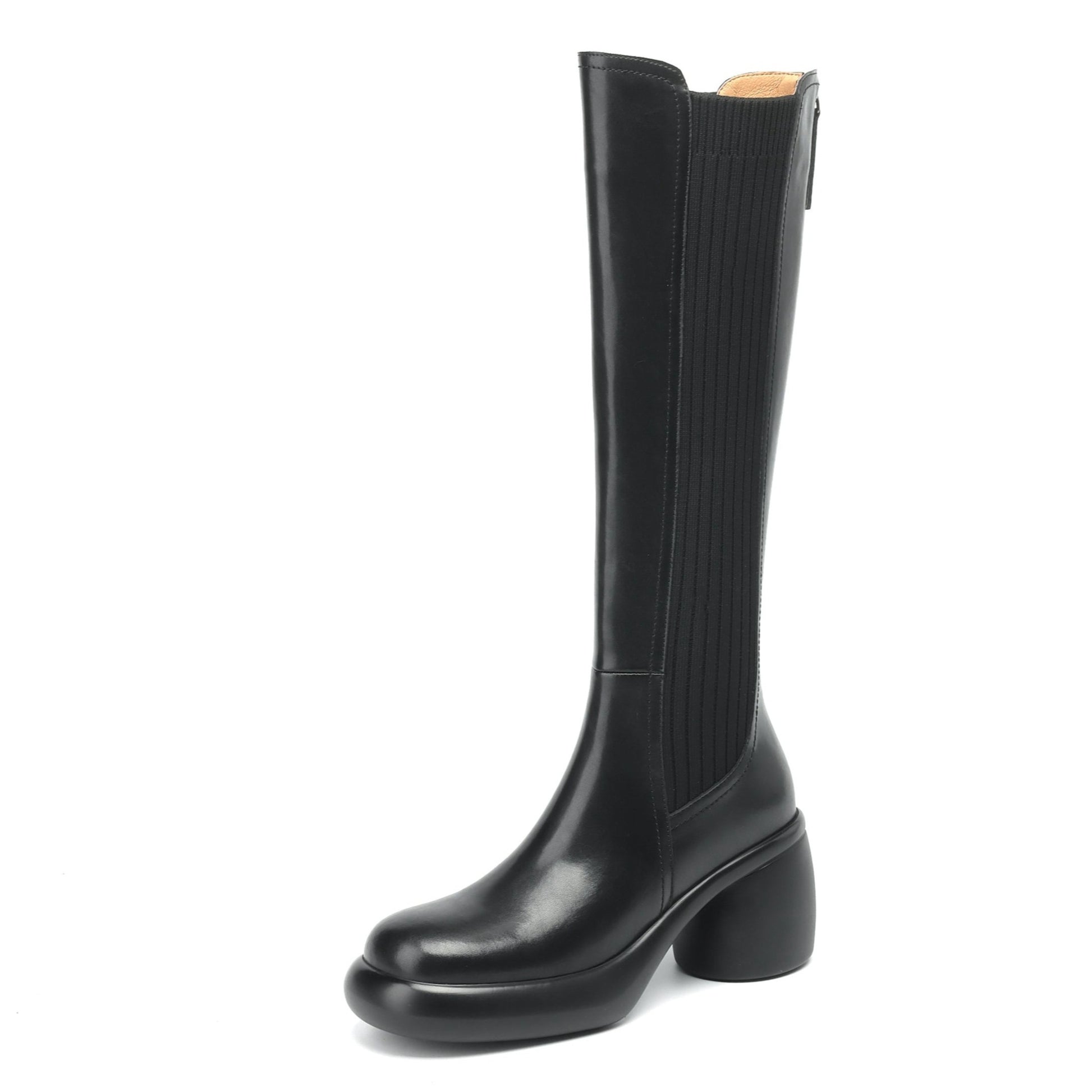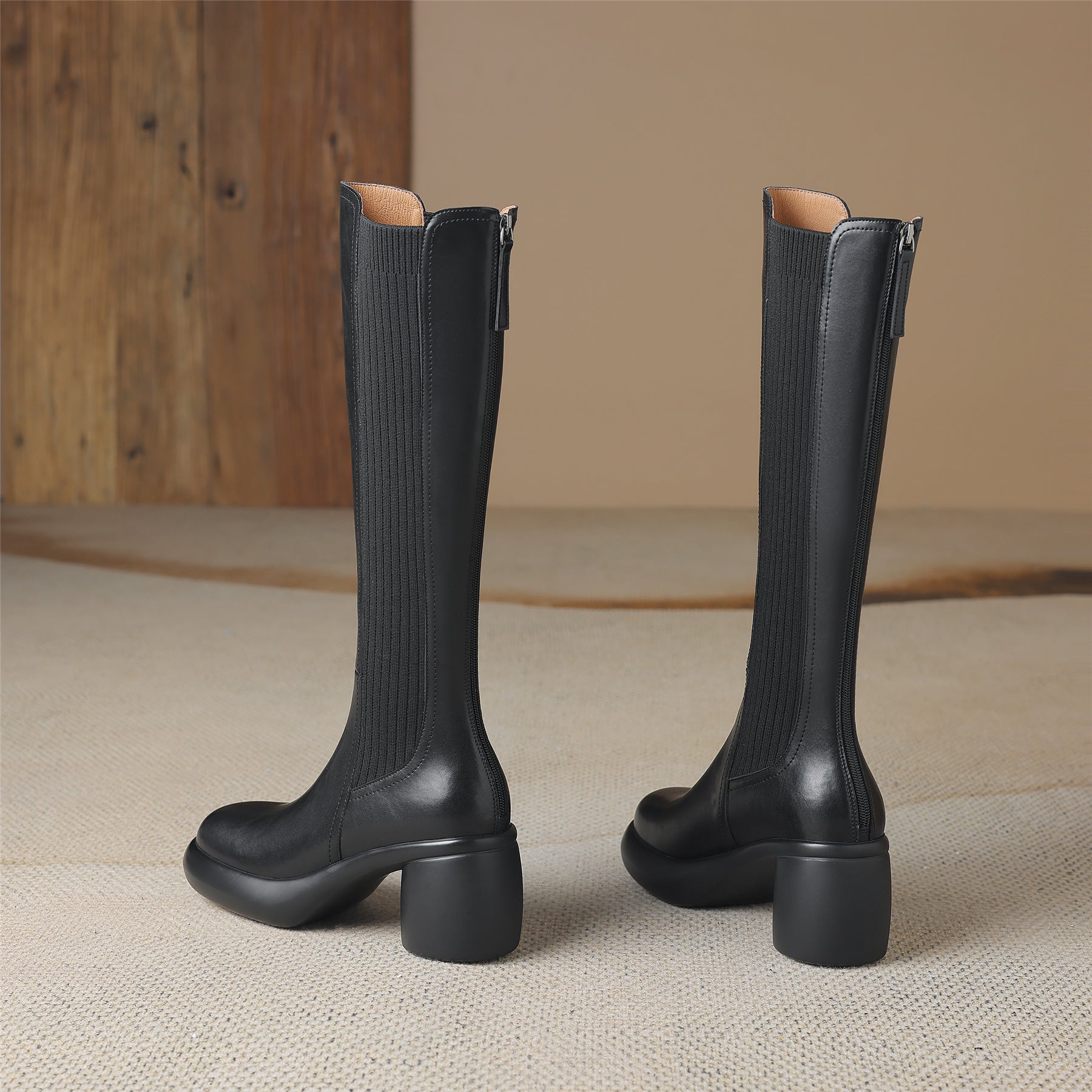 TinaCus Women's Round Toe Genuine Leather Handmade Block Heel Back Zip Knee High Boots