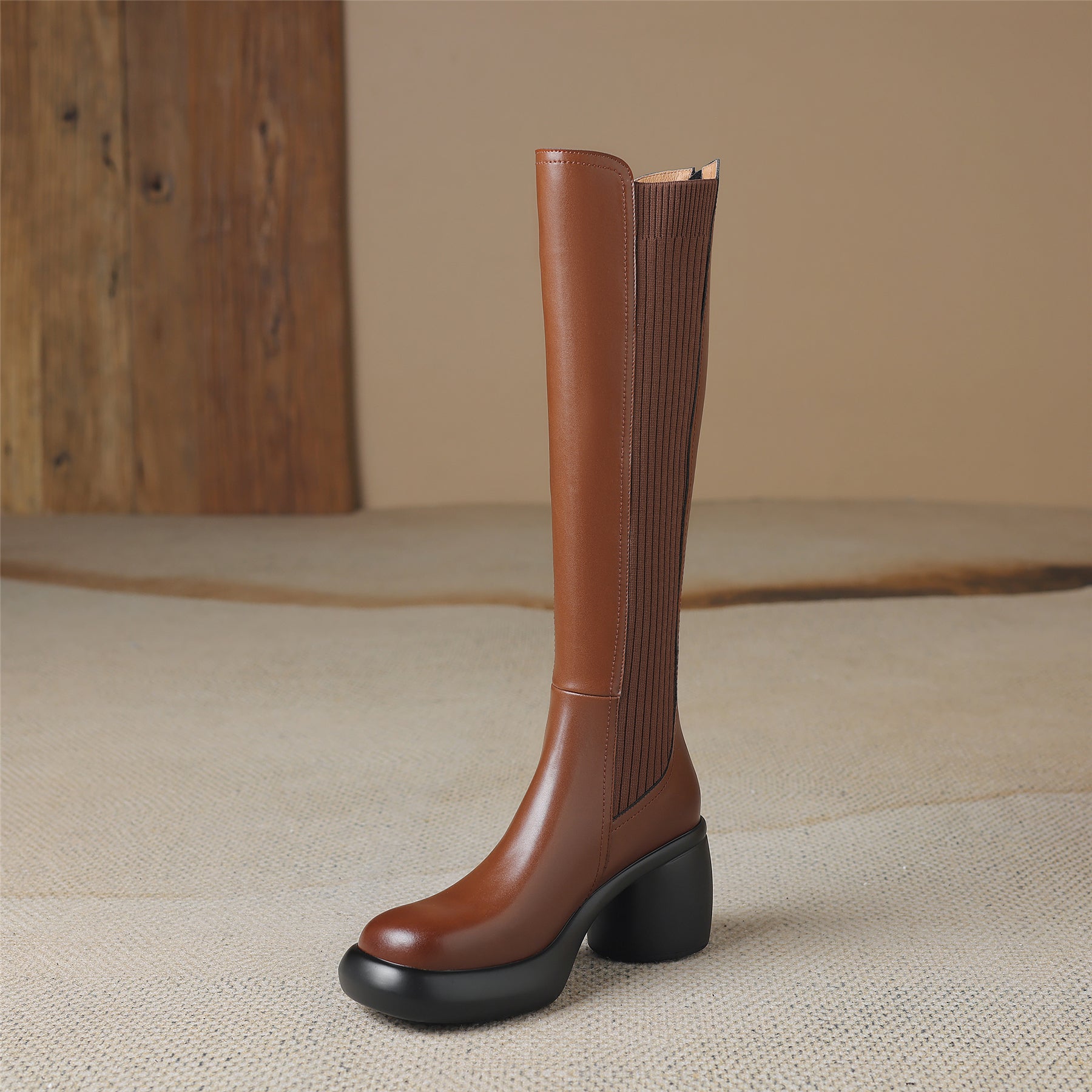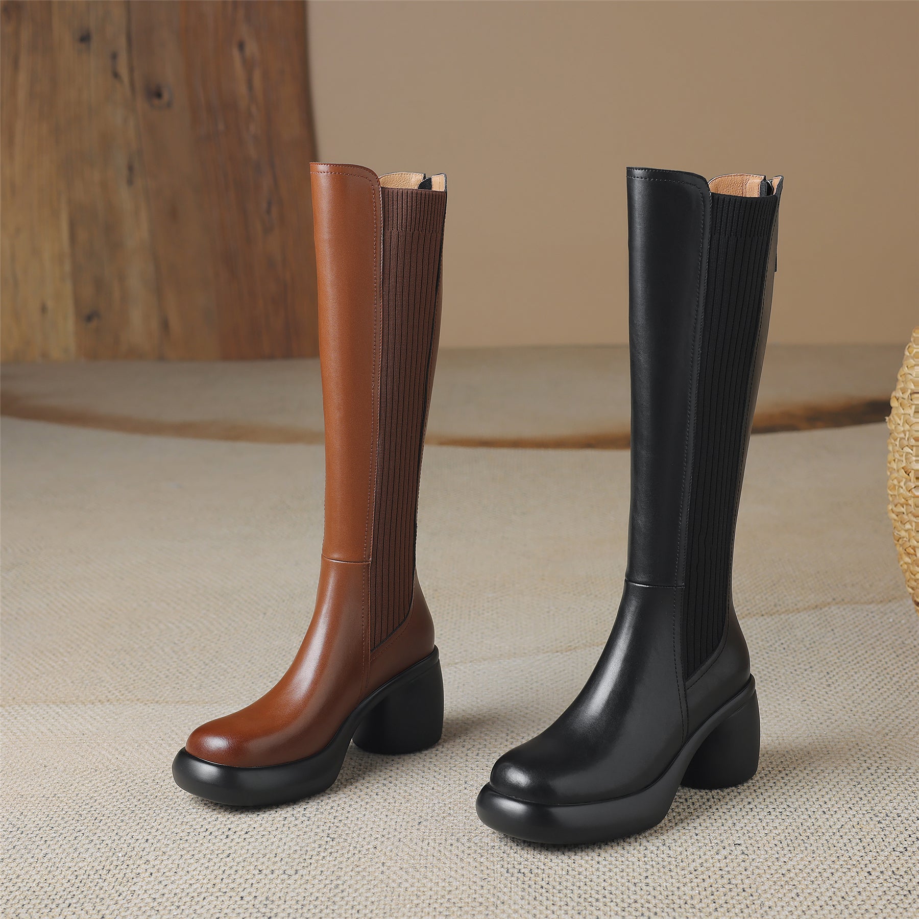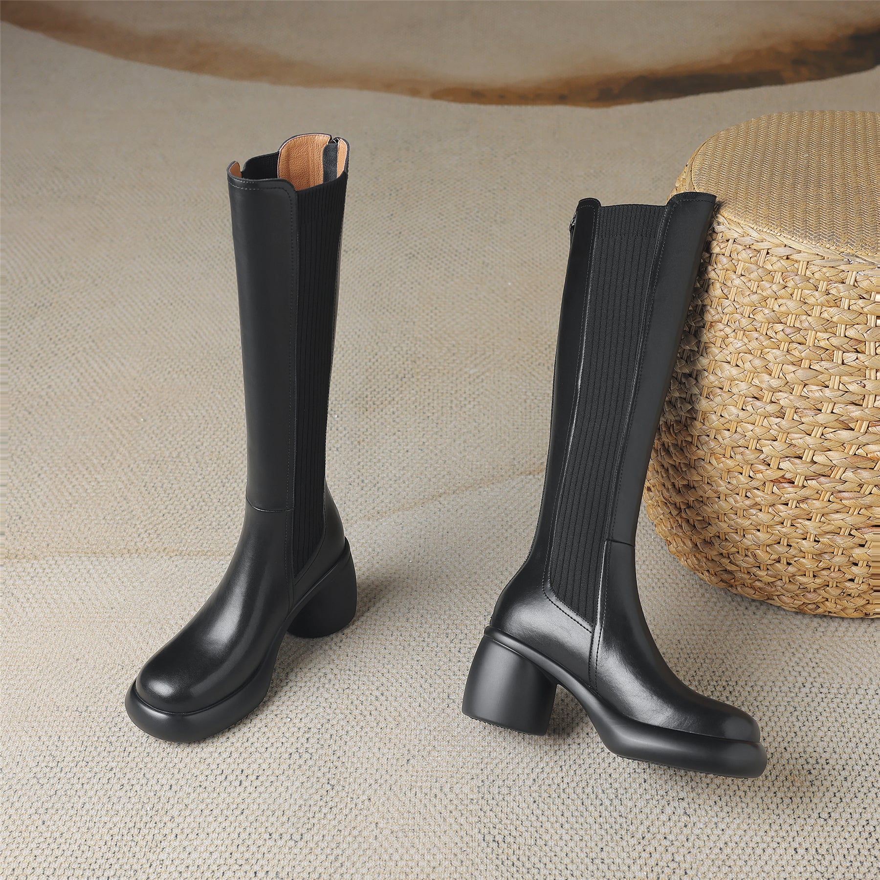 Knee high boots are designed with genuine leather, chunky heel and zip up to keep up with fashion trend.