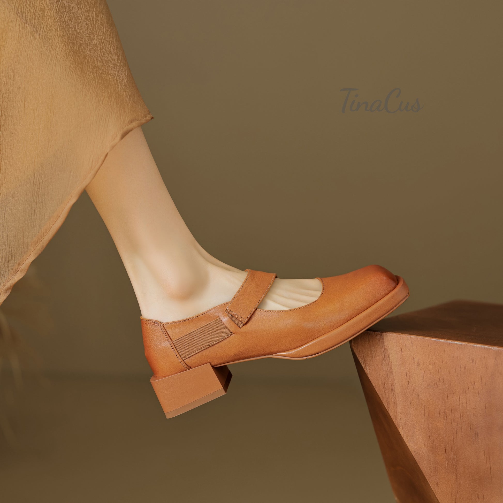 TinaCus Women's Square Toe Handmade Low Heels Genuine Leather Retro Loafers Shoes