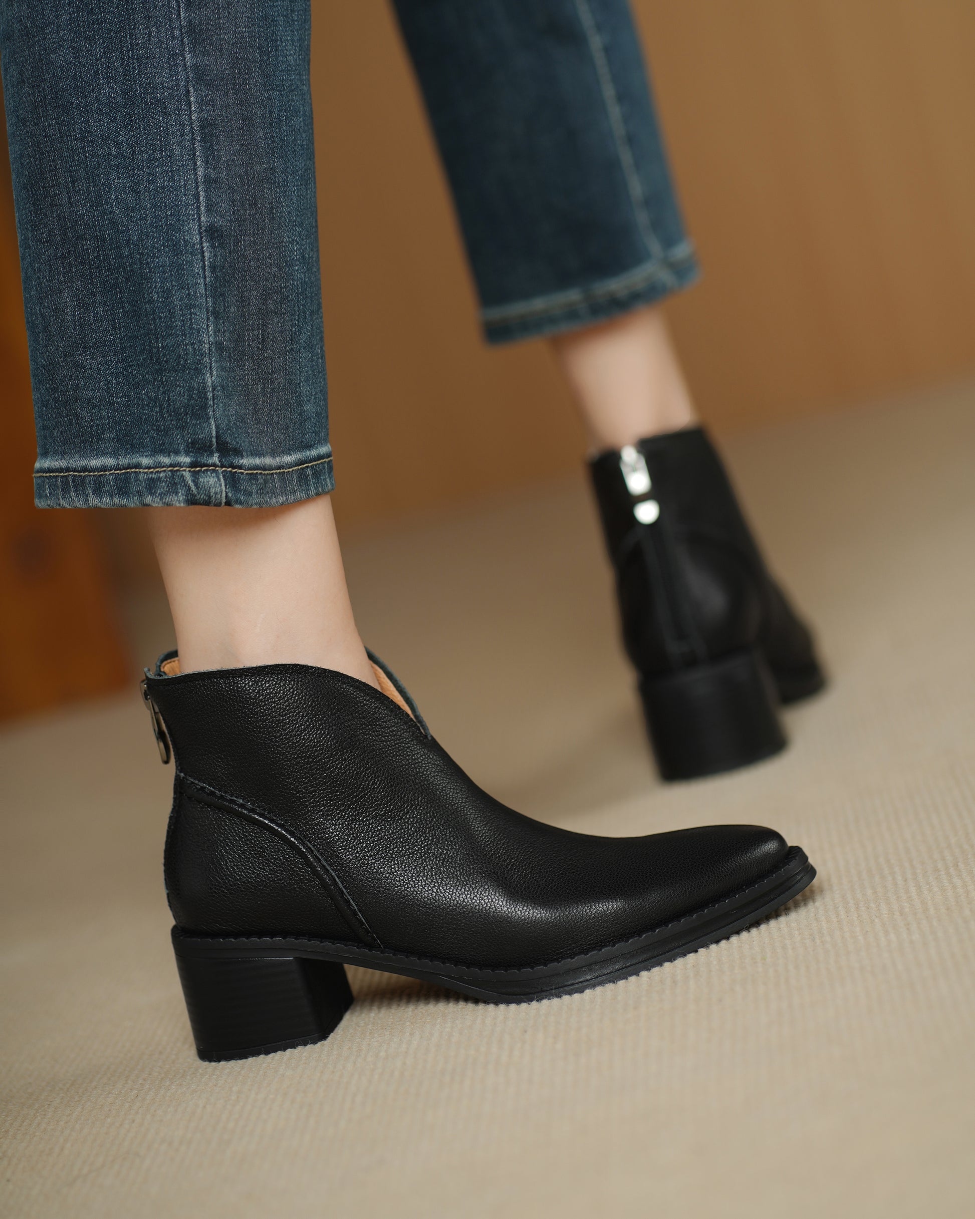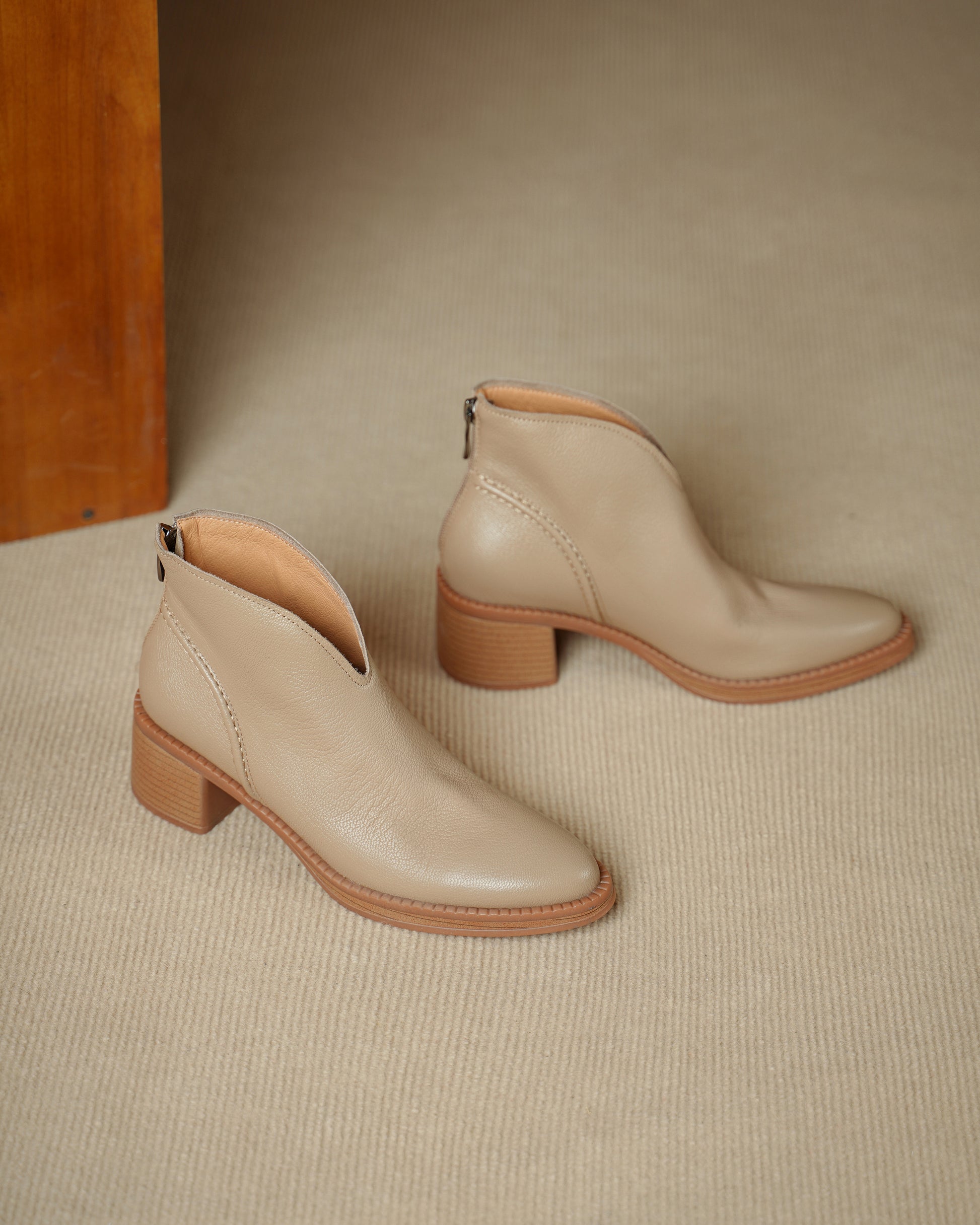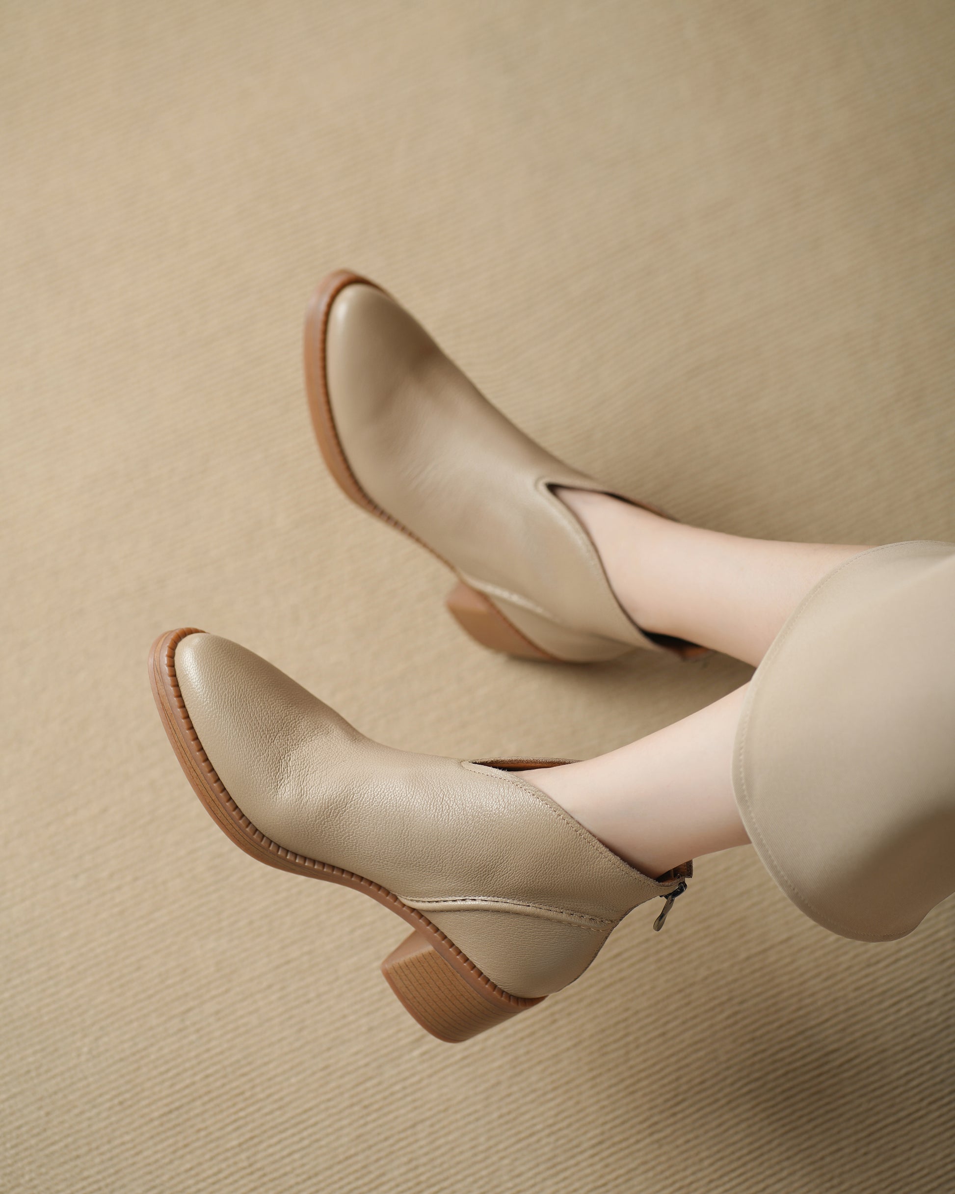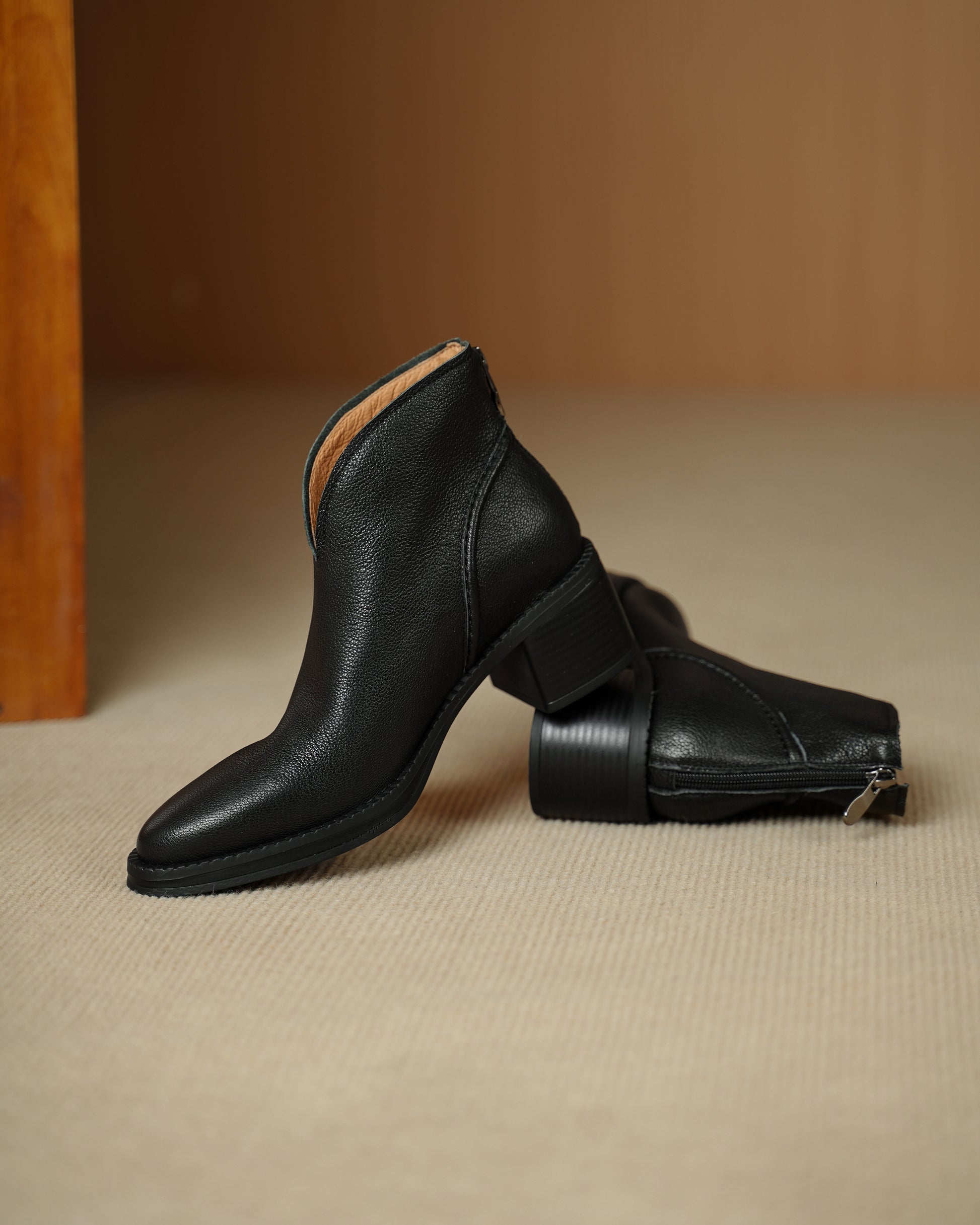 Genuine Leather ankle booties with v-cutout, round toe, stacked heel, solid color, back zip.