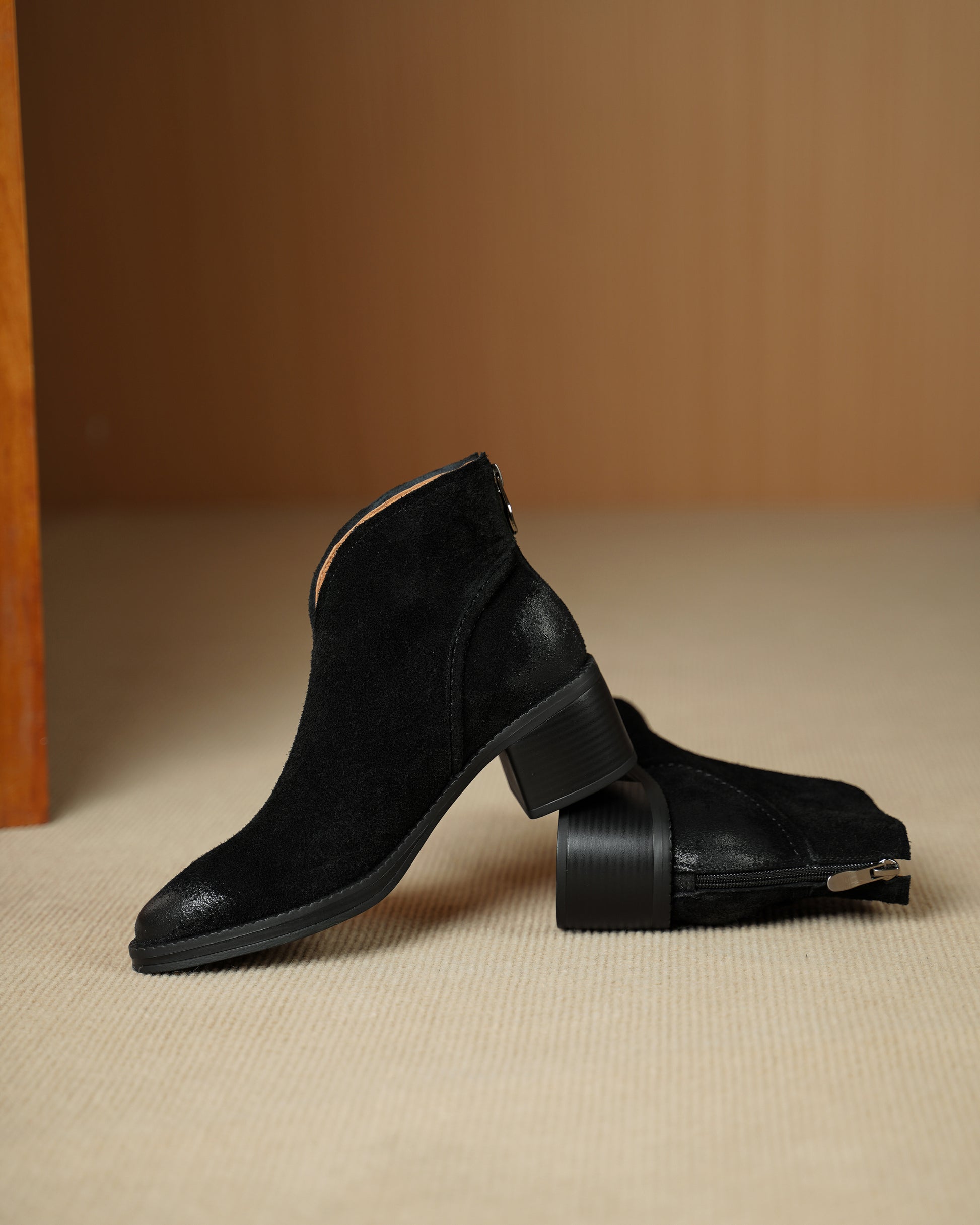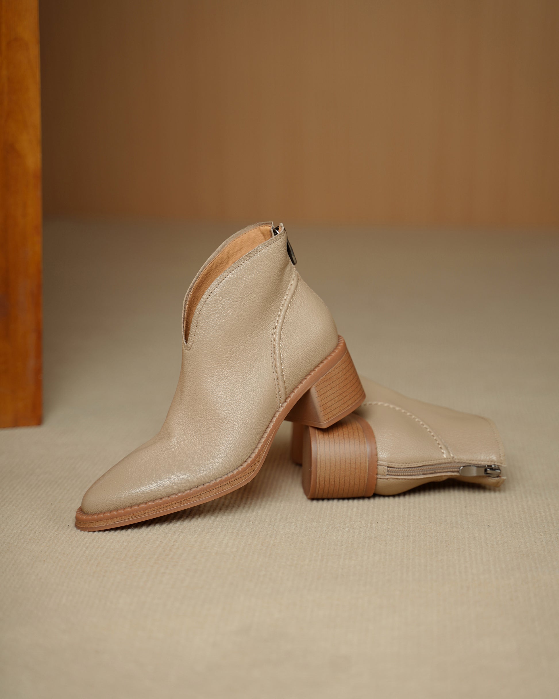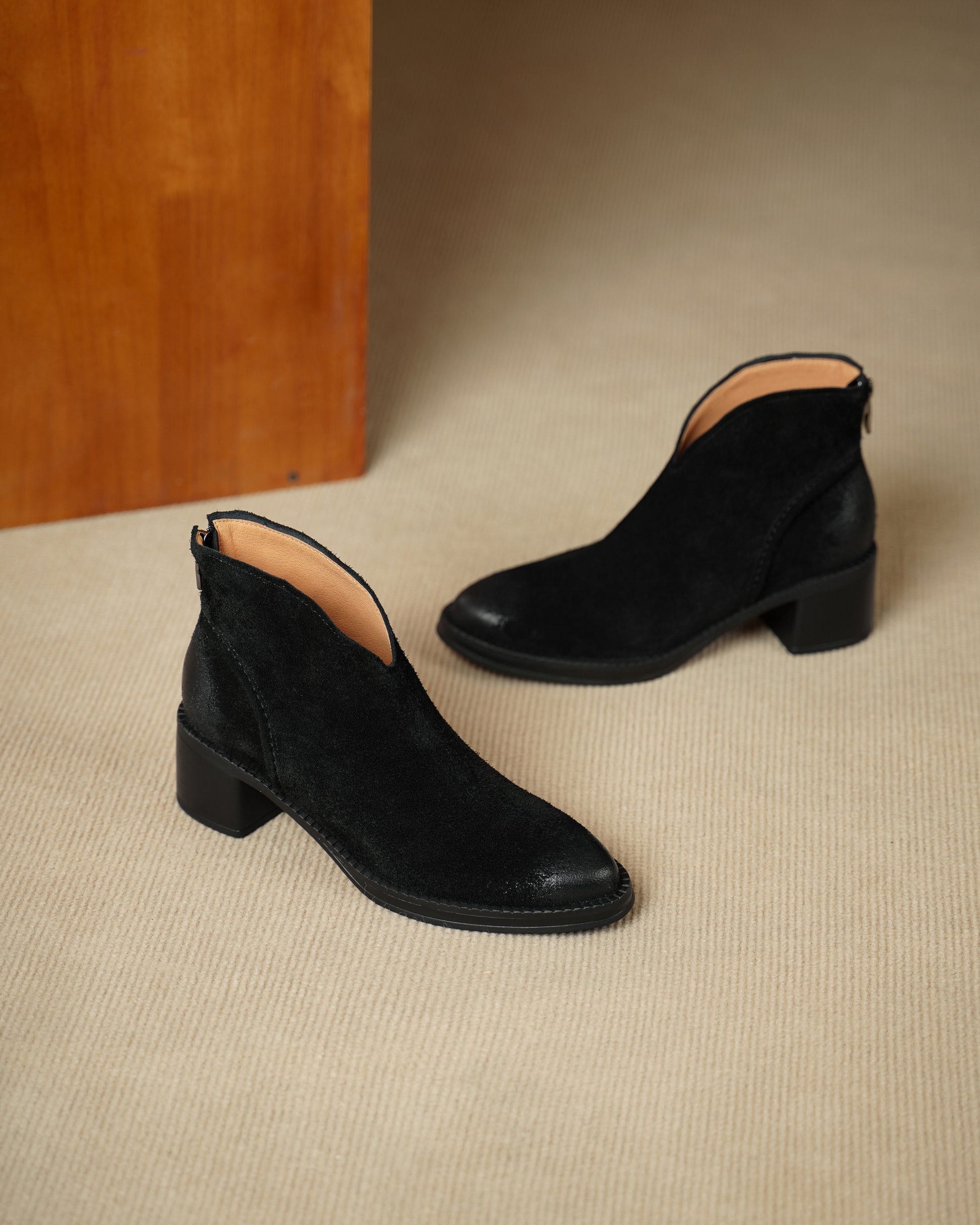 Genuine Leather ankle booties with v-cutout, round toe, stacked heel, solid color, back zip.