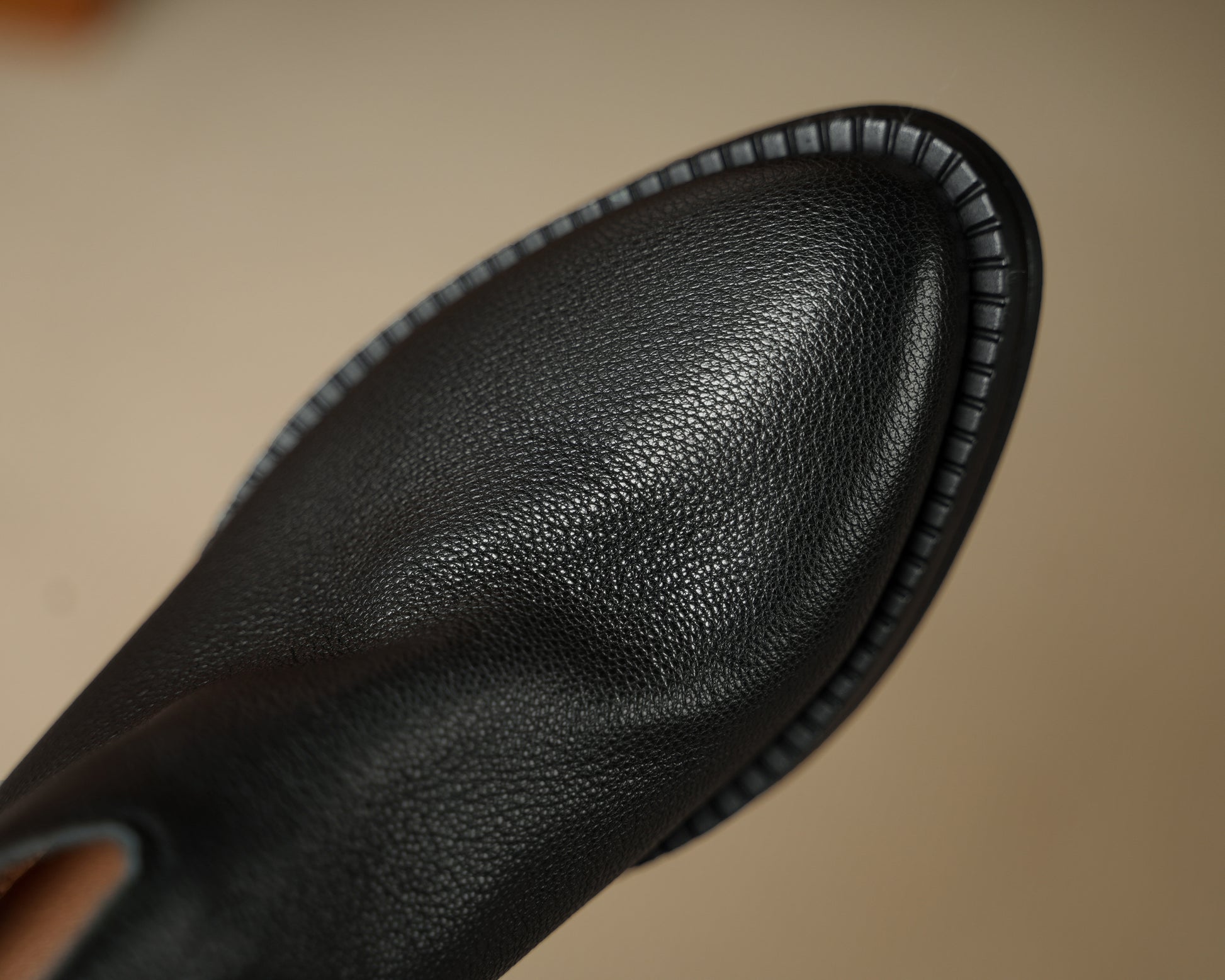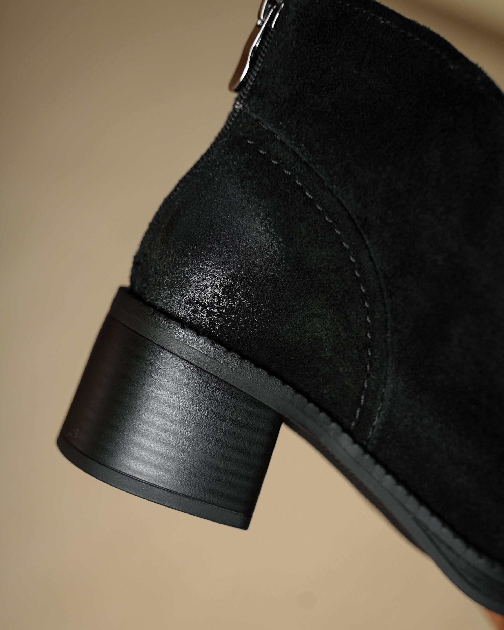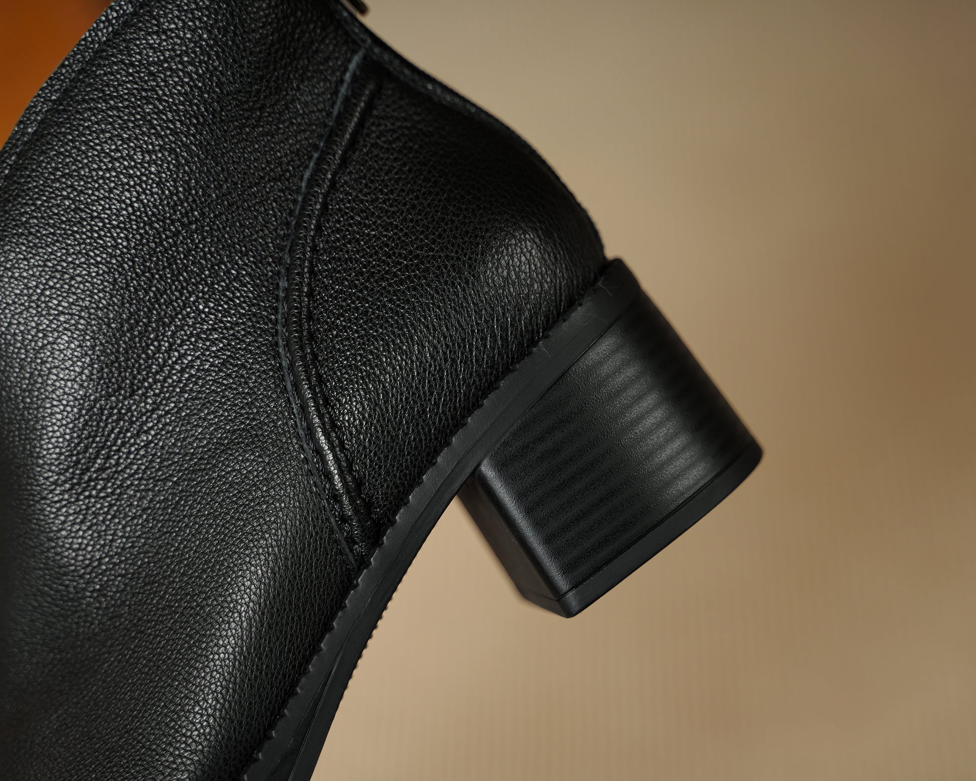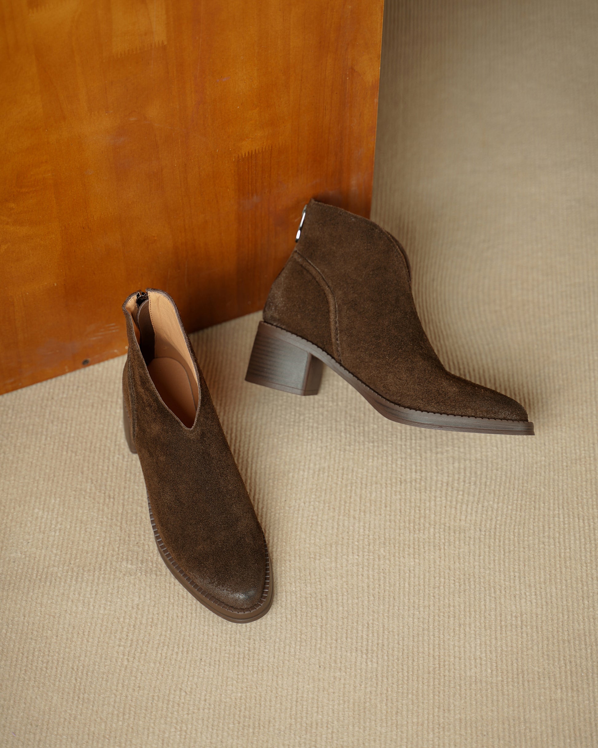 Genuine Leather ankle booties with v-cutout, round toe, stacked heel, solid color, back zip.