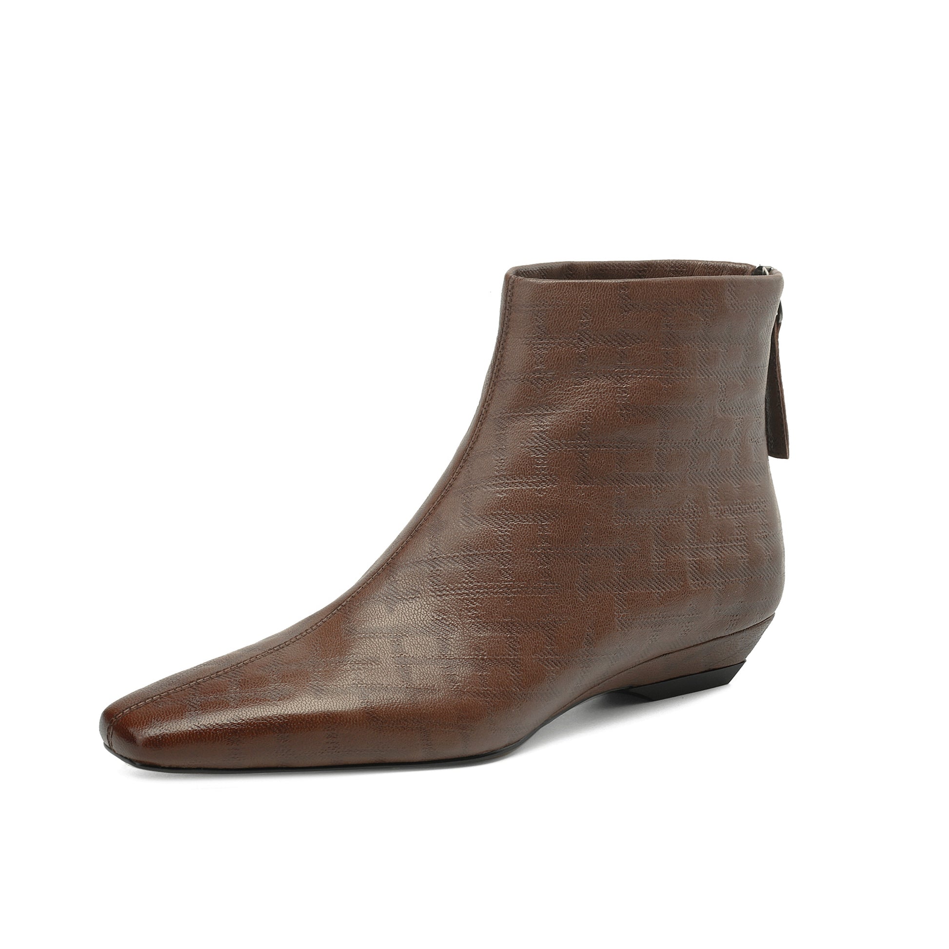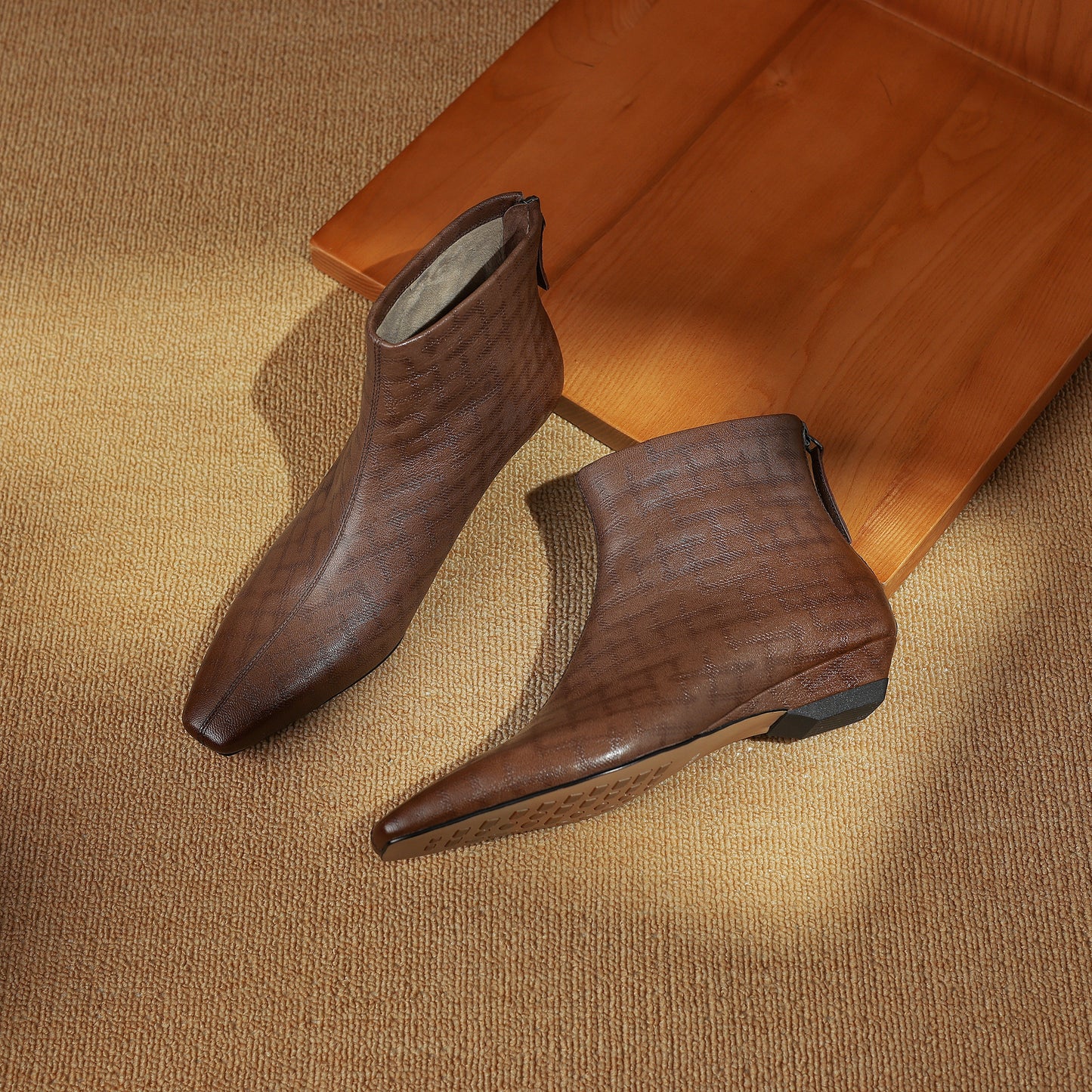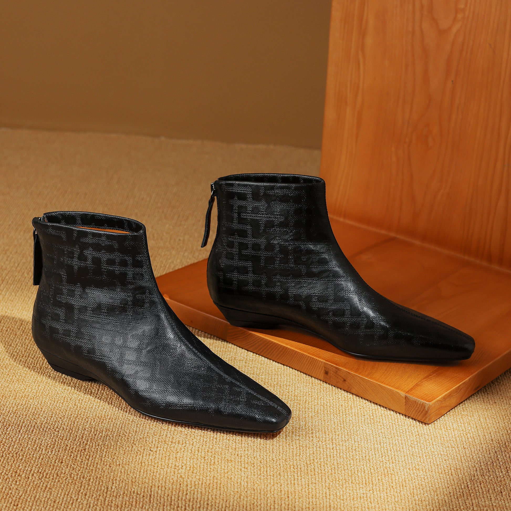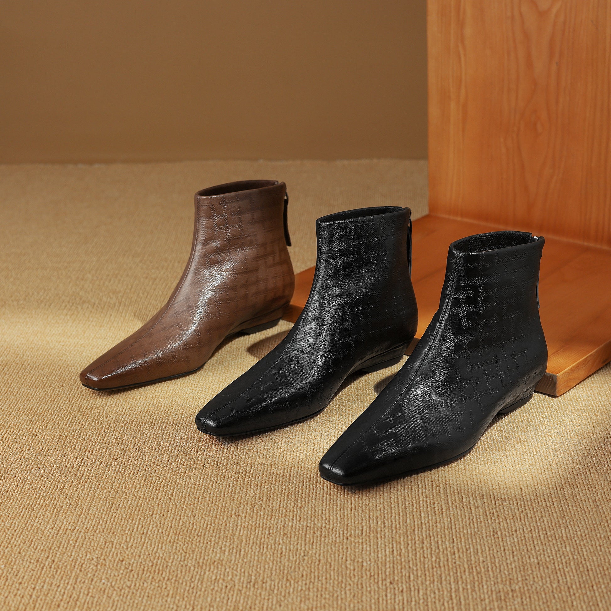 Ankle boots are designed with genuine leather, chunky heel and zip up to keep up with fashion trend.