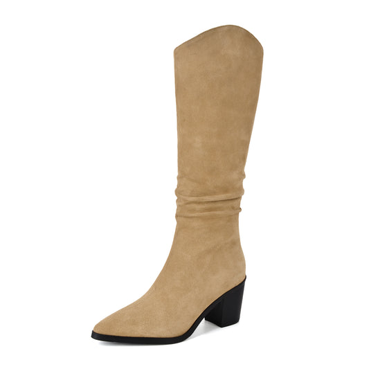 TinaCus Women's Handmade Genuine Leather Pointed Toe Gradient Color Mid Block Heel Back Zip Up Trendy Ruffle Mid-Calf Boots