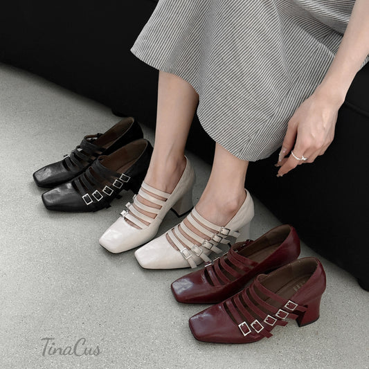 TinaCus Women's Square Toe Handmade Buckles Mid Chunky Heels Genuine Leather Chic Pumps Shoes