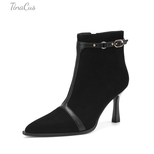 TinaCus Women's Pointed Toe Genuine & Suede Leather Handmade Strap Buckle Zip up Stiletto Heels Ankle Boots