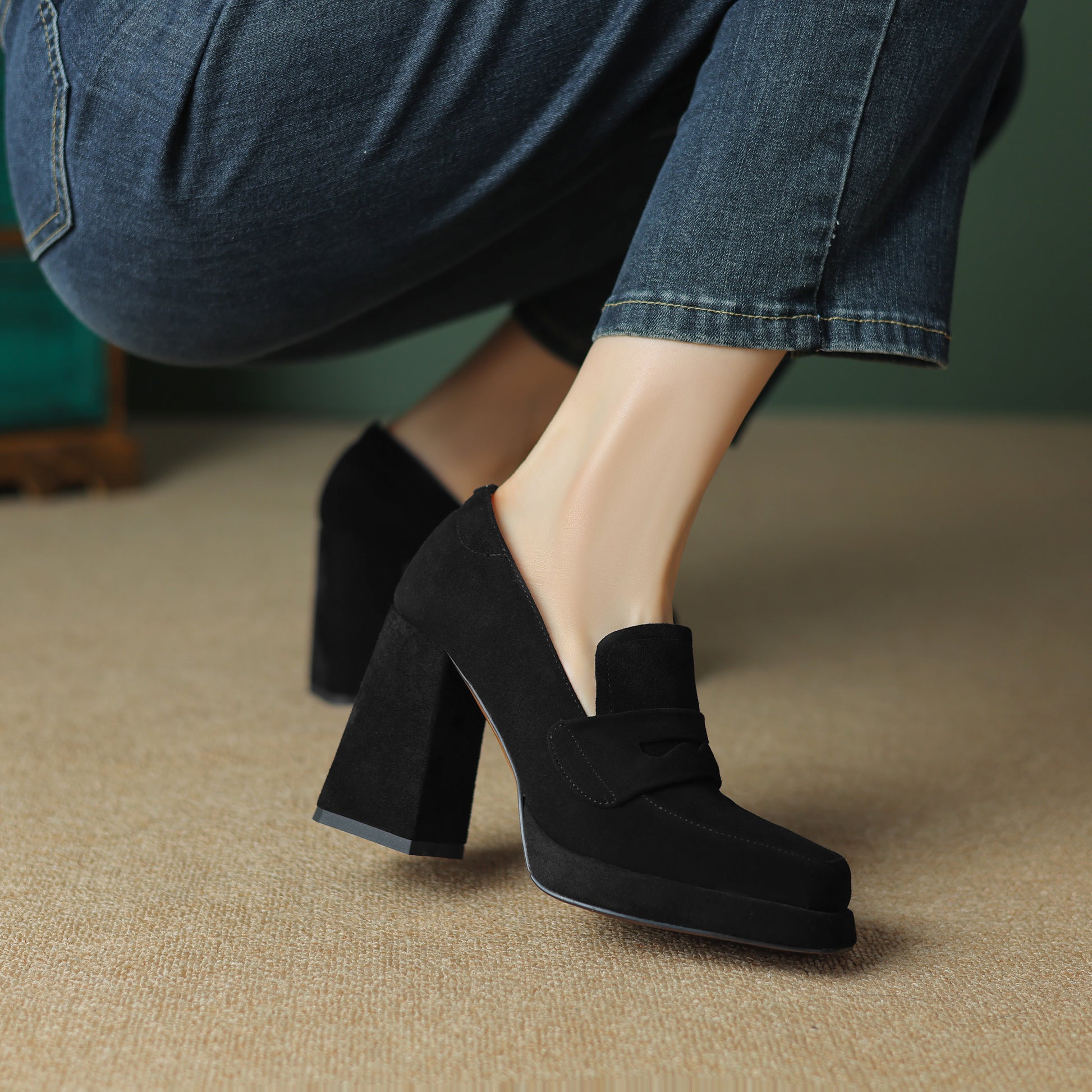 TinaCus Handmade Women's Genuine/Suede Leather Square Toe Slip On High Block Heel Loafer Shoes with Platform