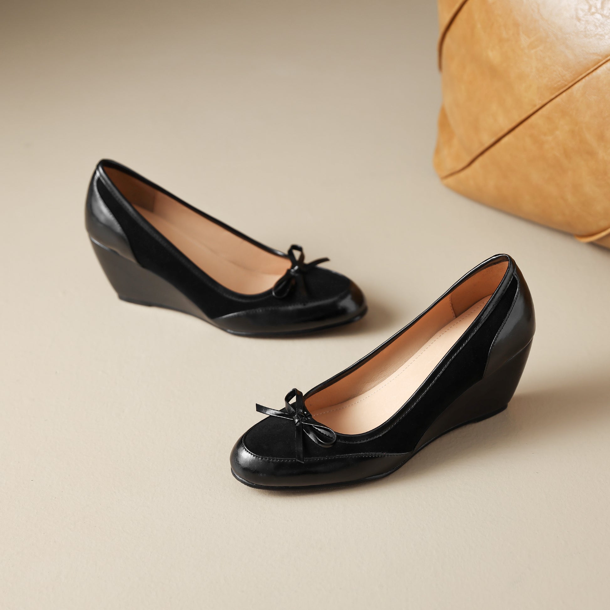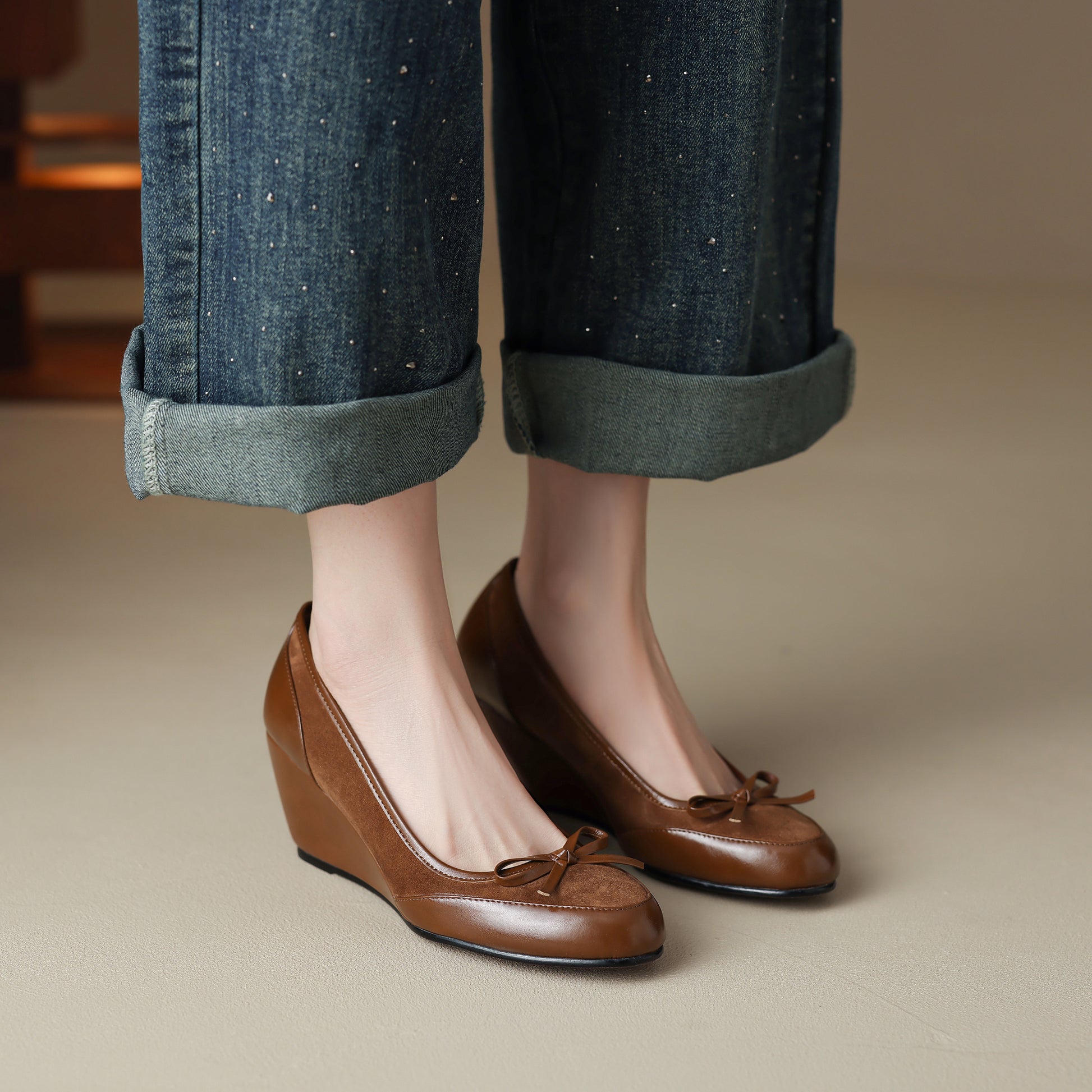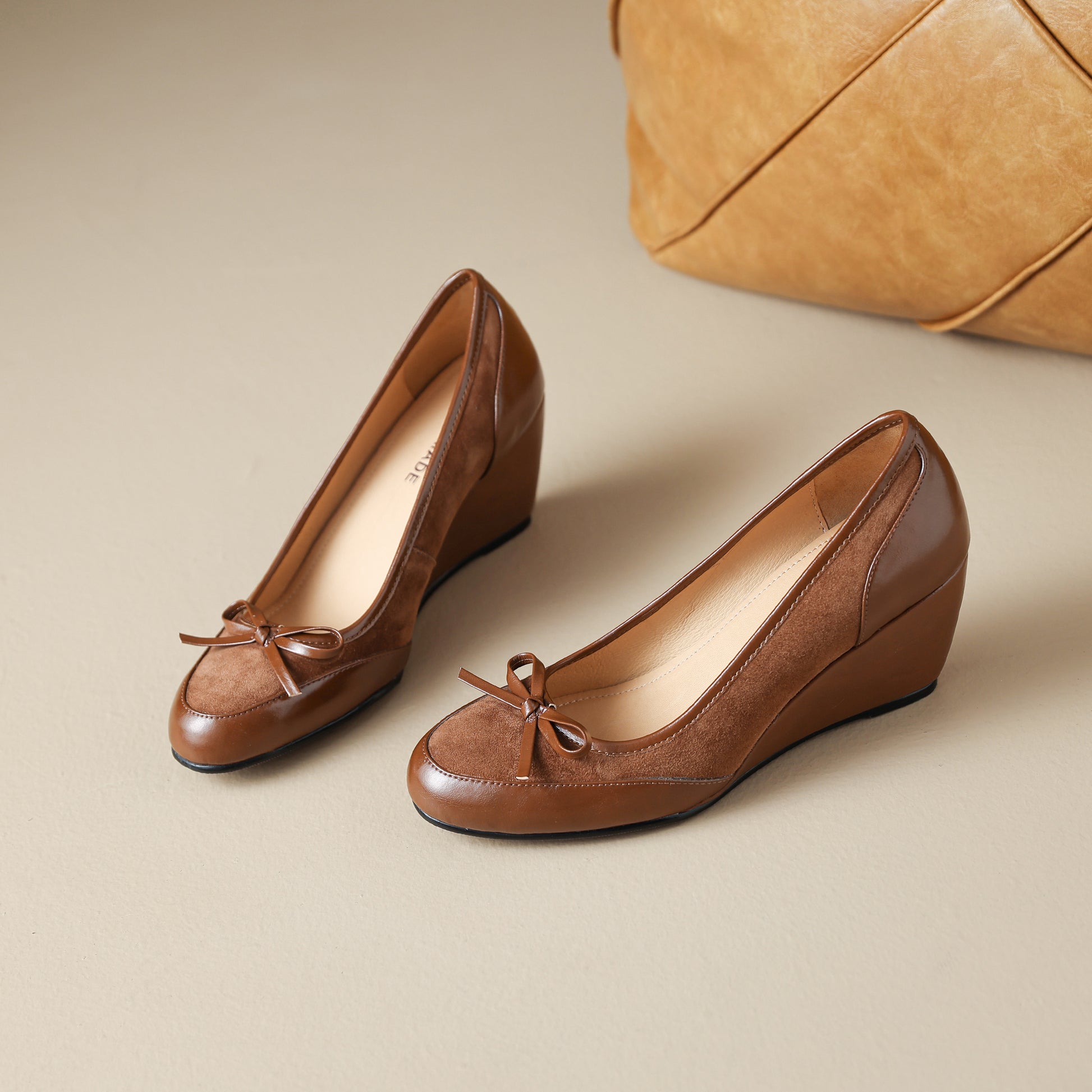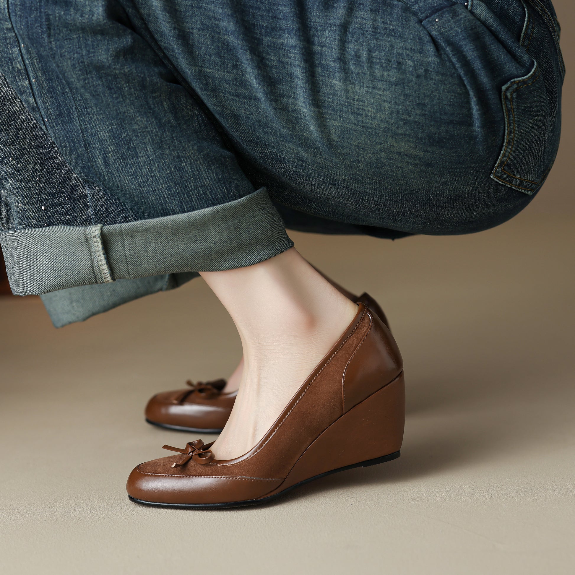 Elevate your casual style with these Round-Toe Wedge Pumps, crafted from premium Suede Leather.