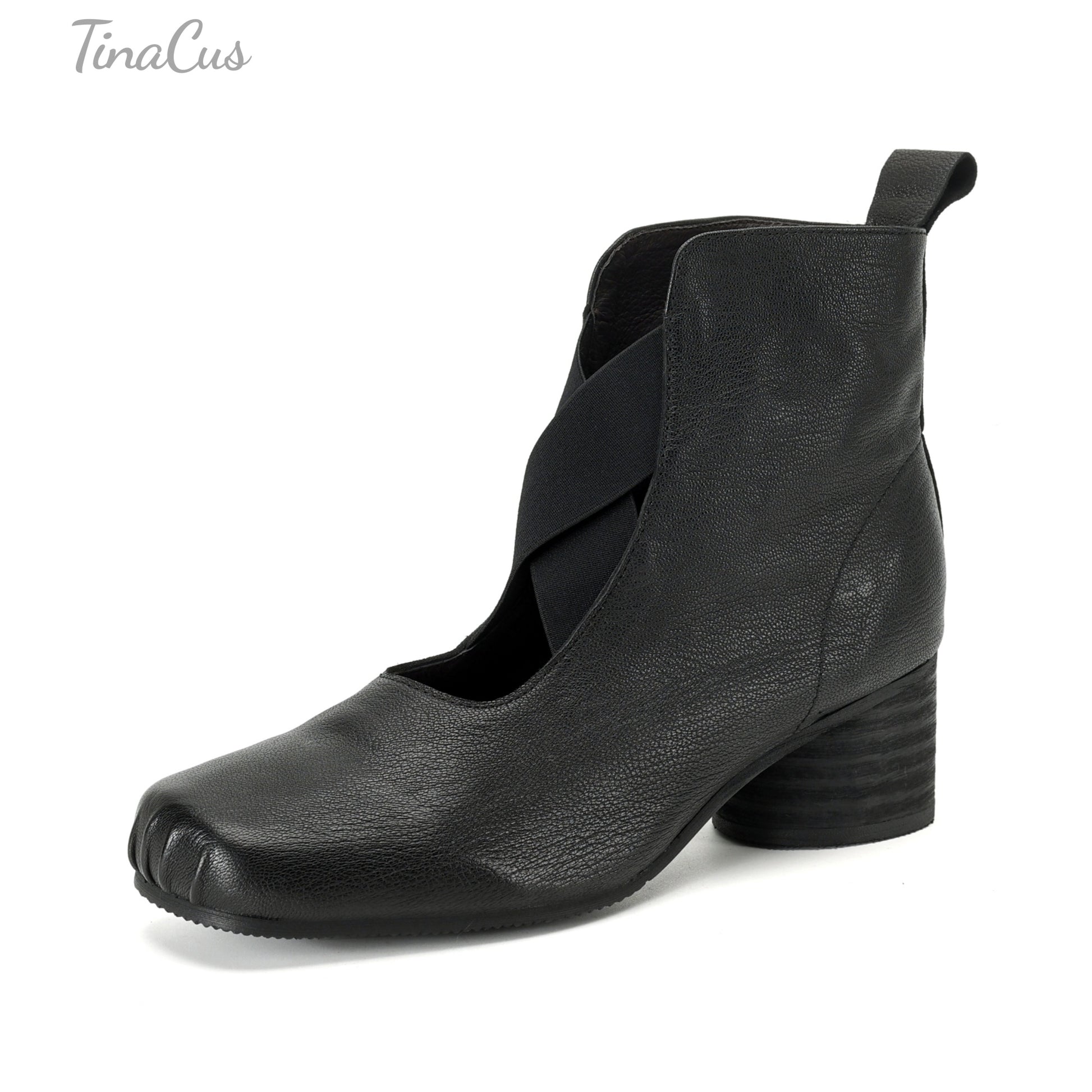 TinaCus Women's Ballet Ankle Boots Genuine Leather Square Toe Handmade Chunky Heels Slip on Booties
