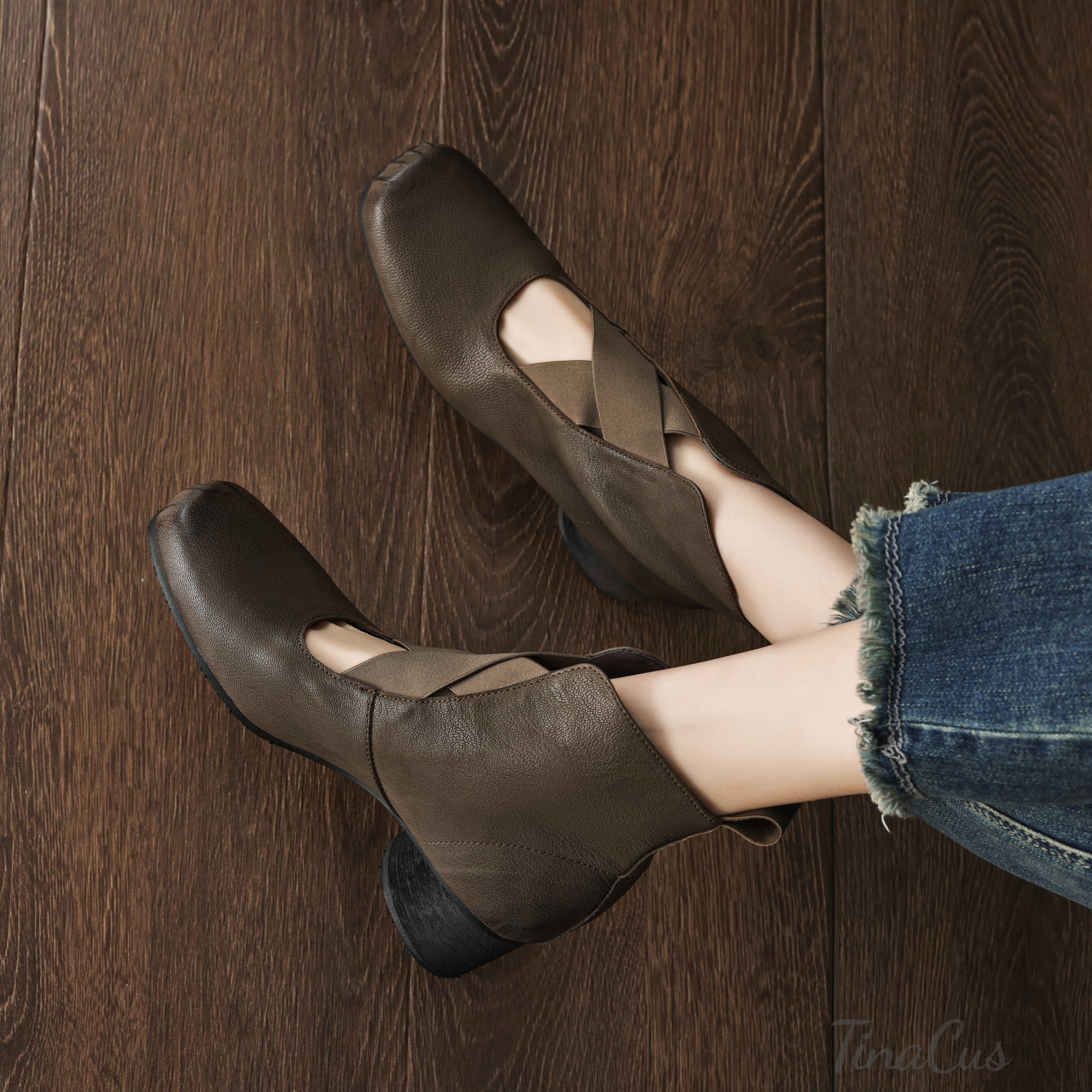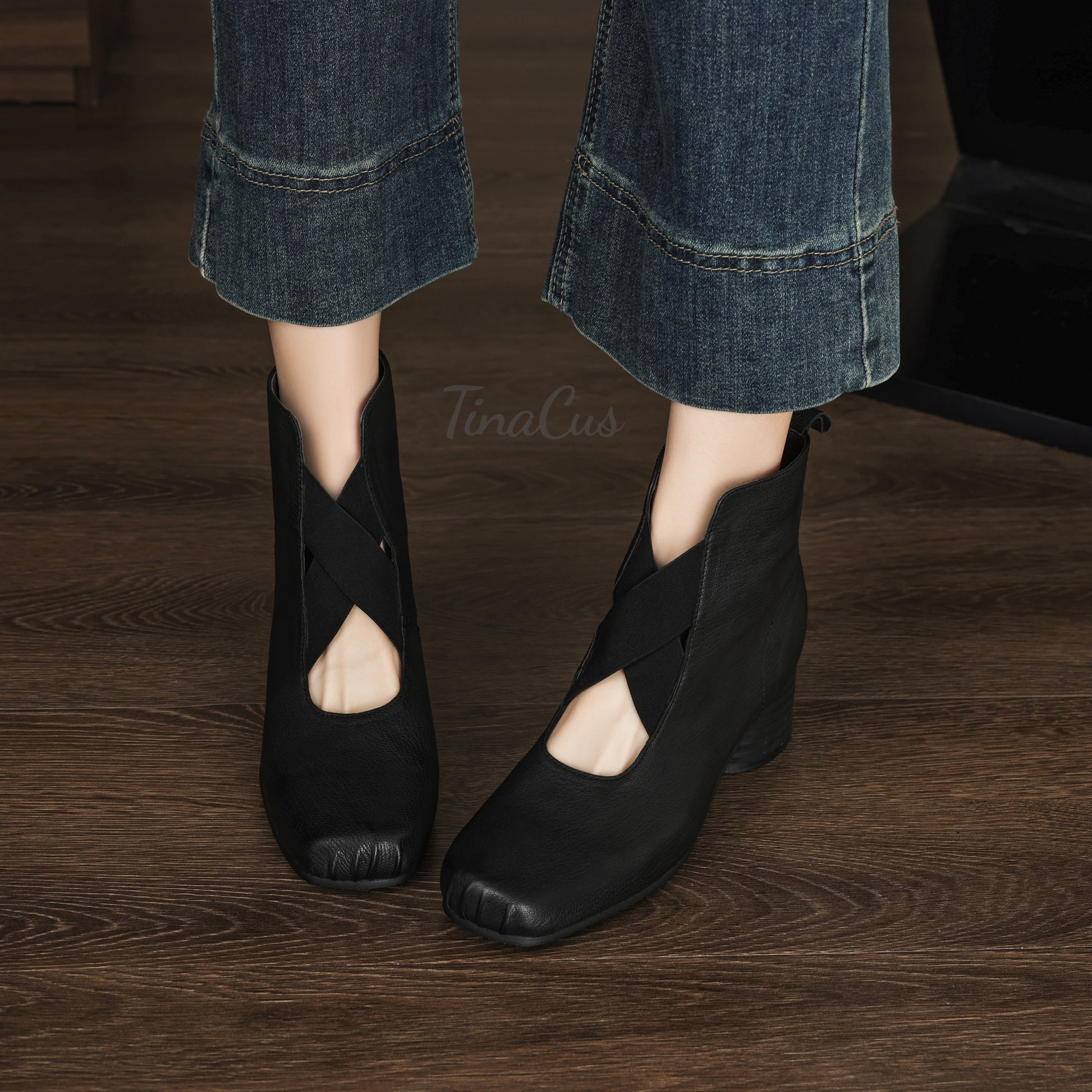 Ankle boots designed with square toe, genuine leather,chunky heels and cross-belts to keep up with fashion trend