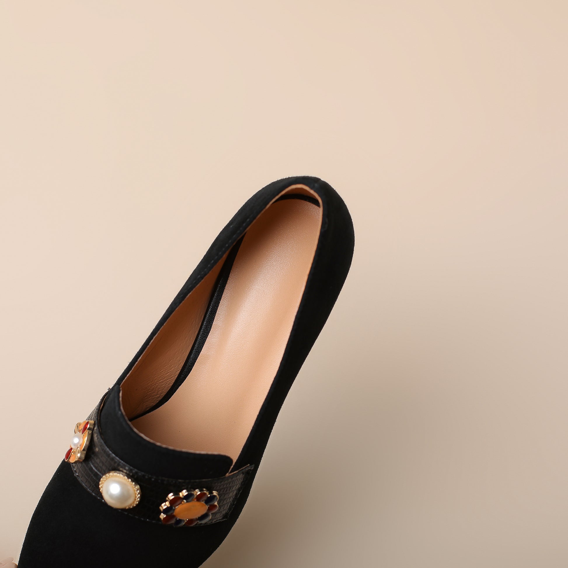 Suede leather pumps shoes with pointed toe, jewelery decoration and mid heels can go with kinds of outfits