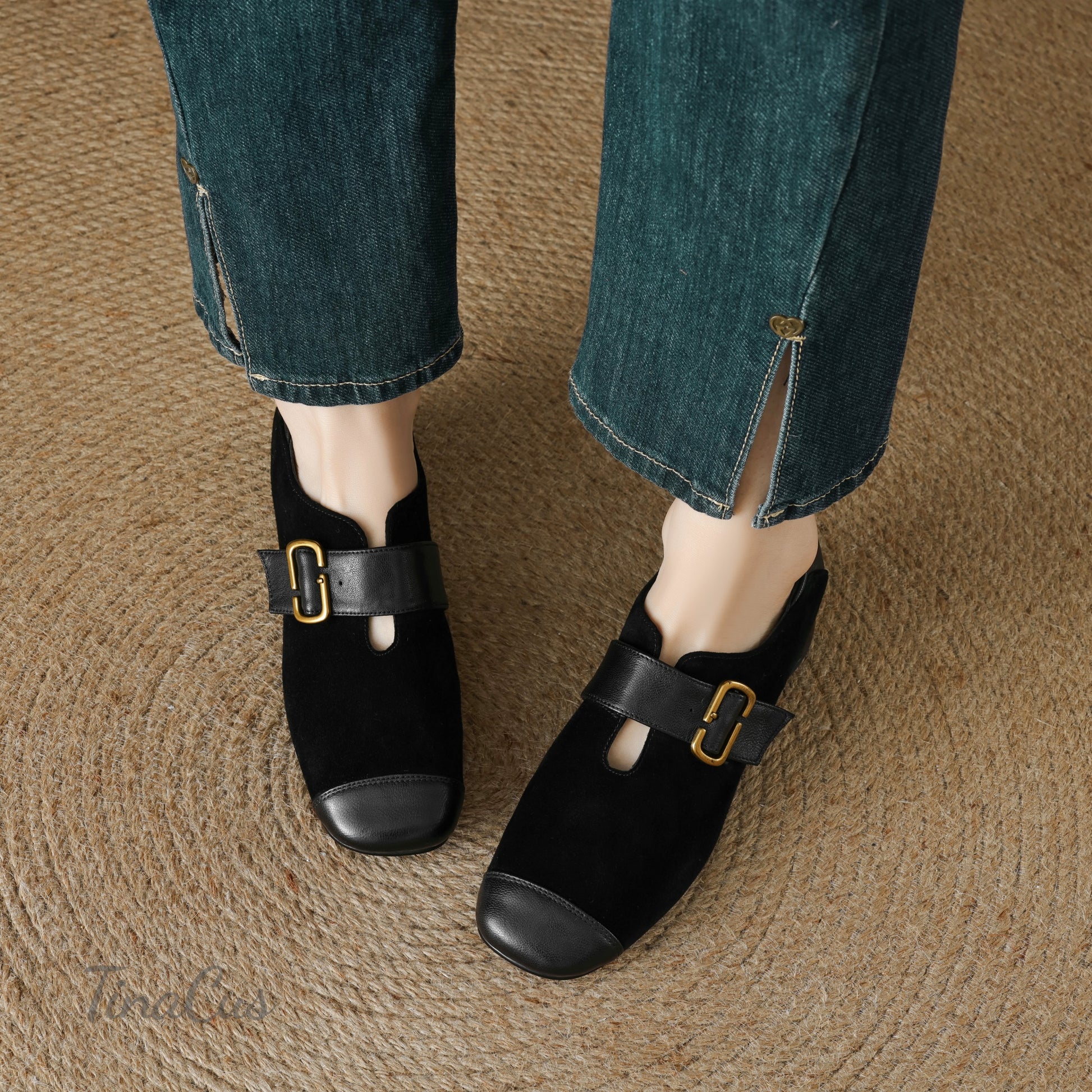 TinaCus Women's Cap Toe Suede & Genuine Leather Handmade Strap Buckle Low Heels Loafers Shoes