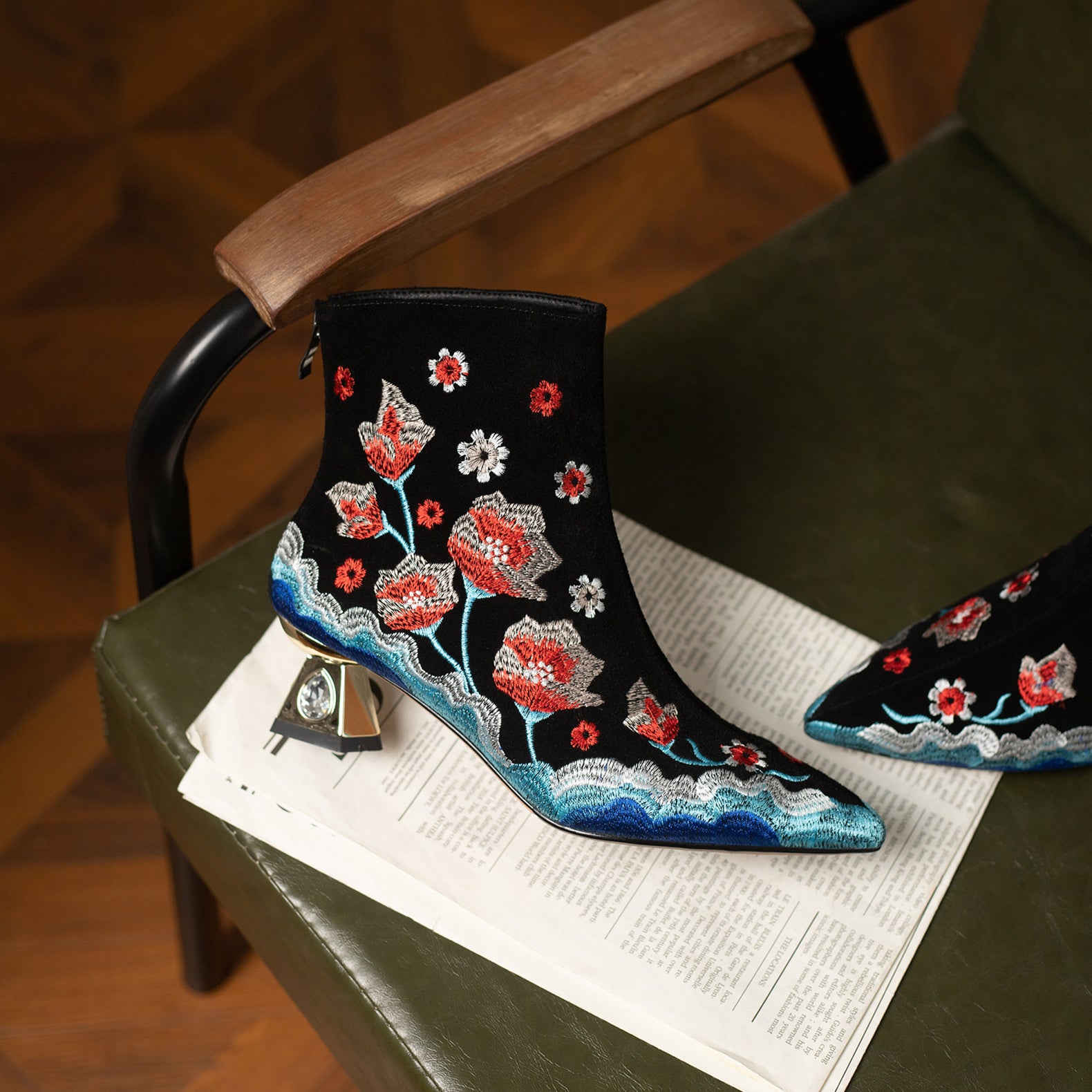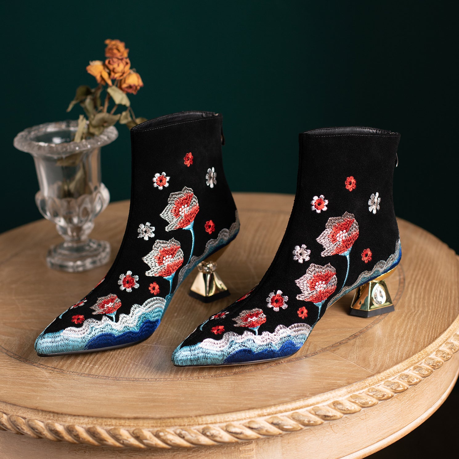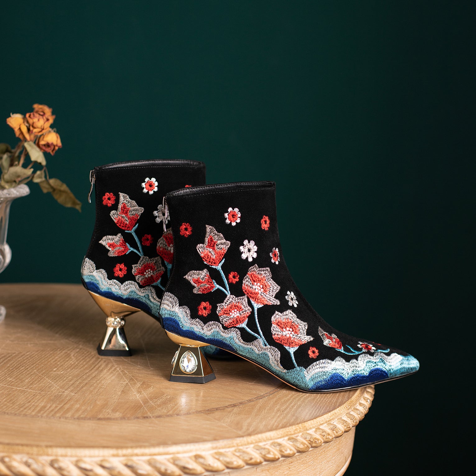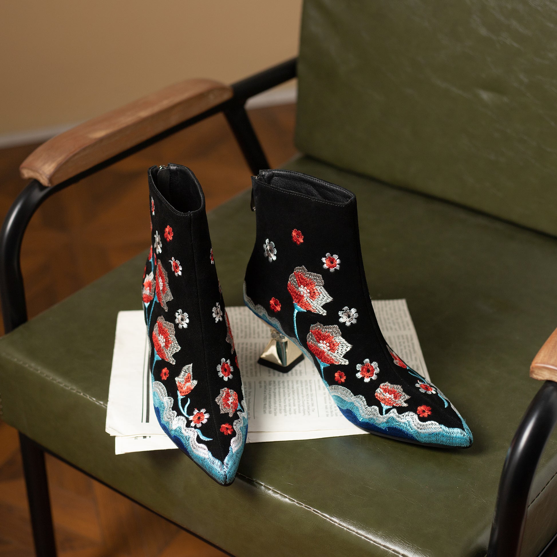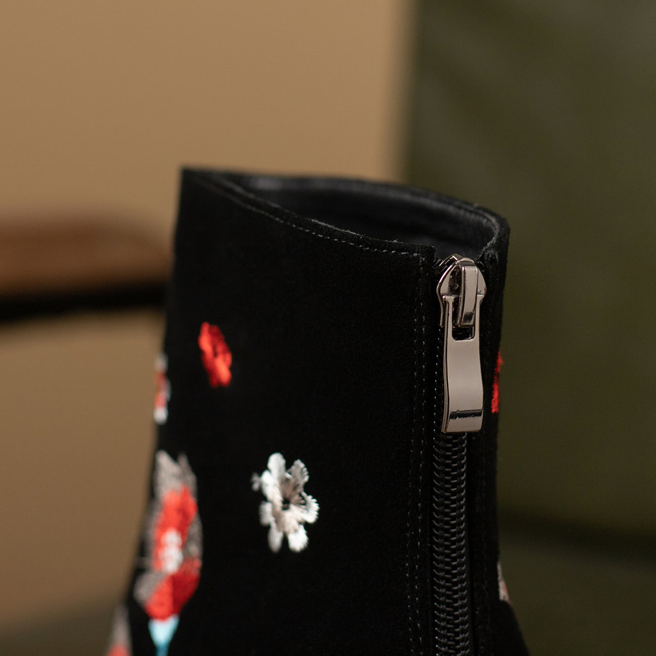 TinaCus Women's Embroidery Floral Pattern Suede Leather Handmade Mid Heel Back Zip Ankle Boots