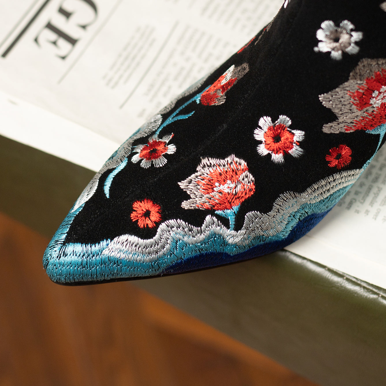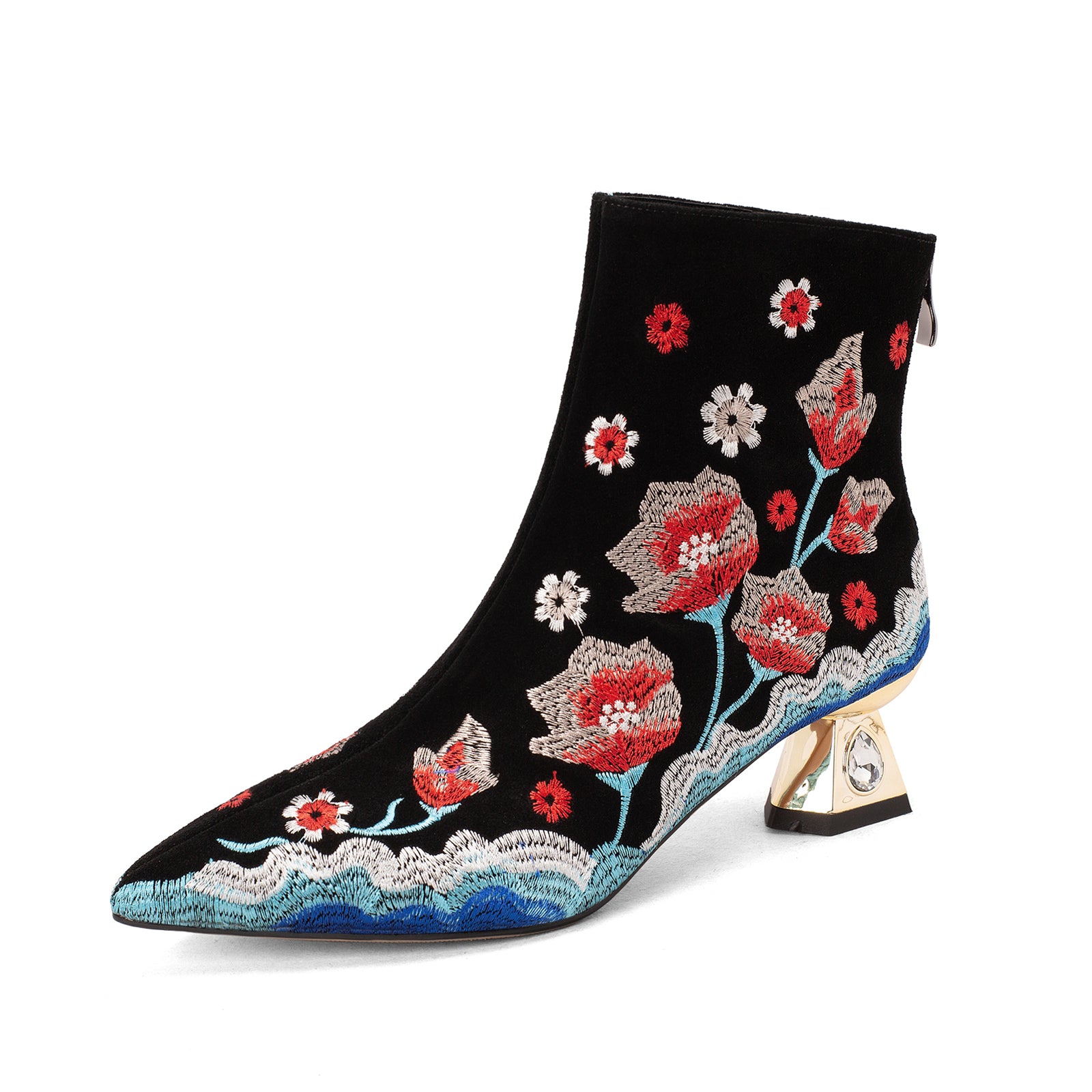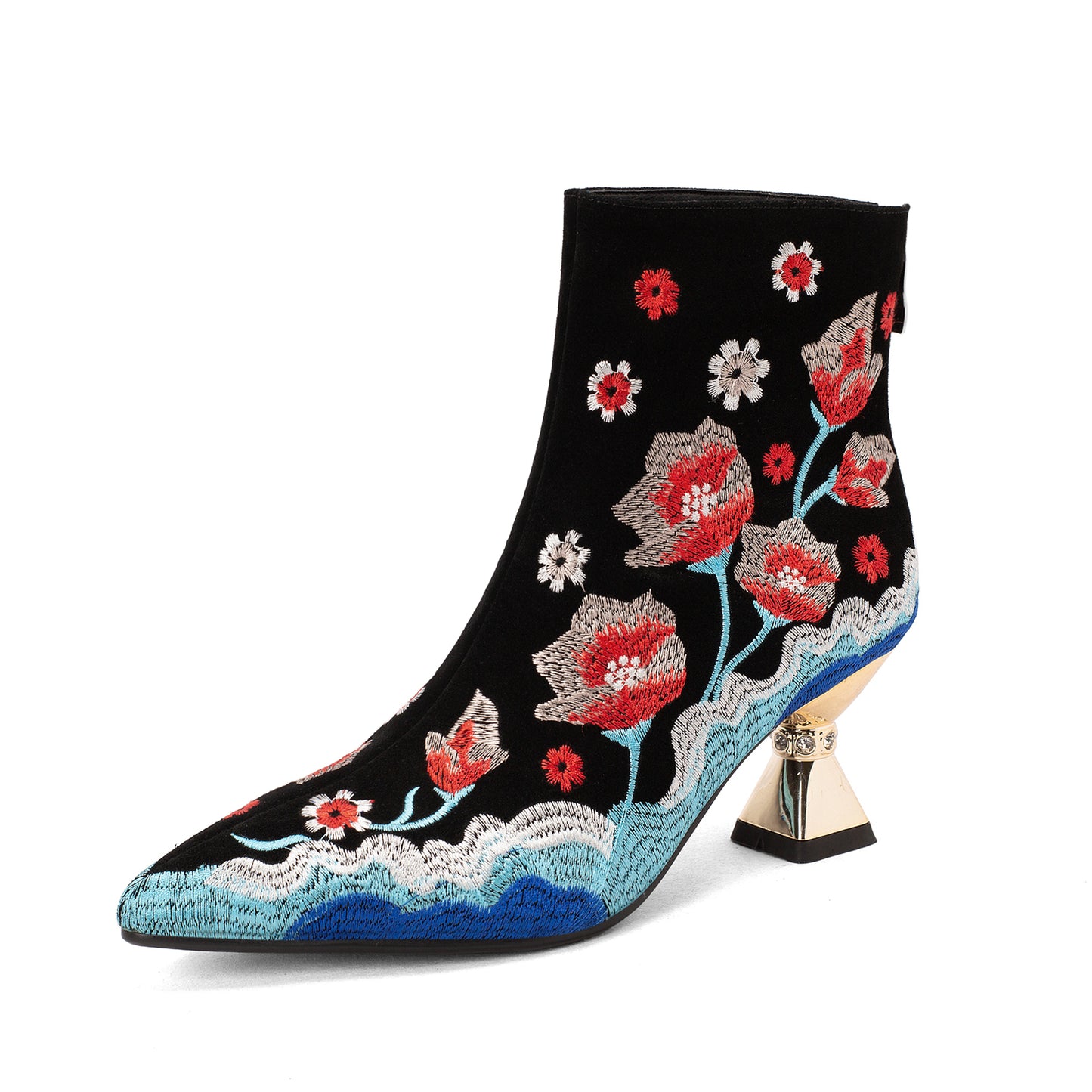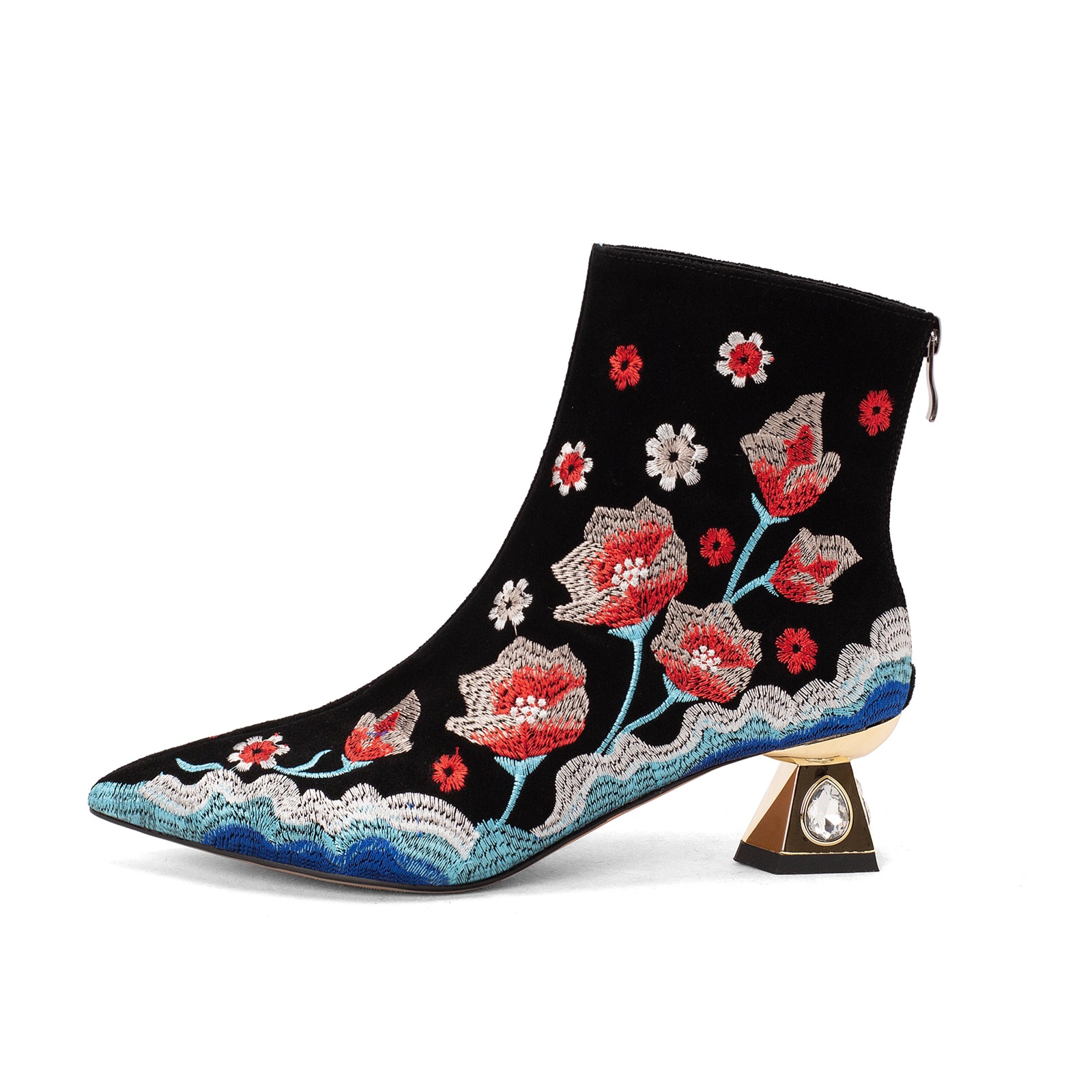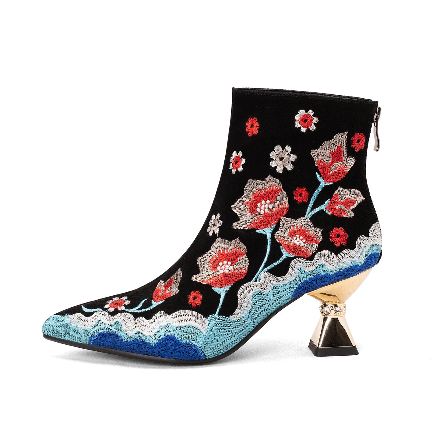 TinaCus Women's Embroidery Floral Pattern Suede Leather Handmade Mid Heel Back Zip Ankle Boots
