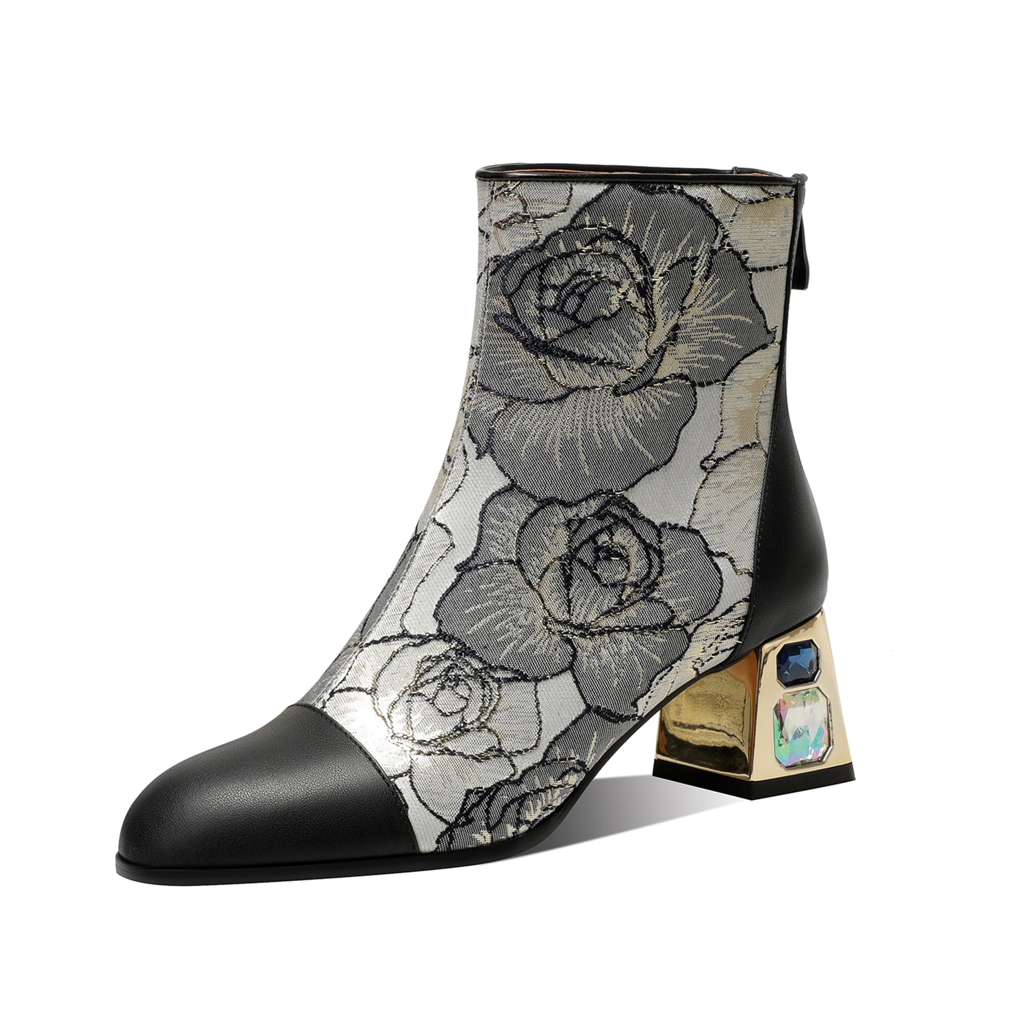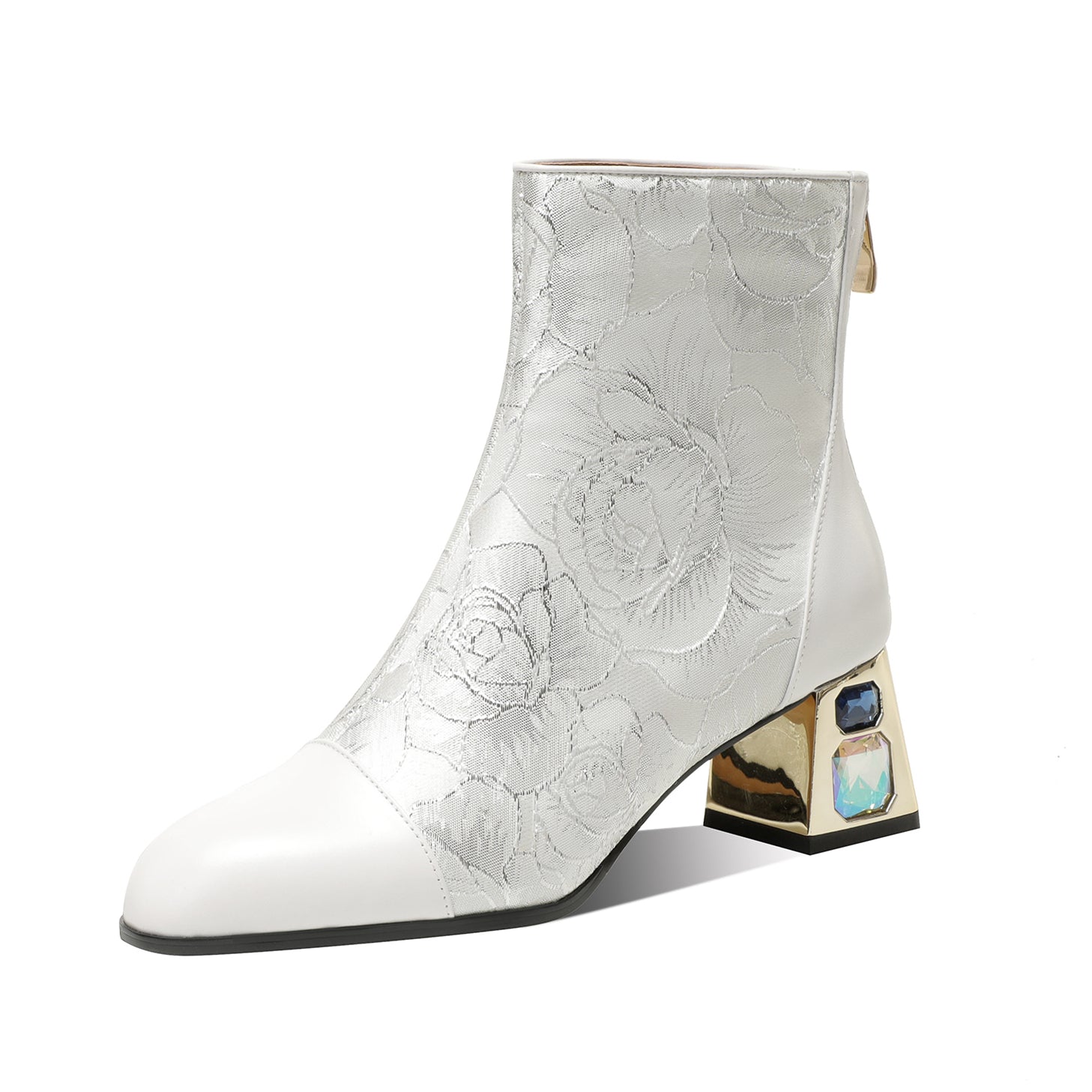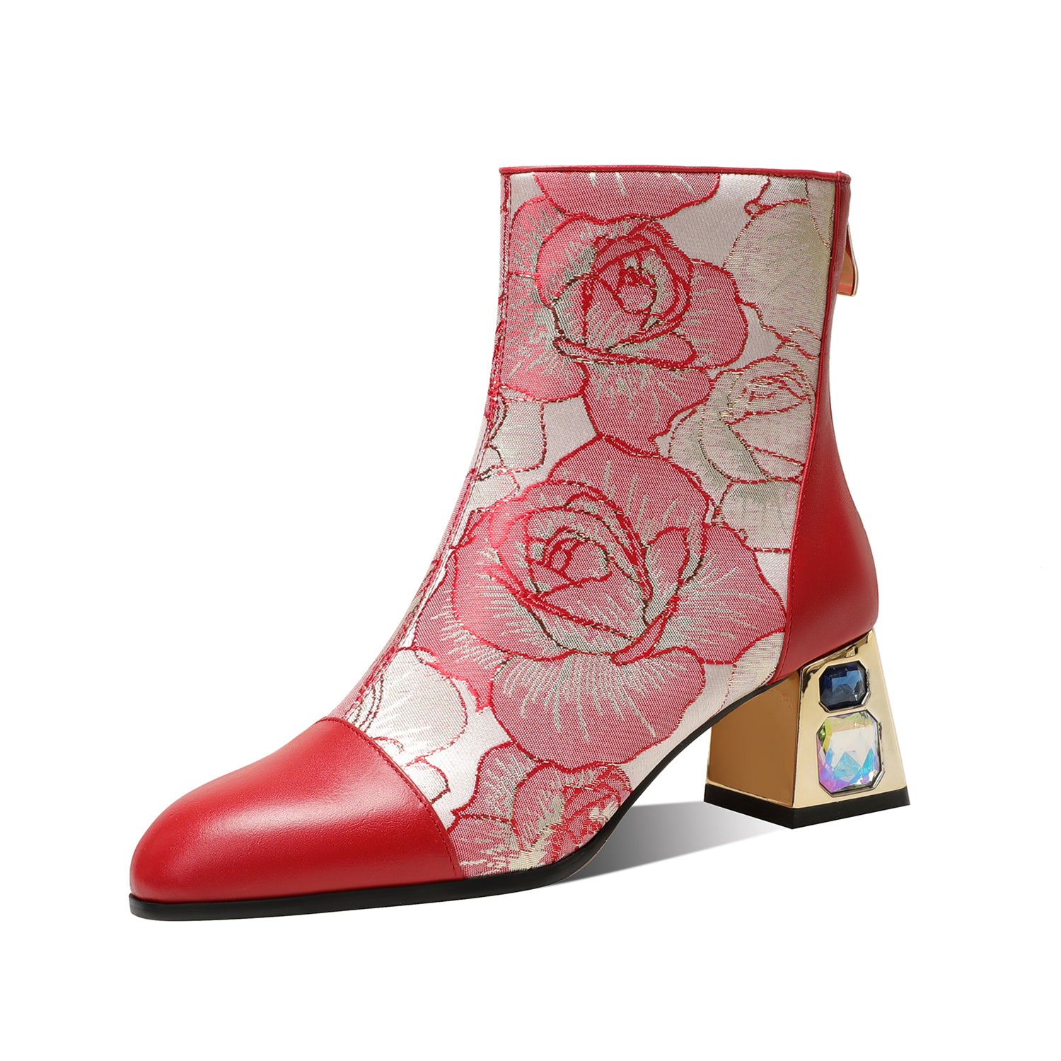TinaCus Women's Genuine Leather Crystal Heel Handmade Back Zip Up Embroidery Flowers Ankle Boots