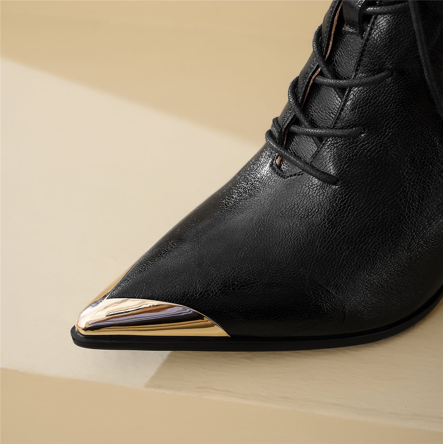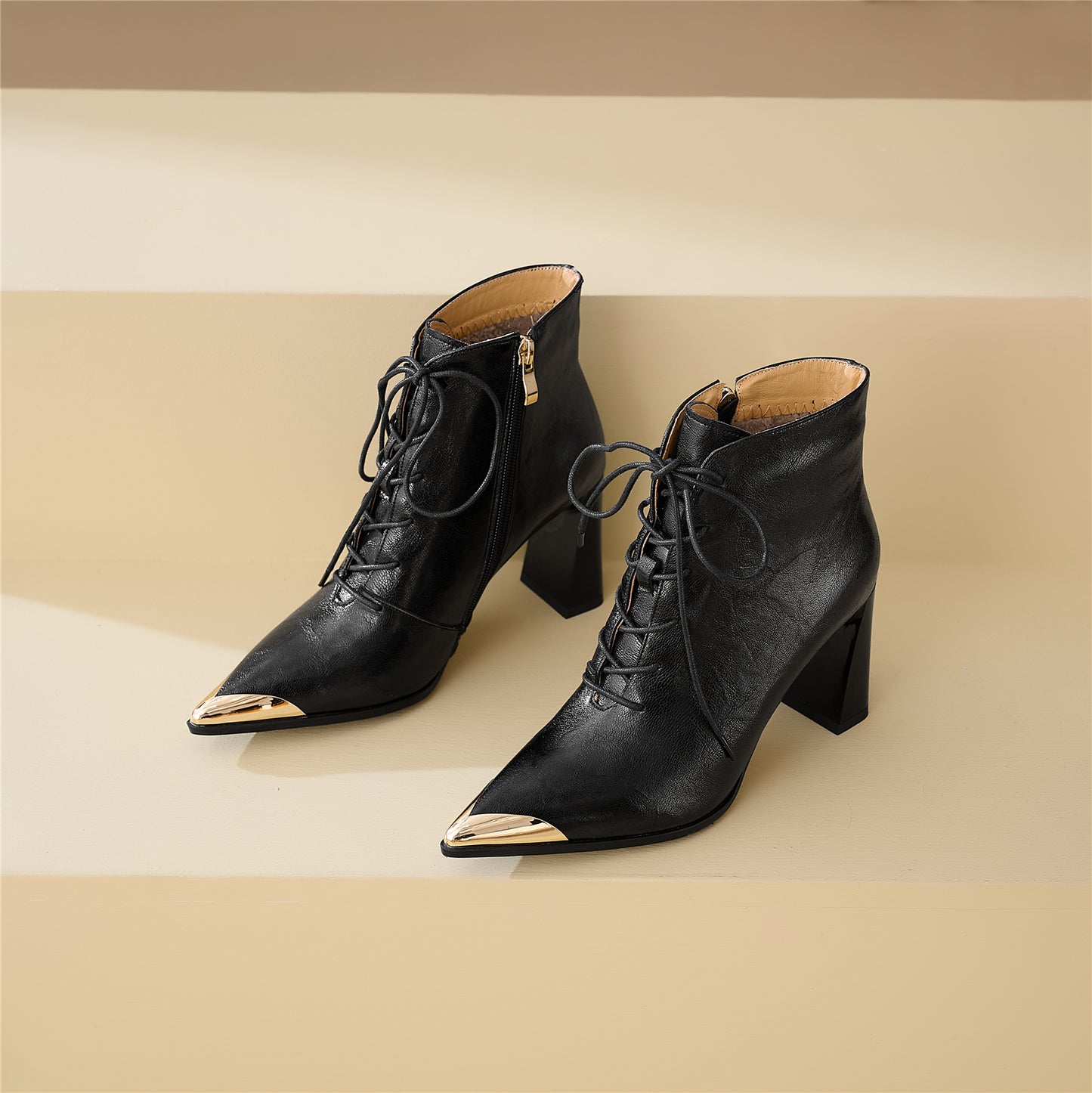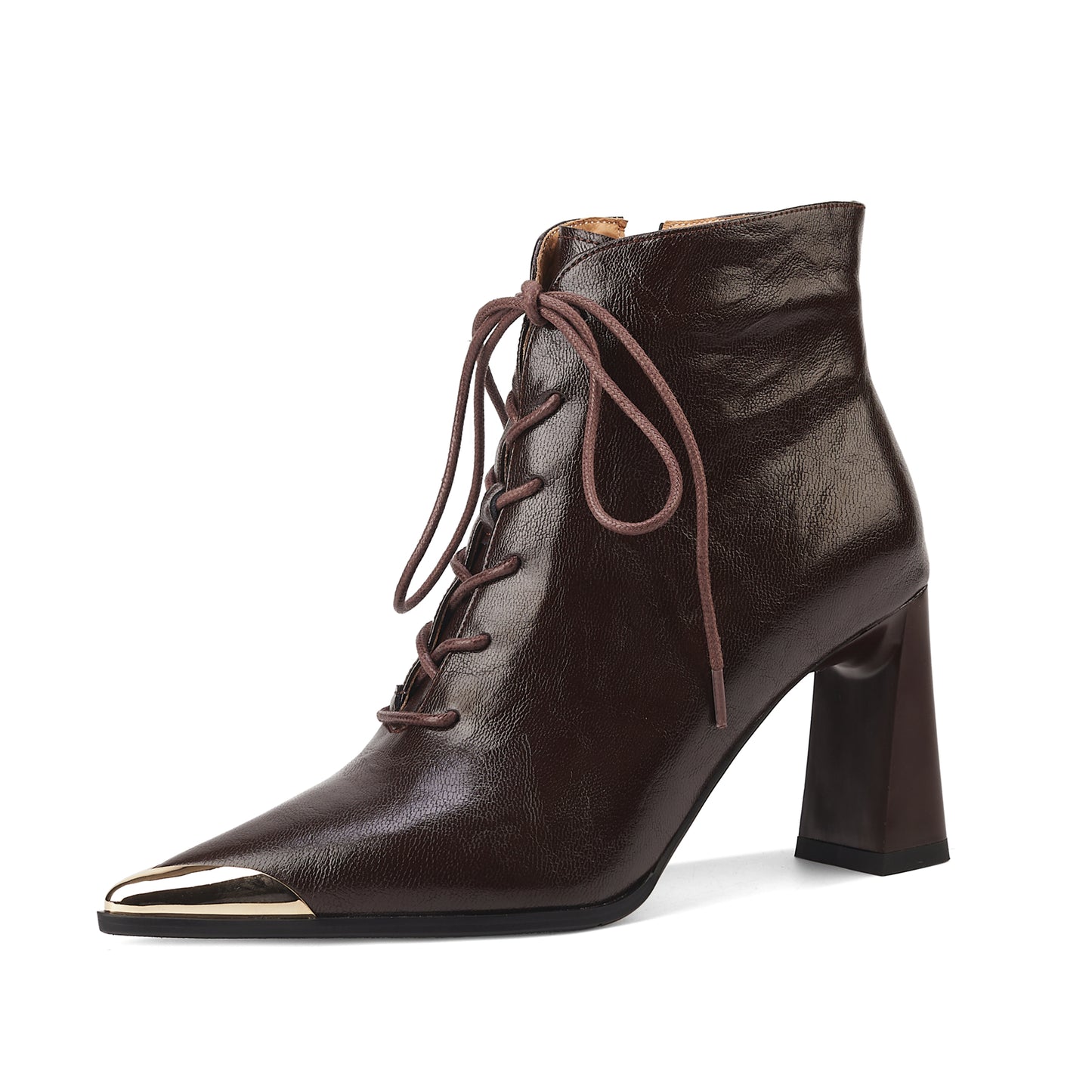 Ankle boots are designed with pointed toe, genuine leather, zip and high heel.