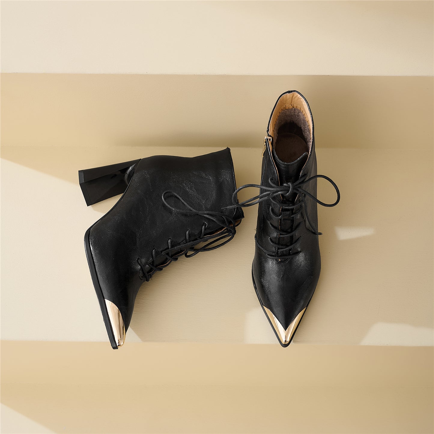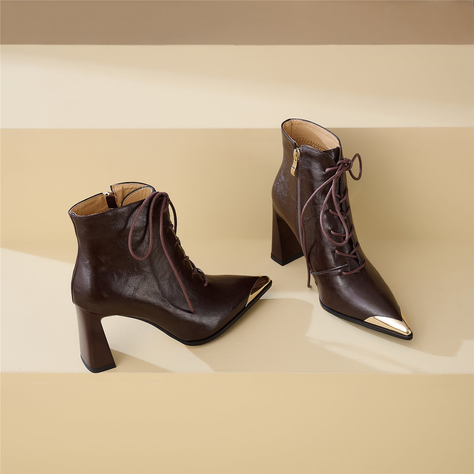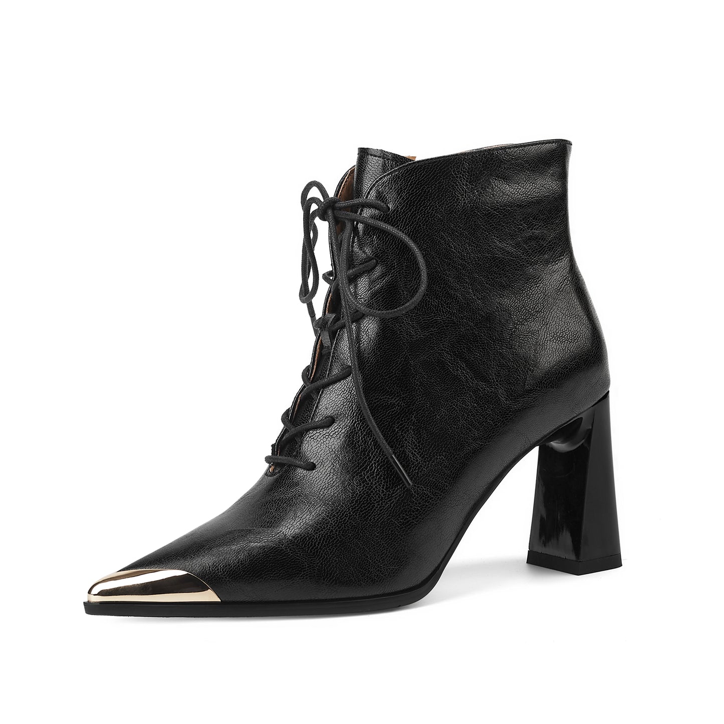 Ankle boots are designed with pointed toe, genuine leather, zip and high heel.