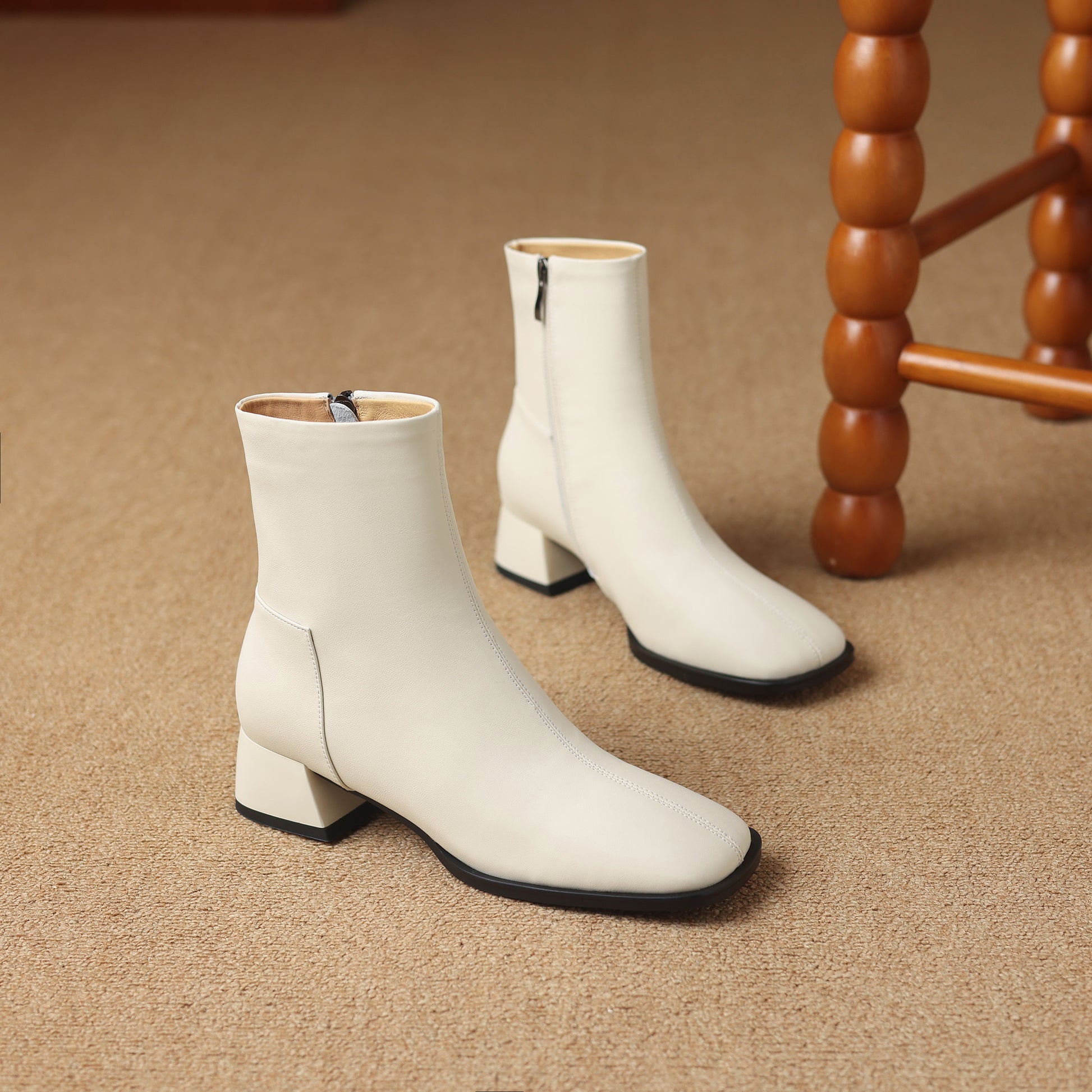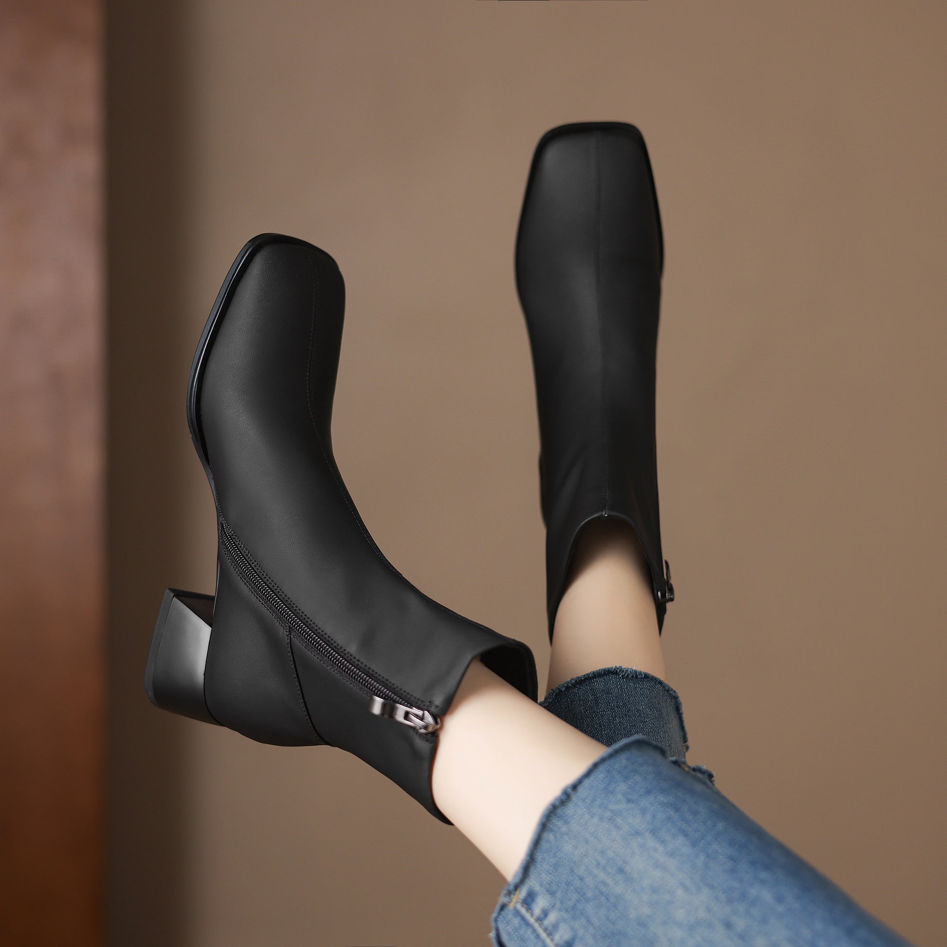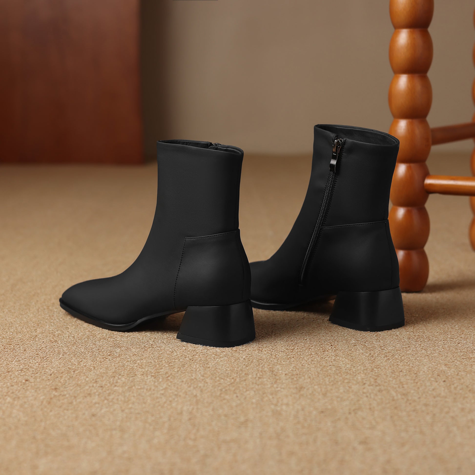 Classic square-toe ankle boots with low block heels deliver stable, all-day comfort.