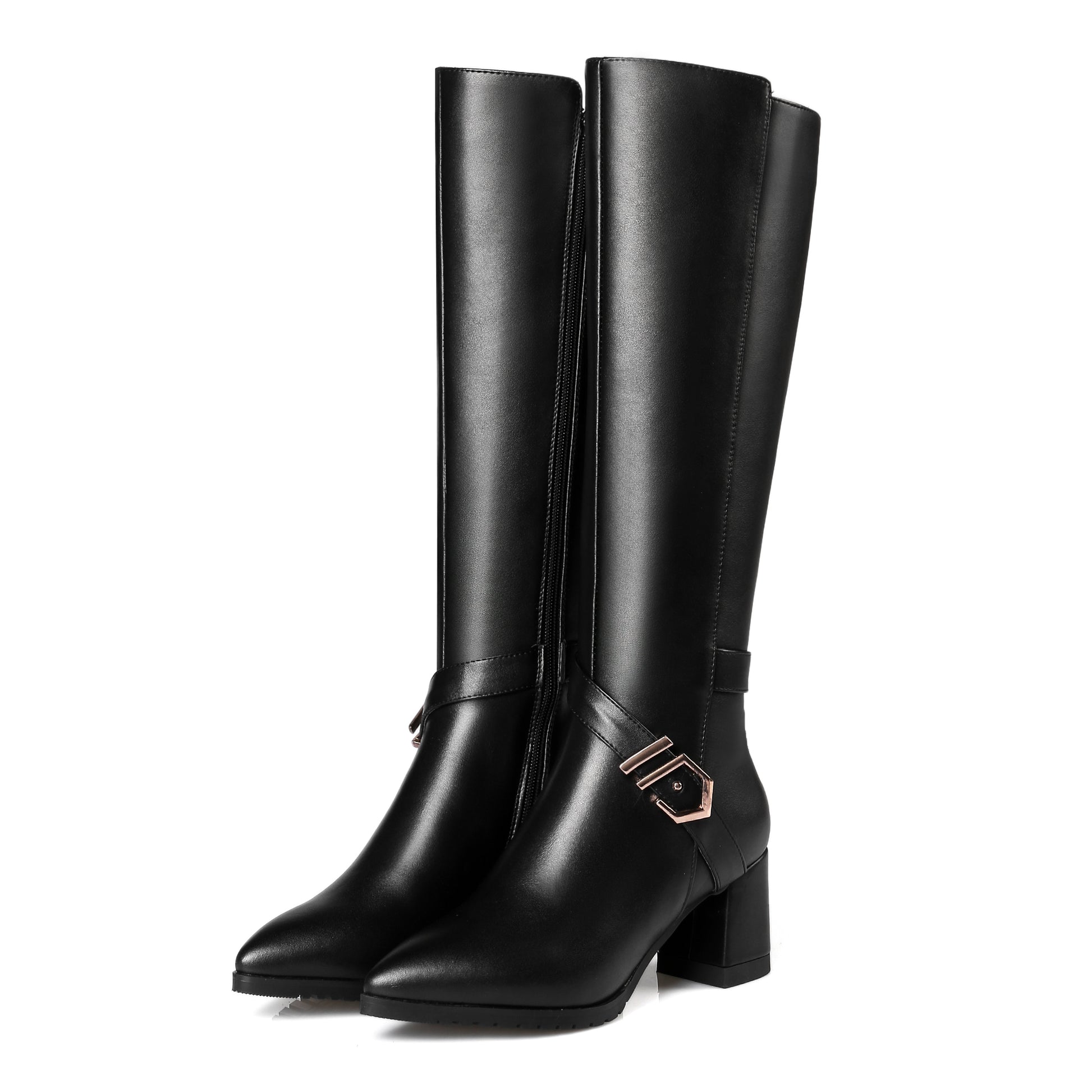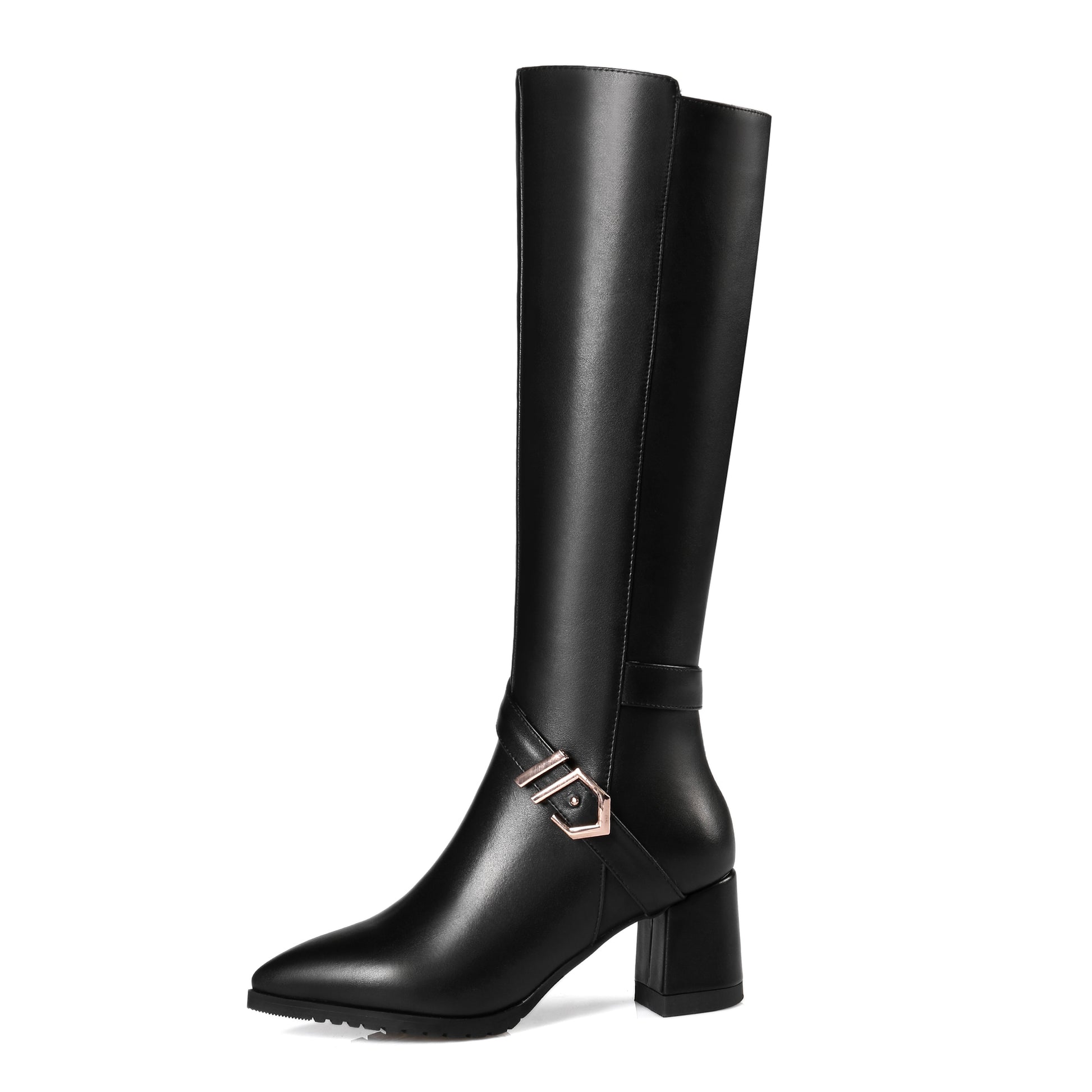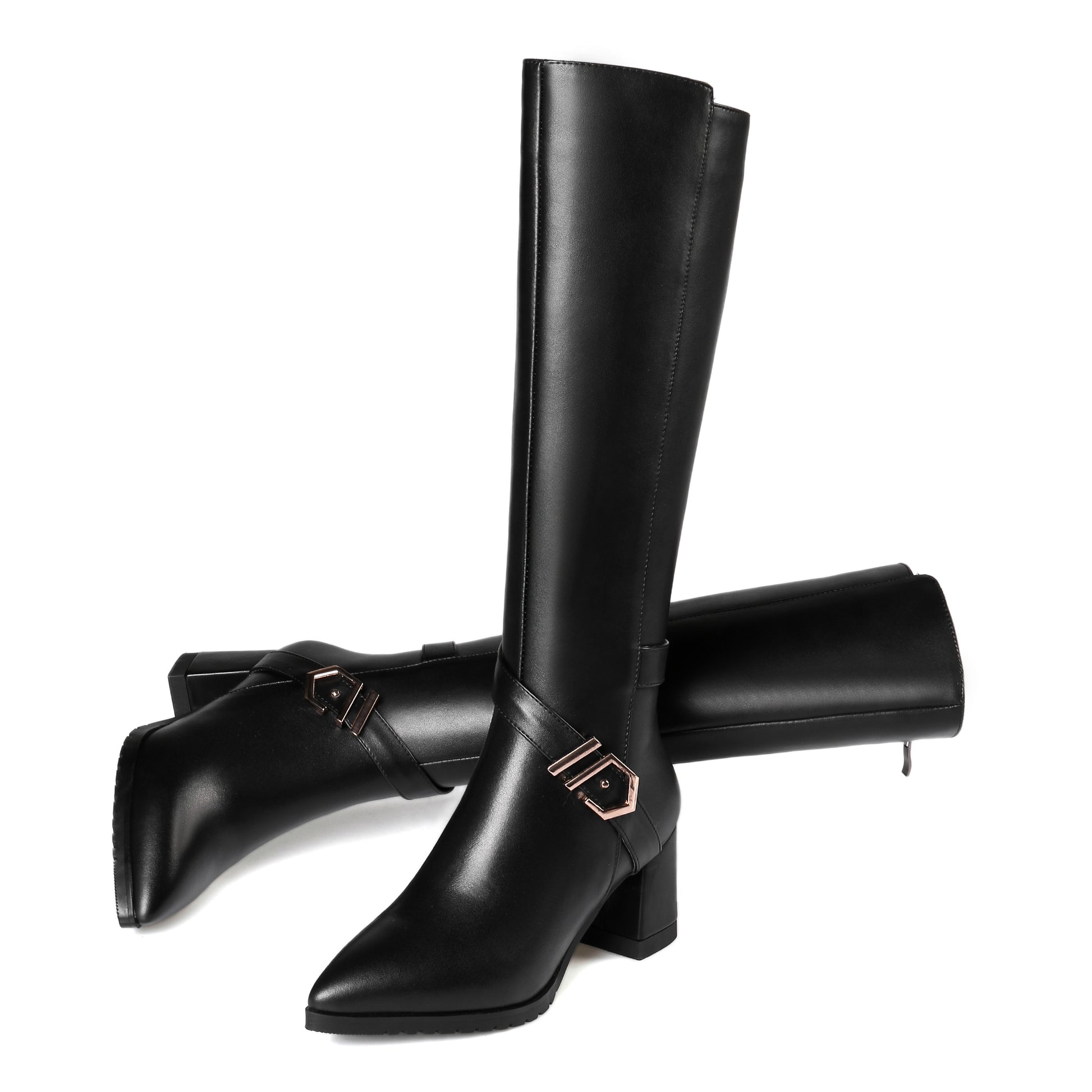 Classic black knee high boots designed with genuine leather, pointed toe, side zipper, buckle belt and mid chunky heels can go with almost all your outfits.