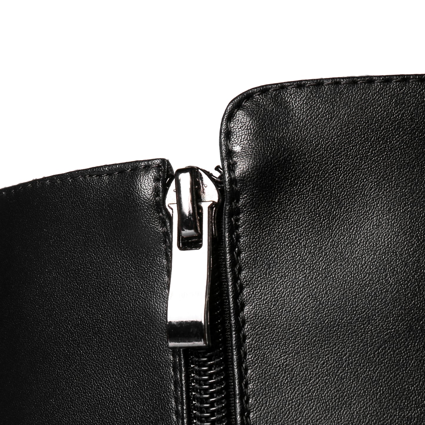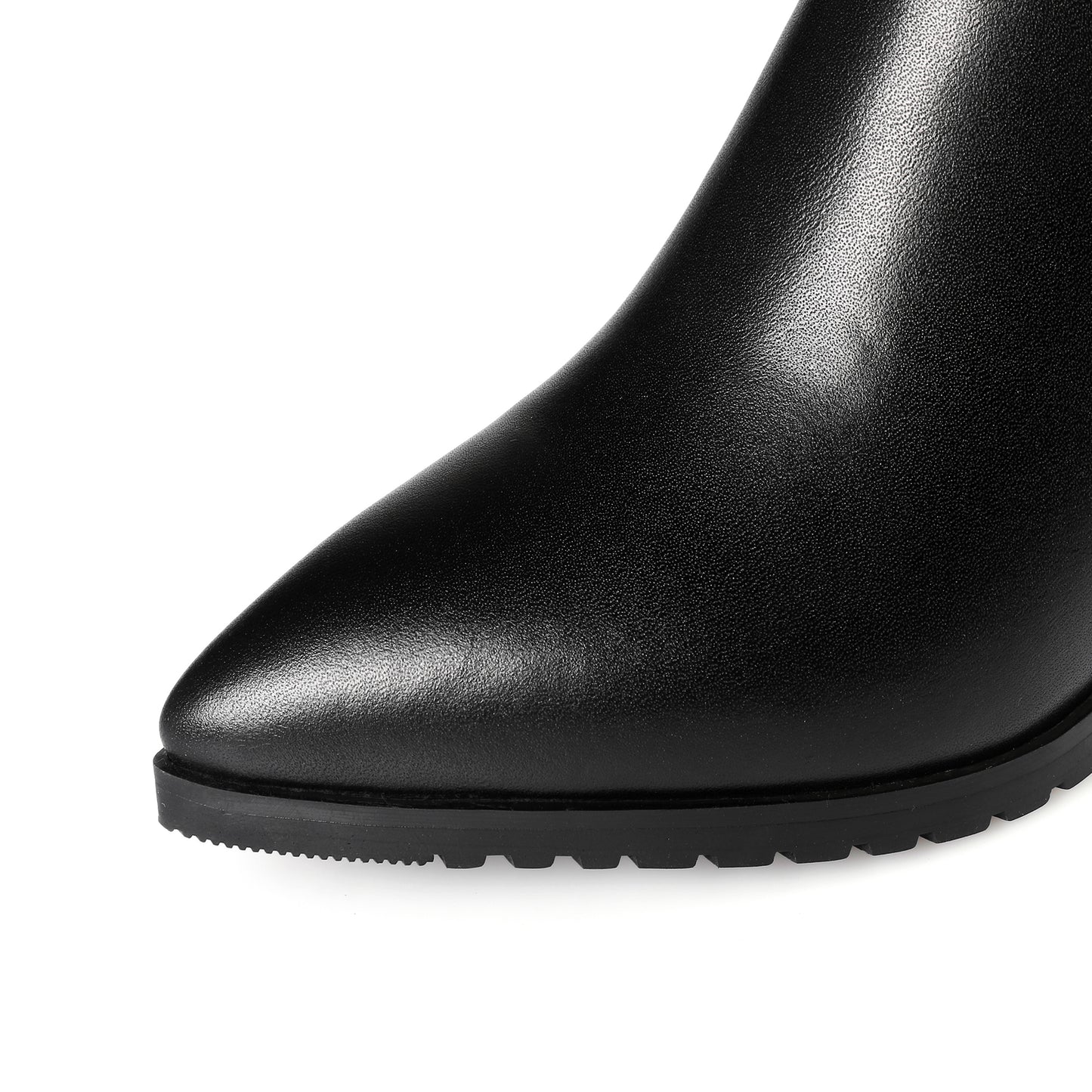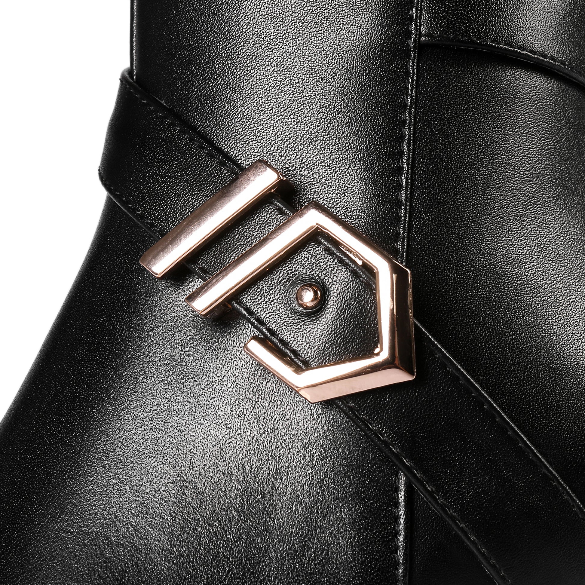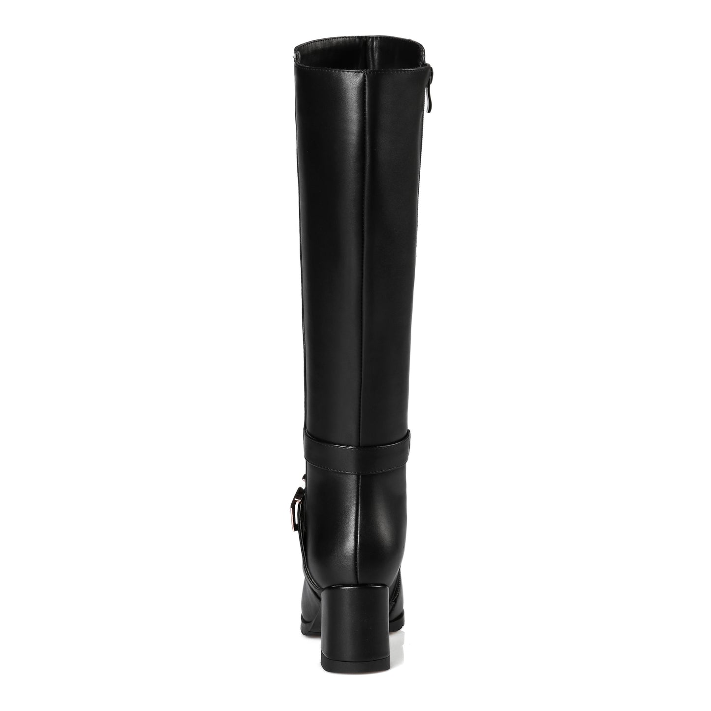Classic black knee high boots designed with genuine leather, pointed toe, side zipper, buckle belt and mid chunky heels can go with almost all your outfits.