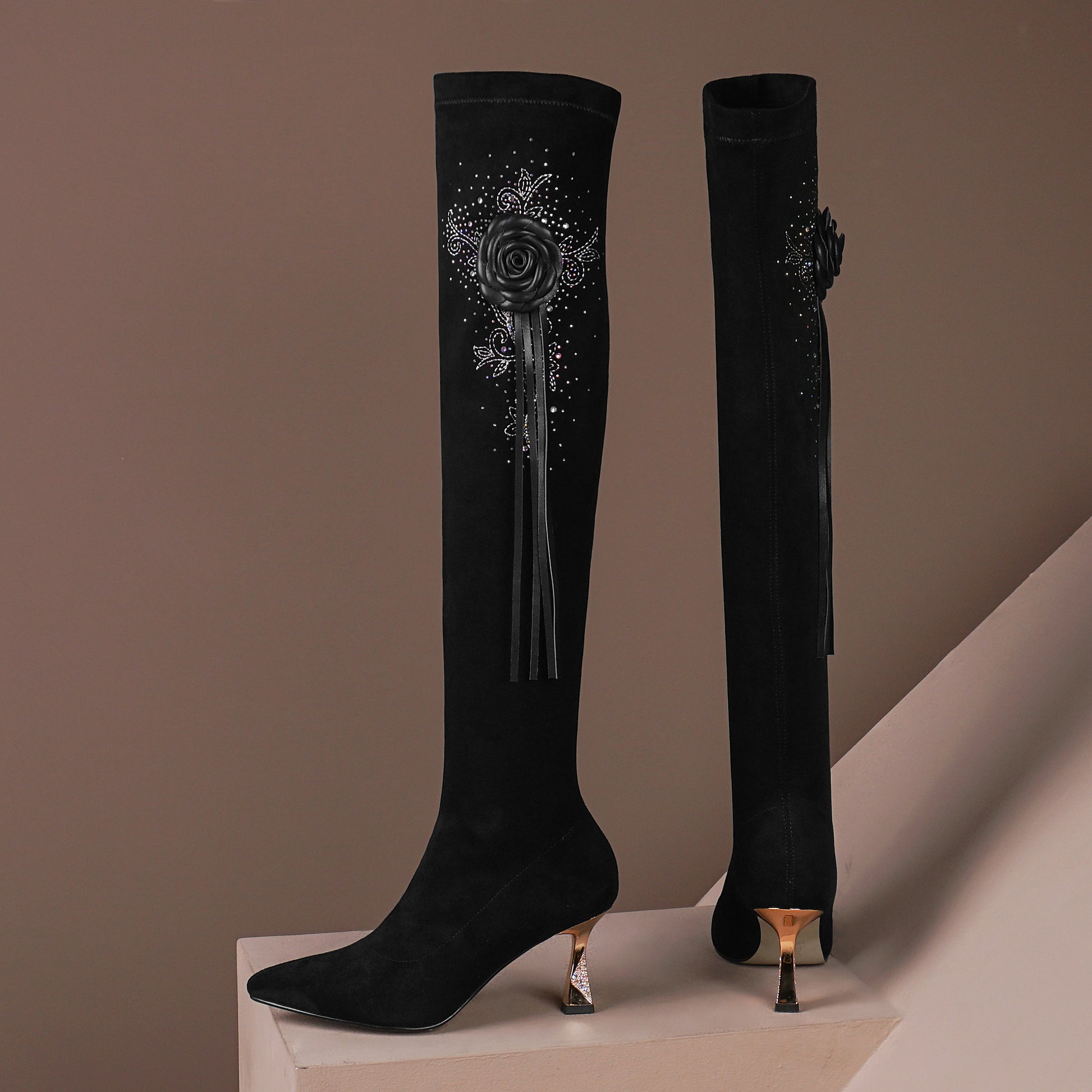 Sexy over the knee boots are designed with suede leather, pointed toe, high heel, beautiful flower and tassel to keep up with fashion trend and give you visual enjoyment.