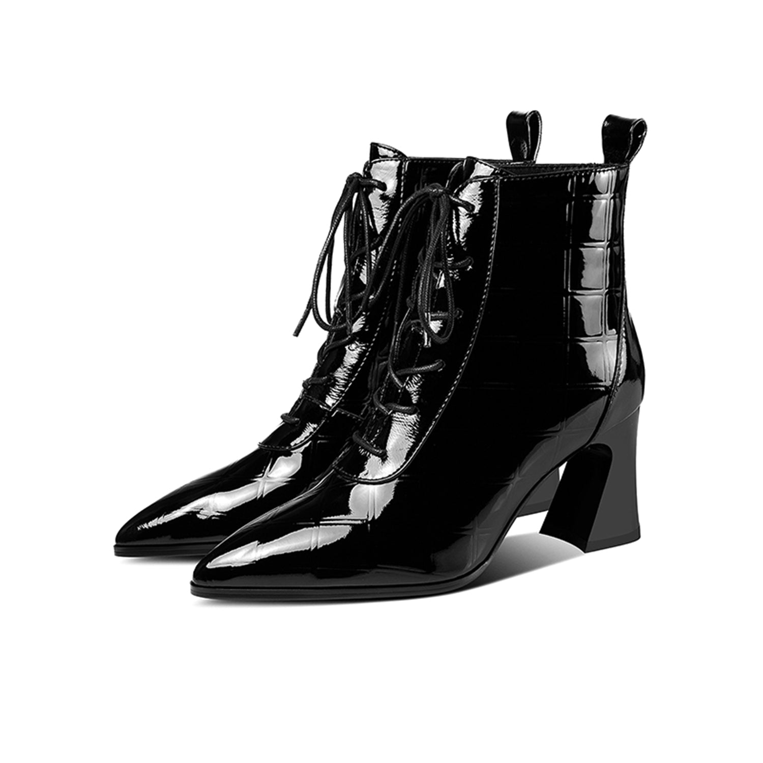 These ankle boots are designed with patent leather, pointed toe, lace up and mid heels.Slip-resistant sole could make you feel confident.