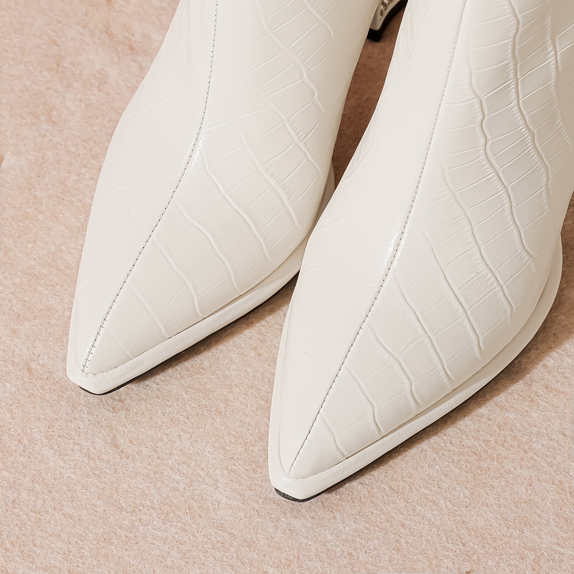 Genuine leather ankle bootsdesigned with pointed toe, back zipper, ring and high heels to keep up with fashion trend.