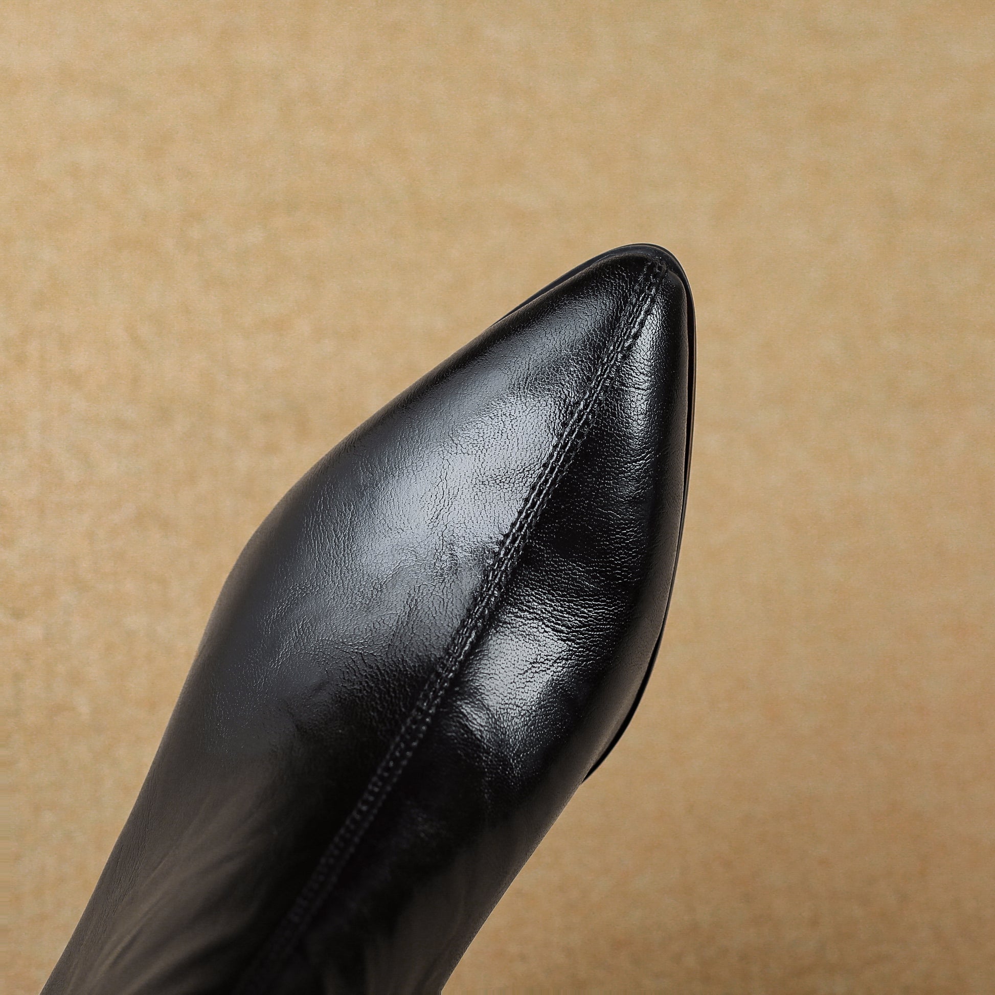 Ankle boots designed with pointed toe, back zipper, genuine leather and mid heels can go with kinds of outfits