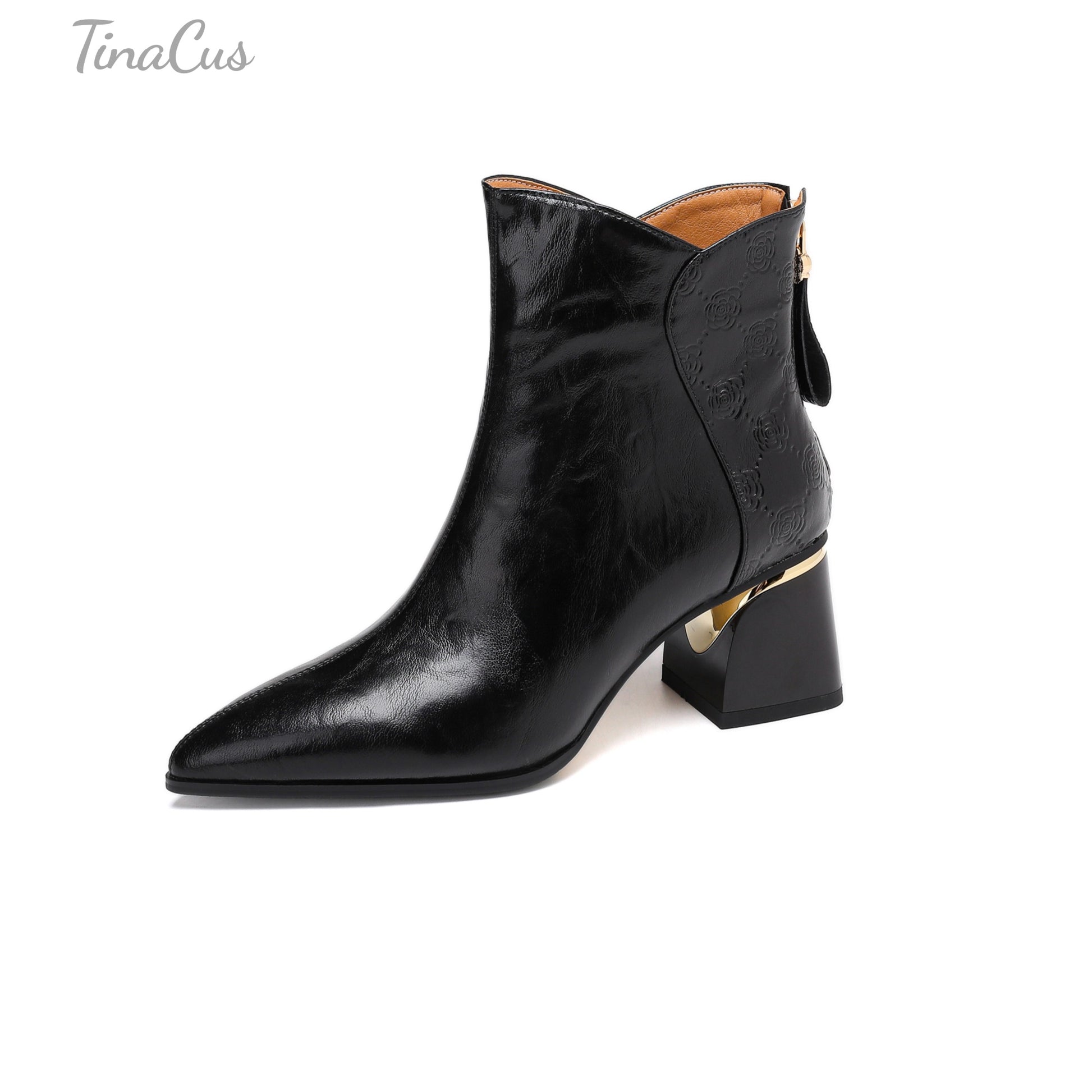 TinaCus Genuine Leather Handmade Chunky Heels Women's Pointed Toe Trendy Ankle Boots with Back Zipper