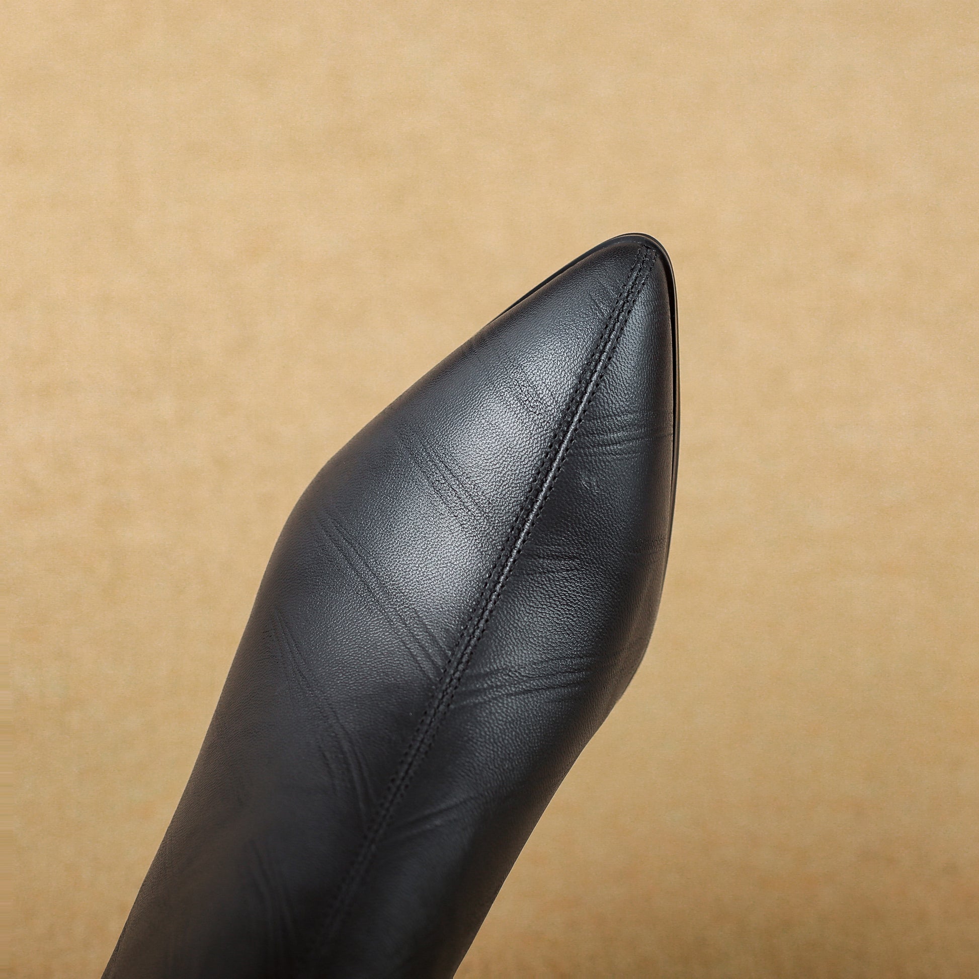 Ankle boots designed with genuine leather, pointed toe, chunky heels and zipper to keep up with fashion trend