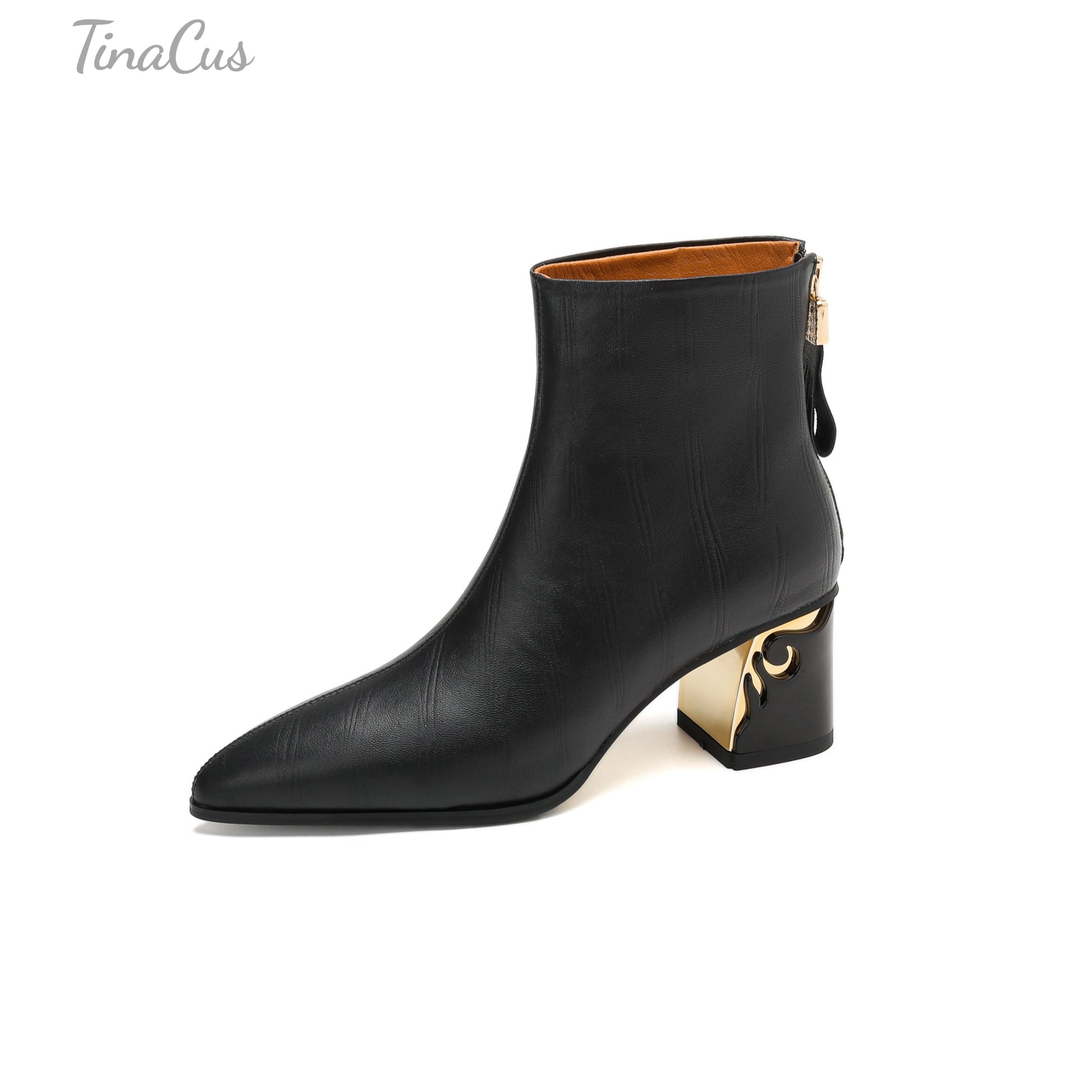 TinaCus Genuine Leather Mid Chunky Heels Ankle Boots Women's Pointed Toe Handmade Back Zipper