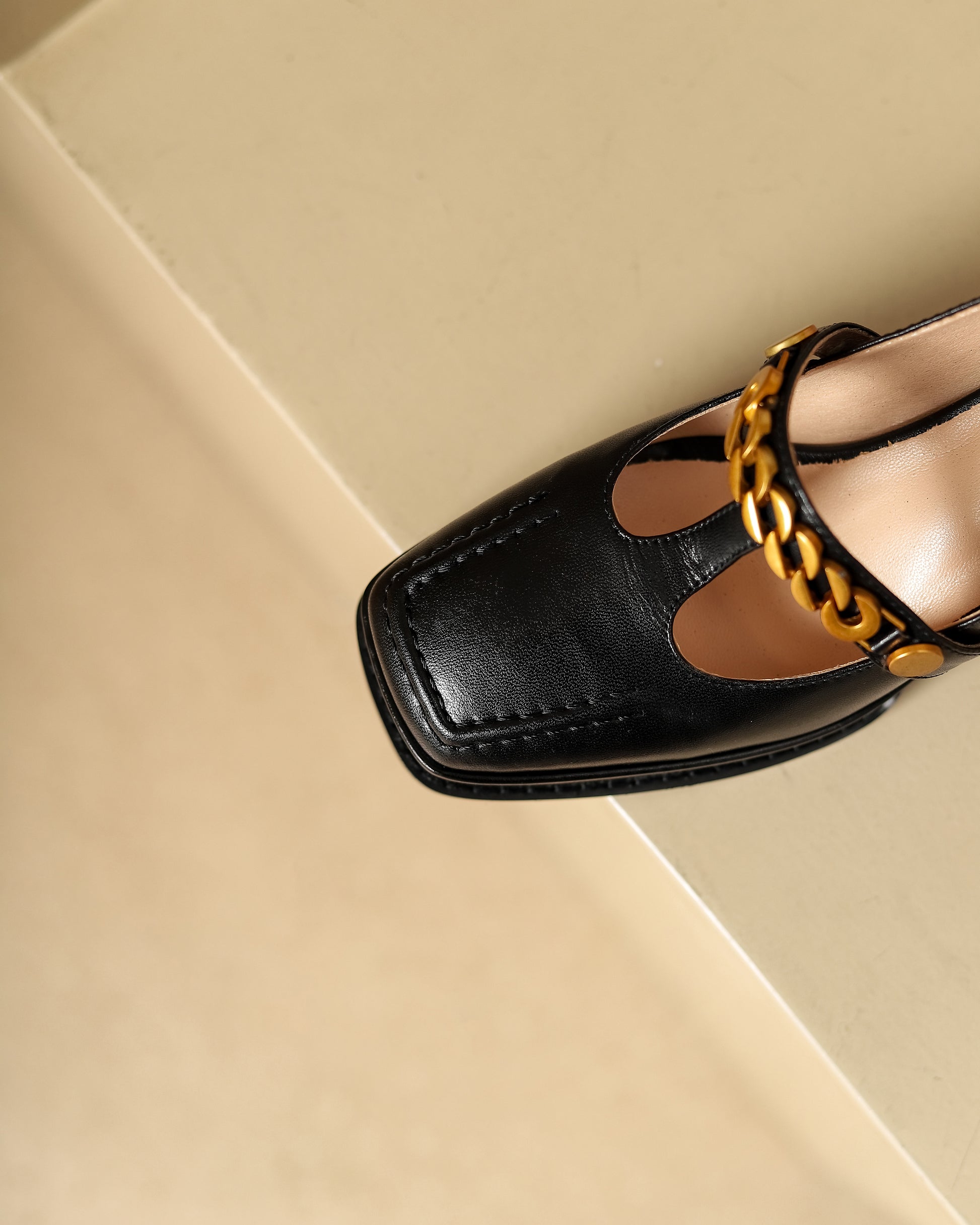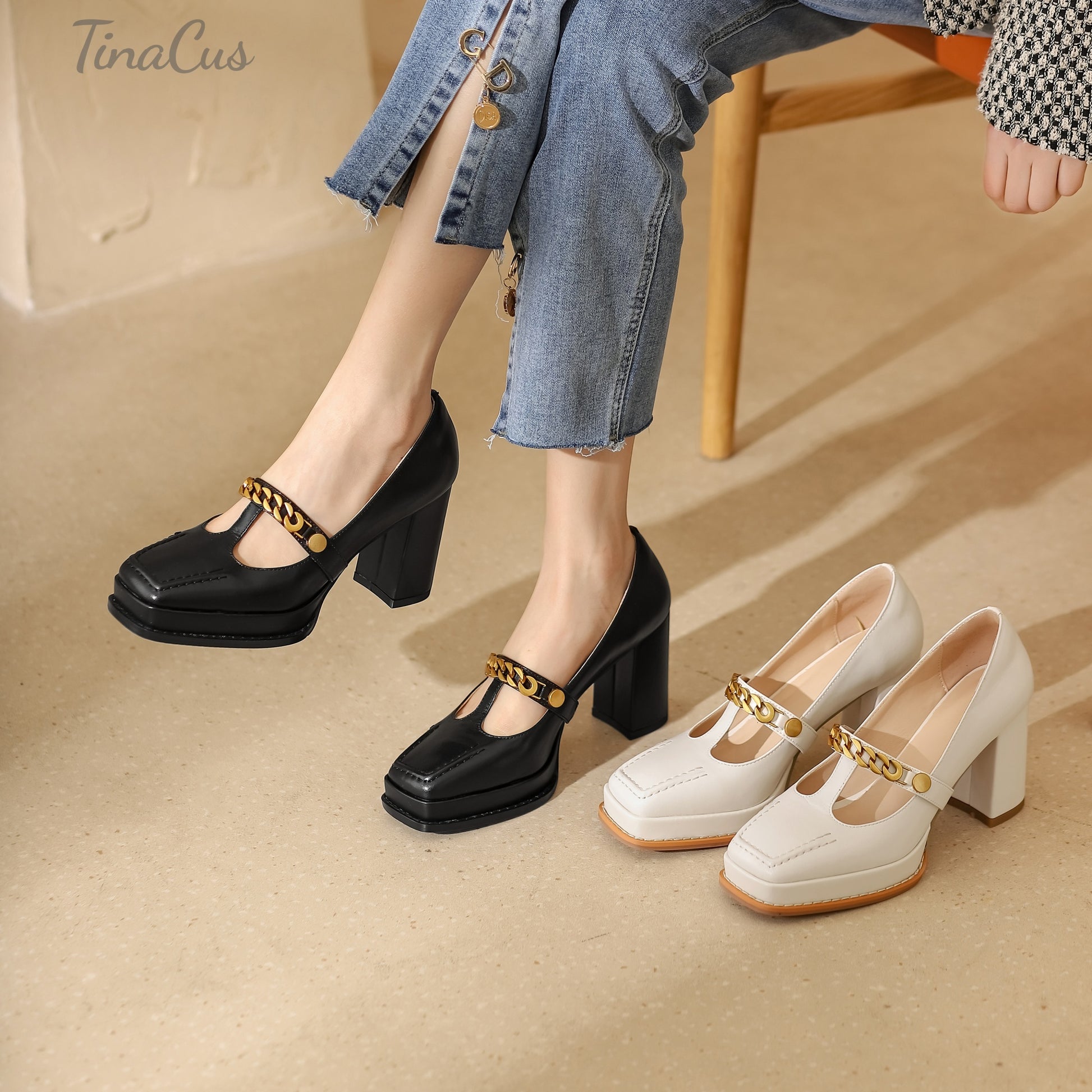 Genuine leather pumps shoes designed with square toe, t-strap, platform, chain and high heels to keep up with fashion trend