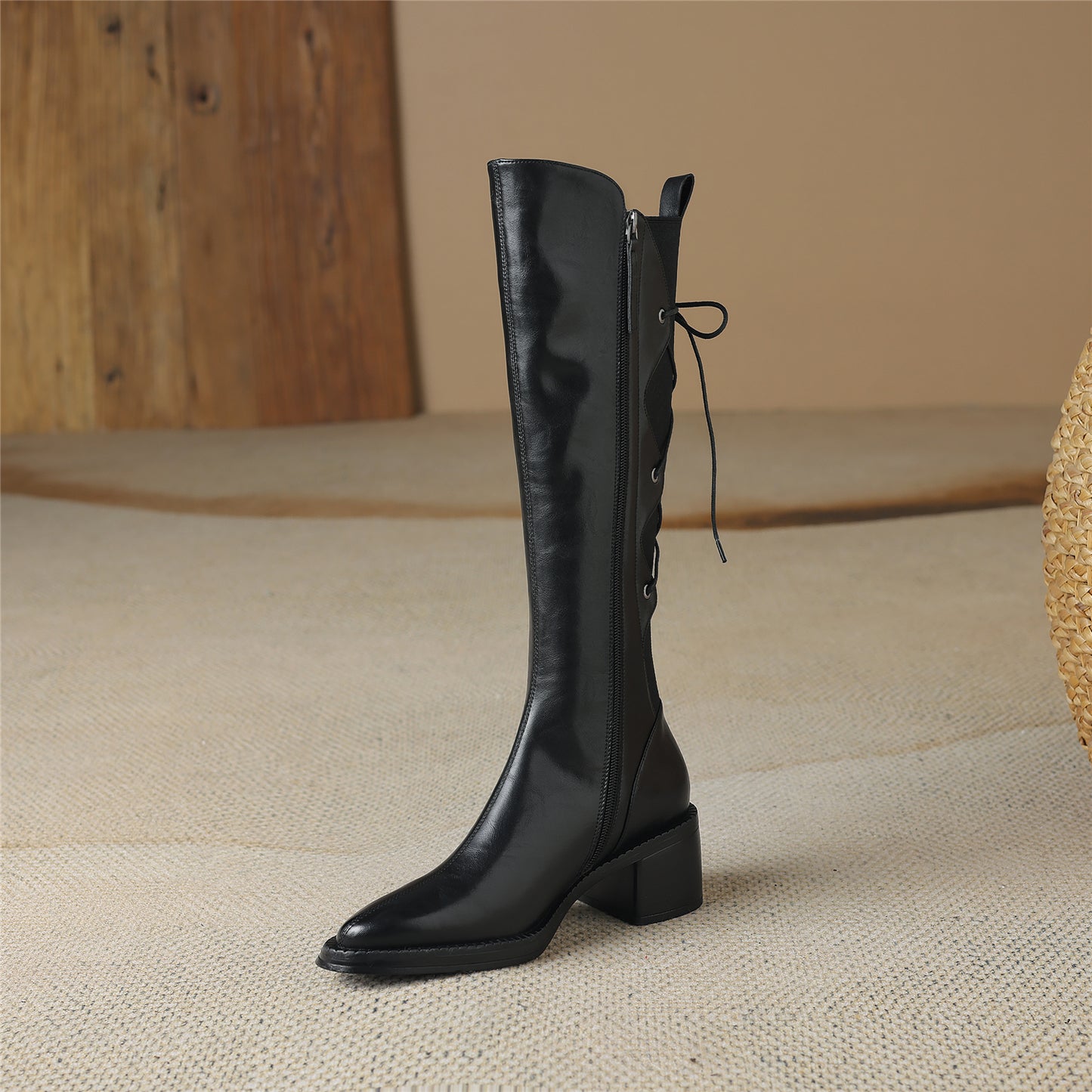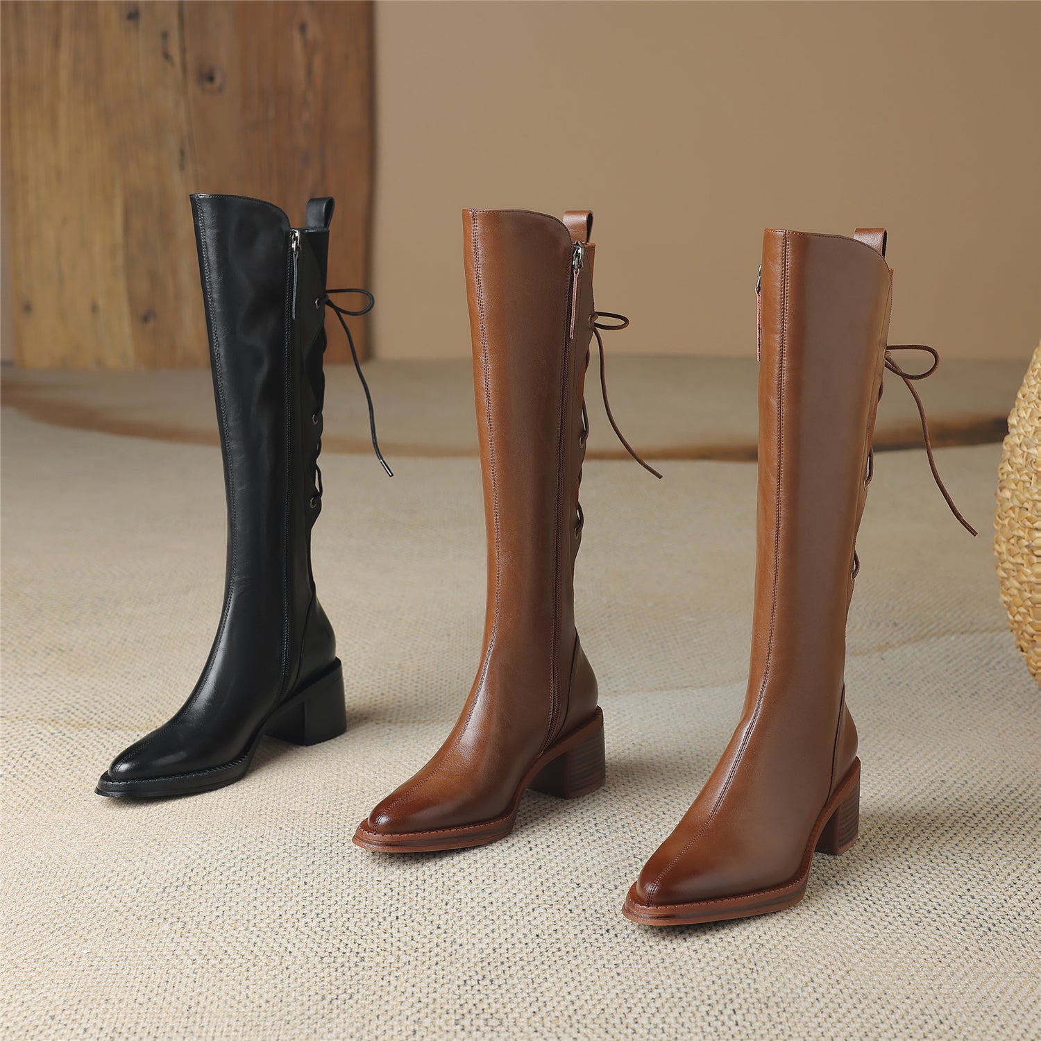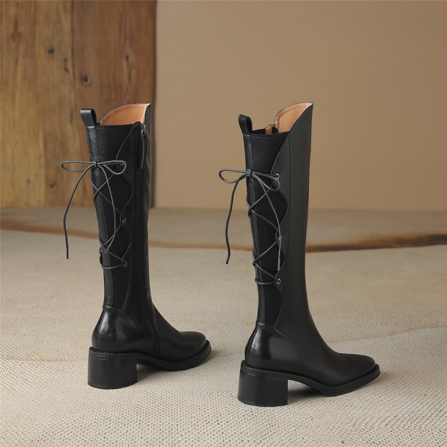 Knee high boots are designed with genuine leather, chunky heel and zip up to keep up with fashion trend.