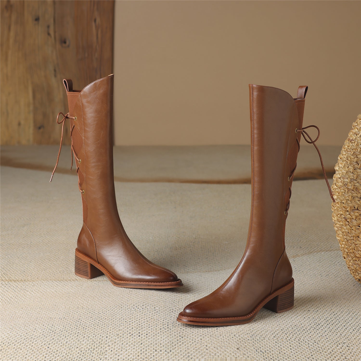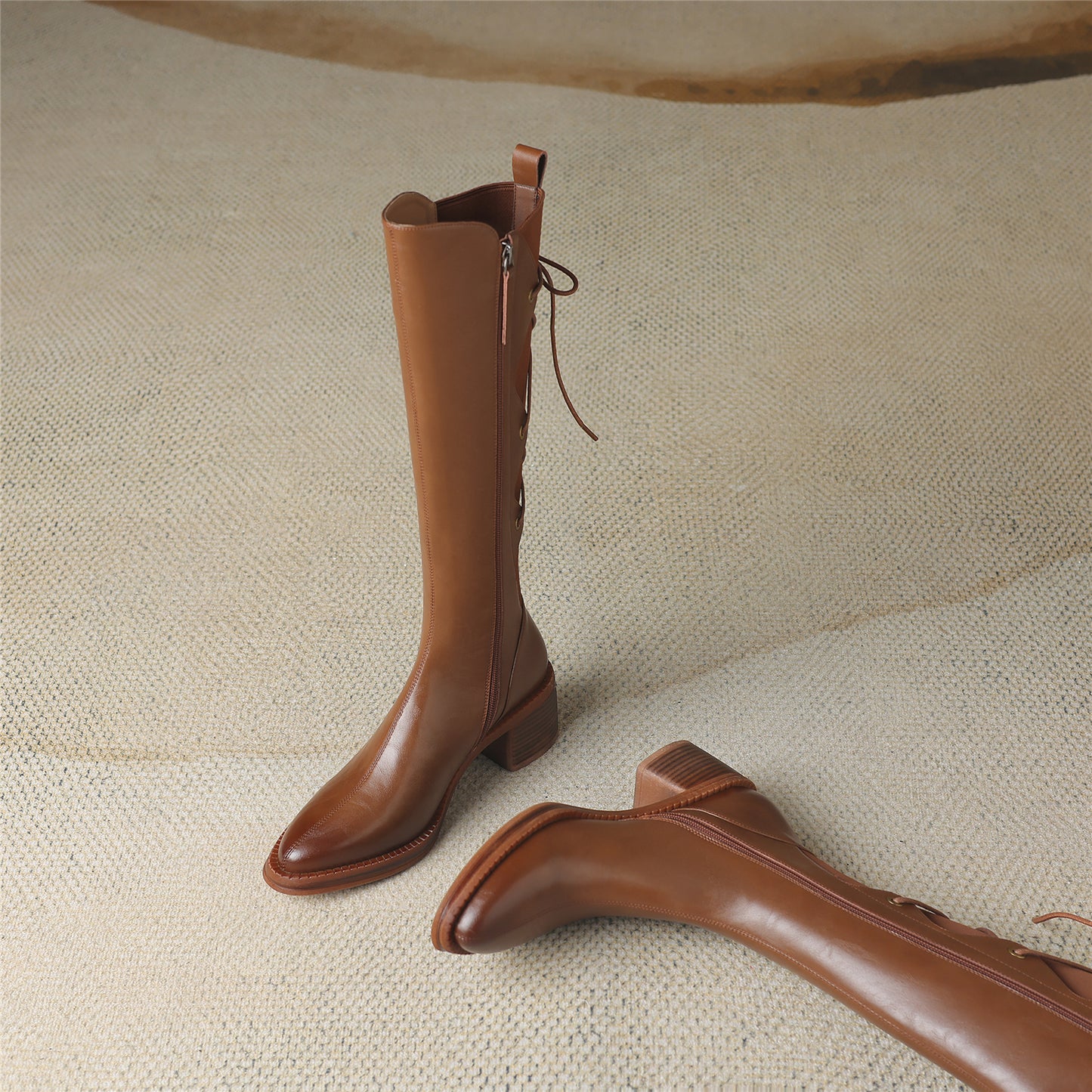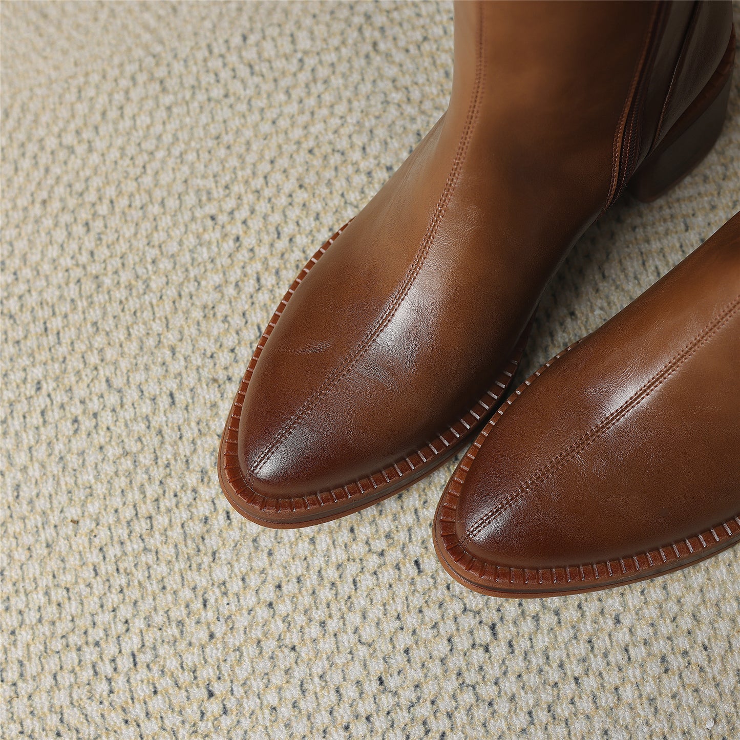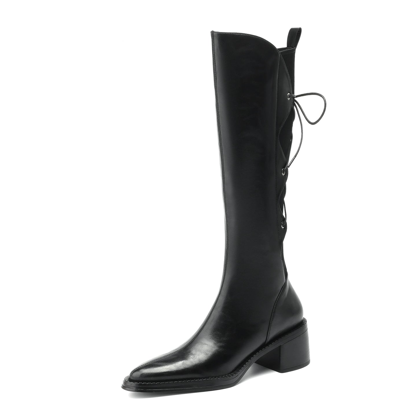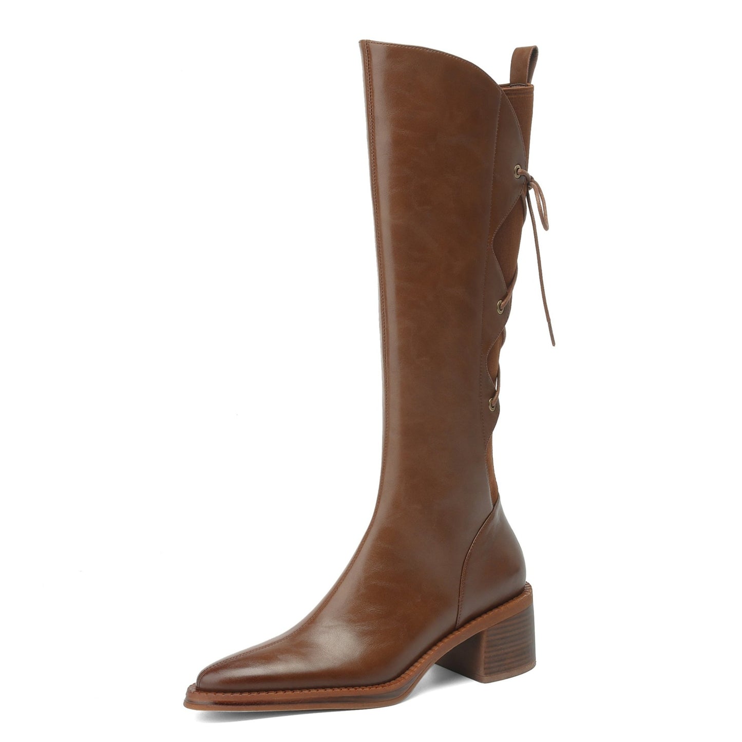 TinaCus Genuine Leather Women's Band Design Pointed Toe Handmade Chunky Heel Zip Up Knee High Boots