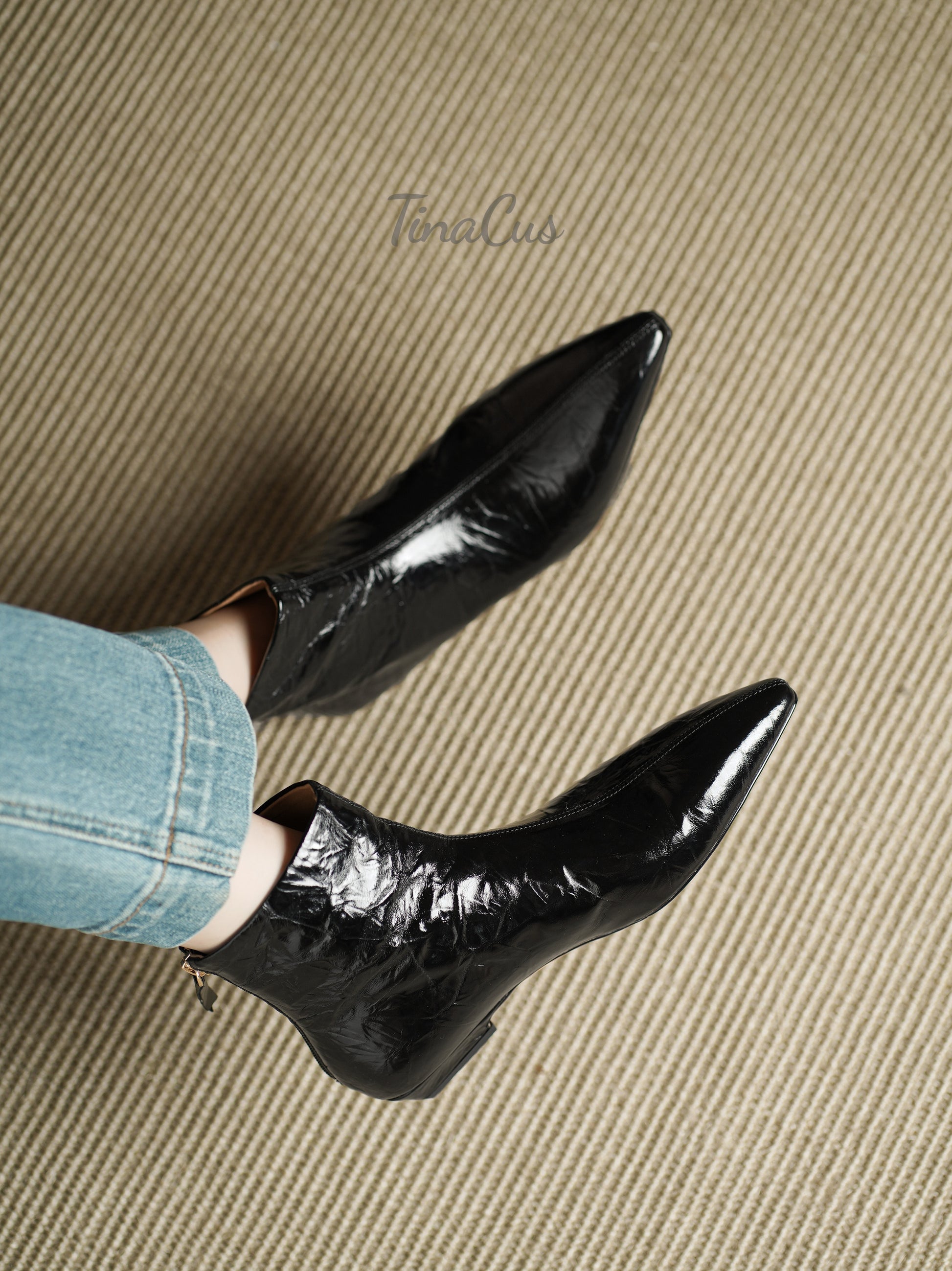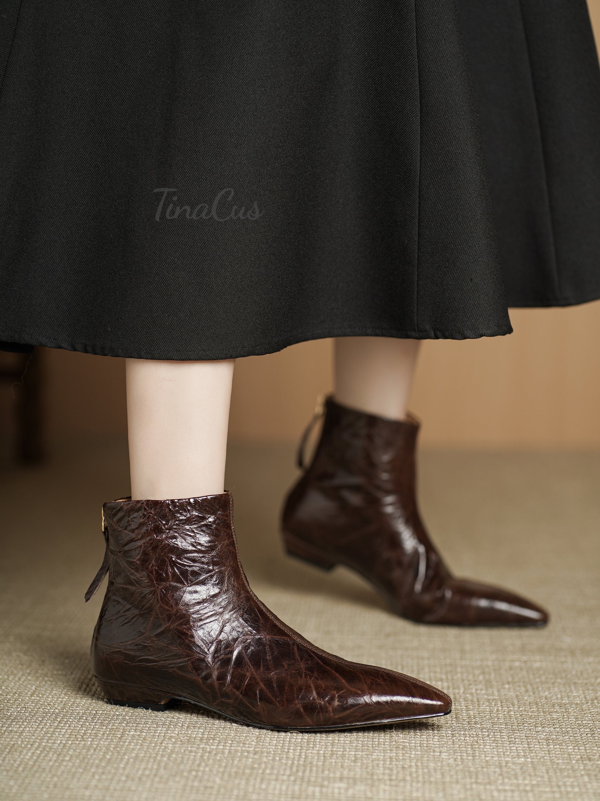 Ankle boots designed with pointed toe, back zipper, genuine leather and flats can go with kinds of outfits