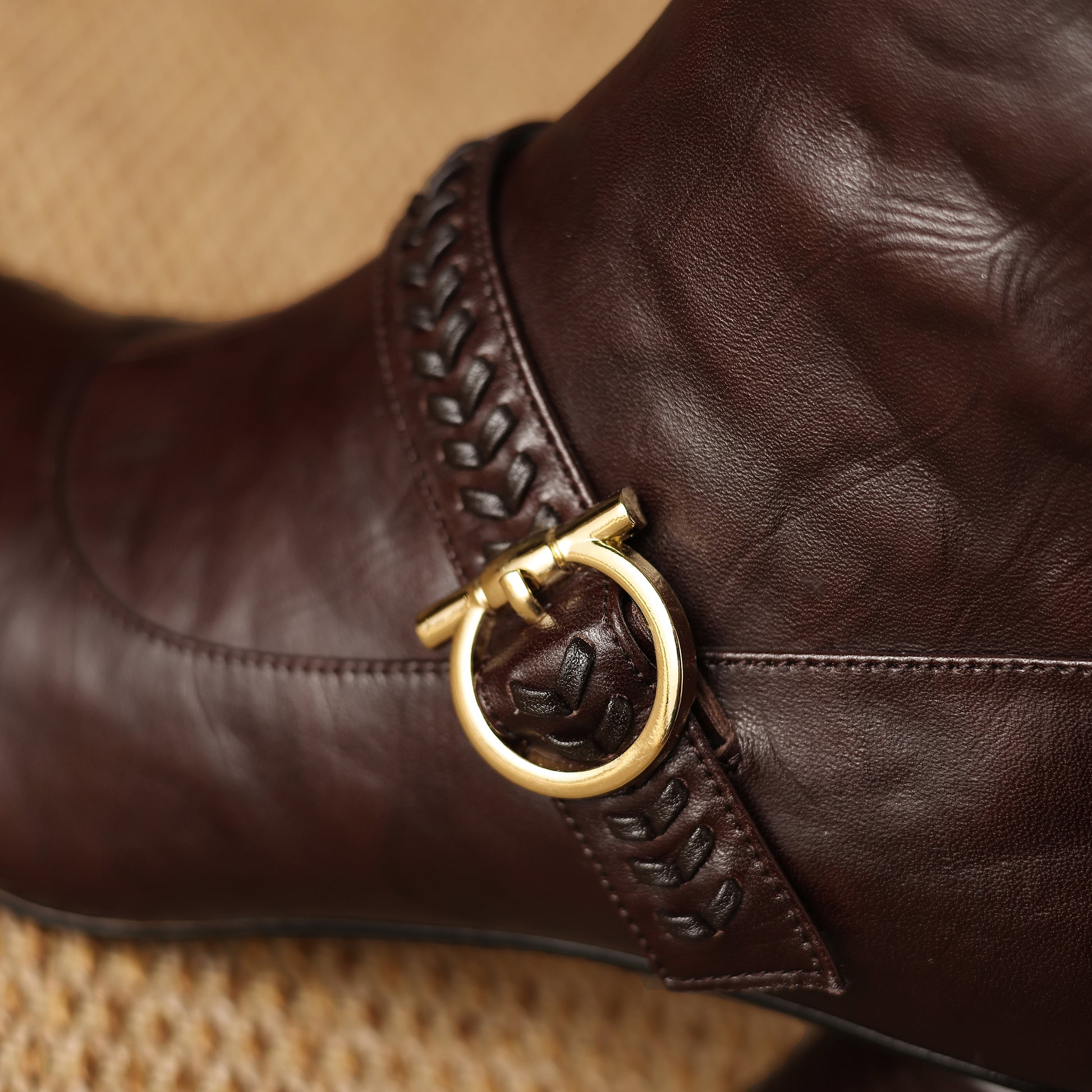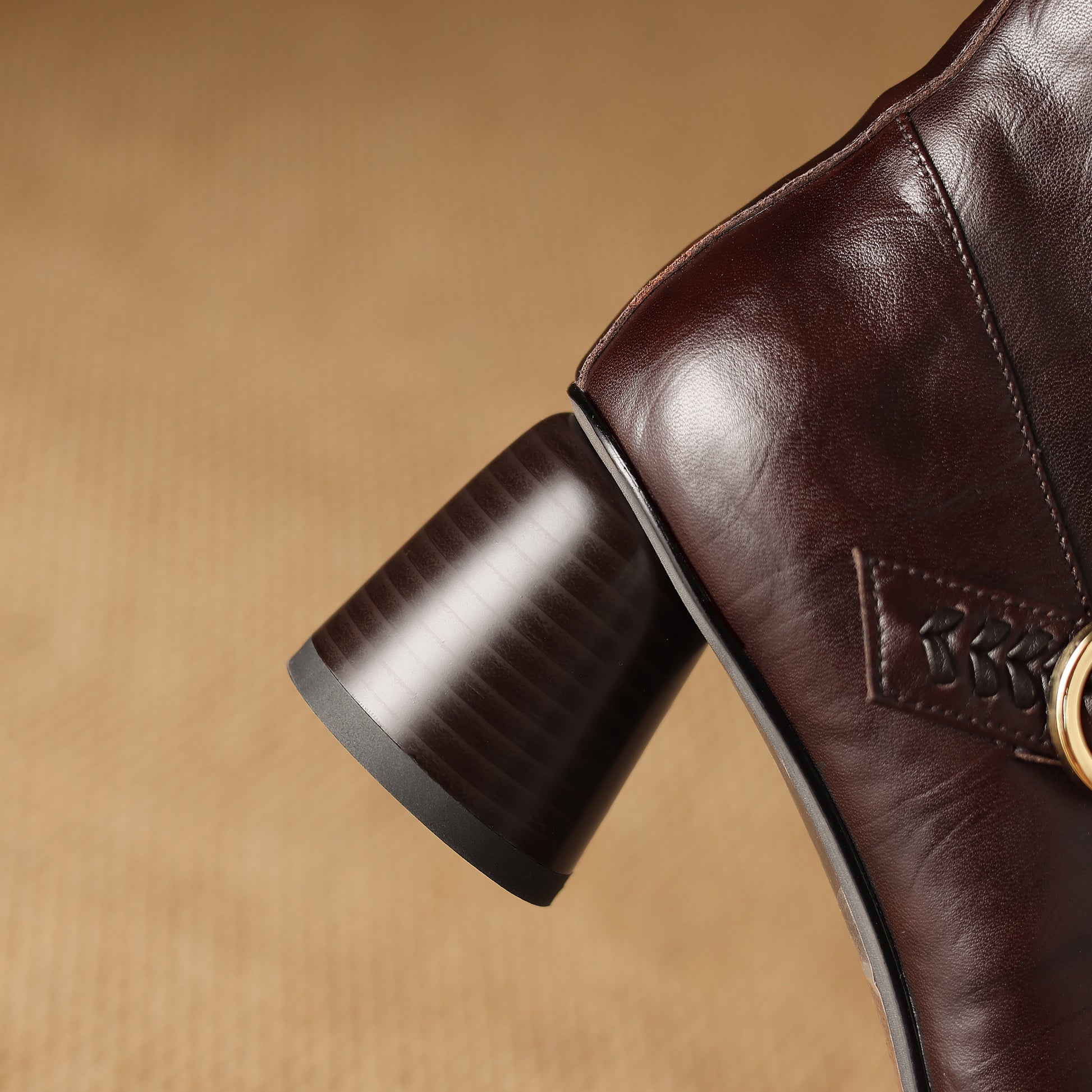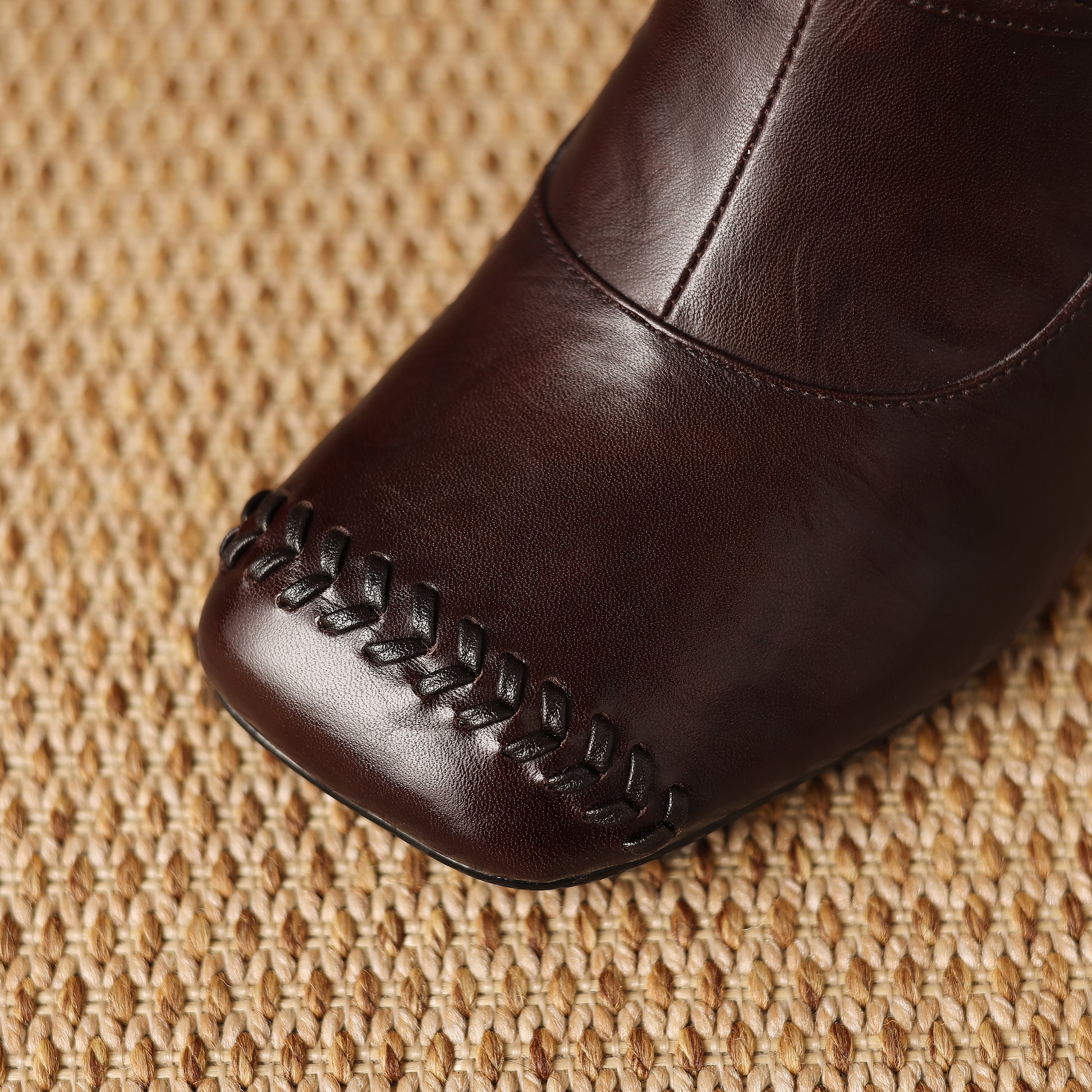 Ankle boots designed with genuine leather, square toe, mid heels and zipper can go with kinds of outfits