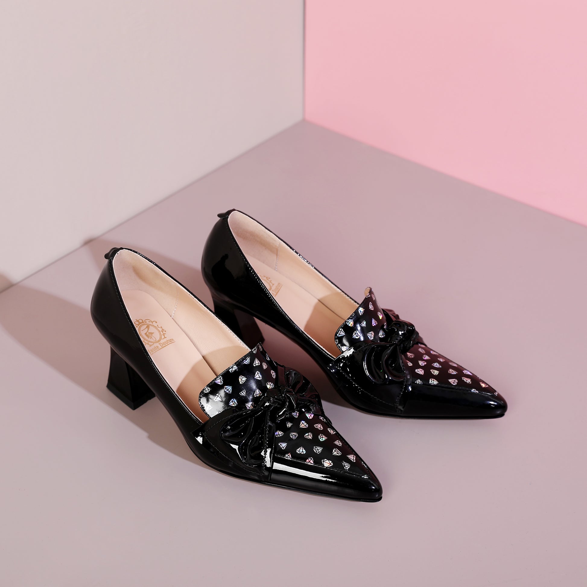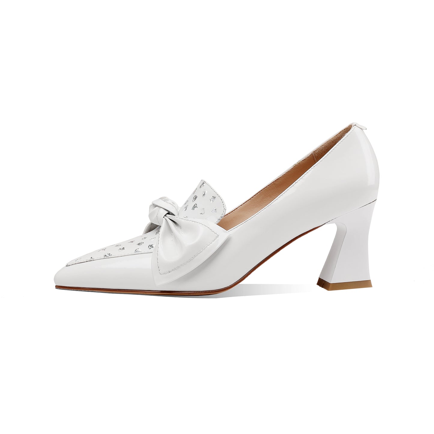 TinaCus Glossy Patent Leather Women's Handmade Pointed Toe Dots Decor Spool Heel Pumps with Bowknot