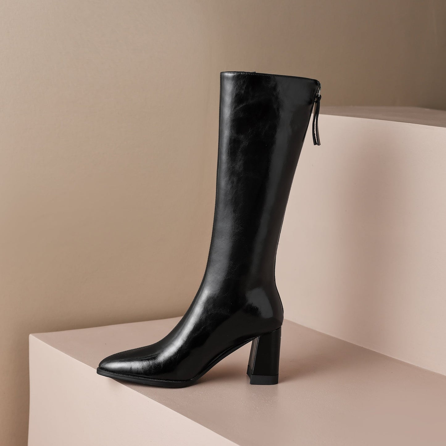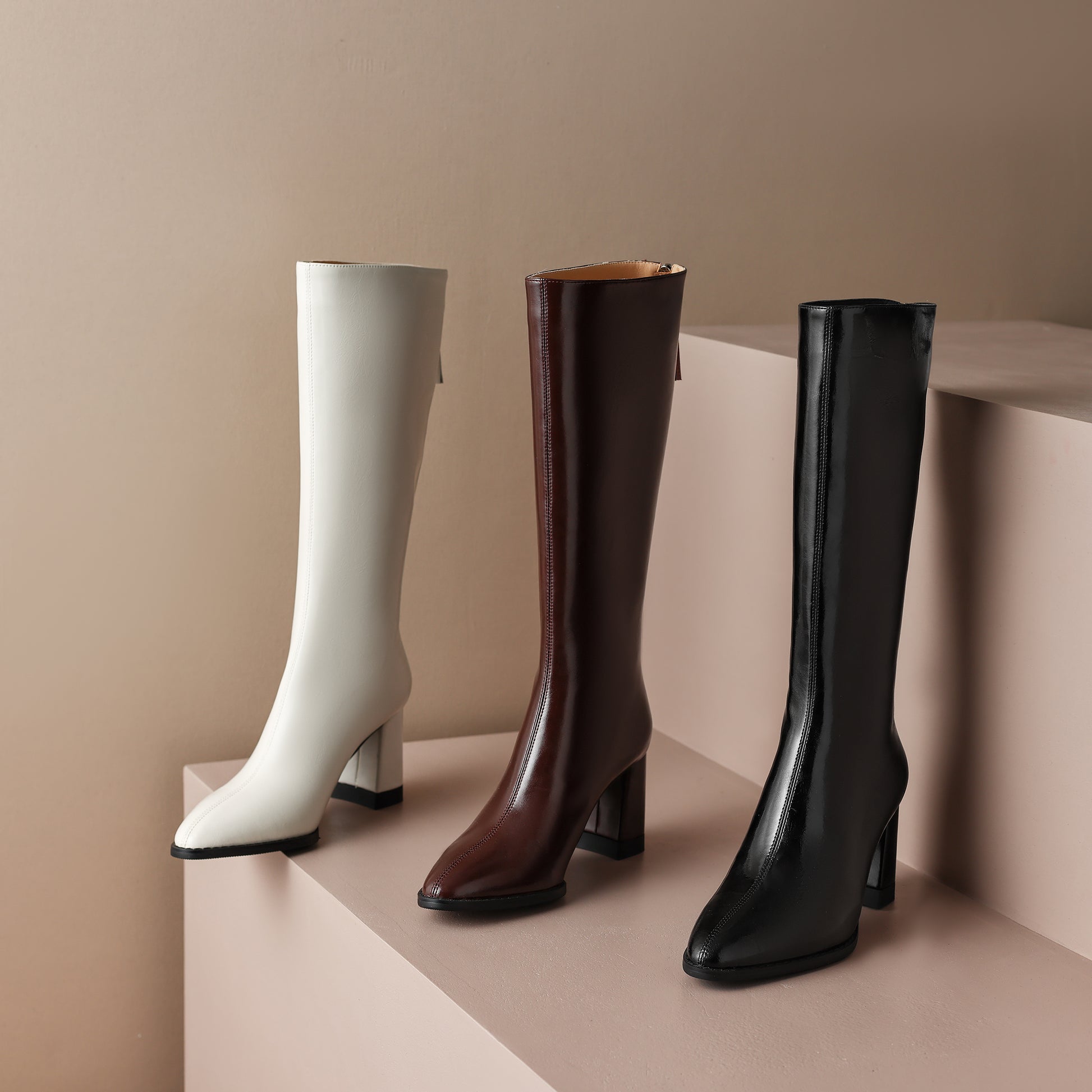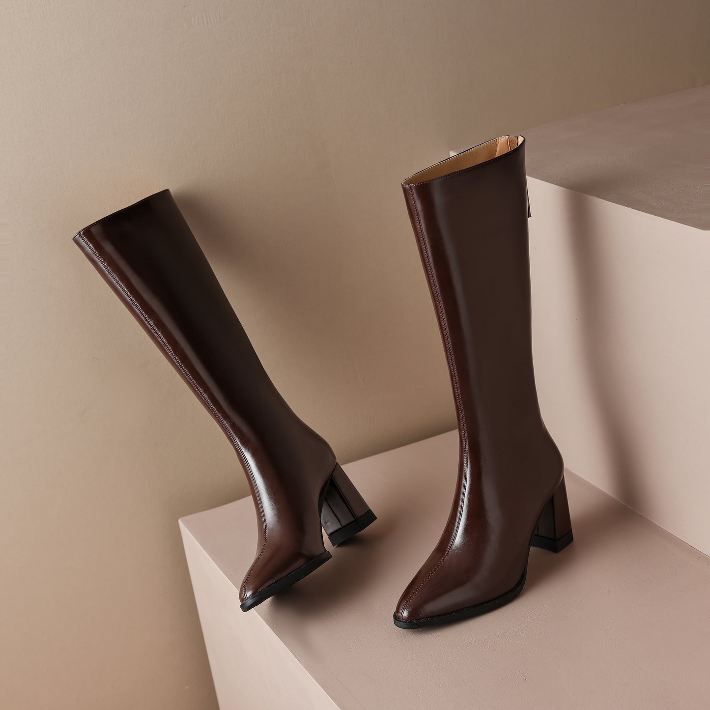 TinaCus Handmade Women's Genuine Leather Chunky Heel Zip Up Knee High Boots