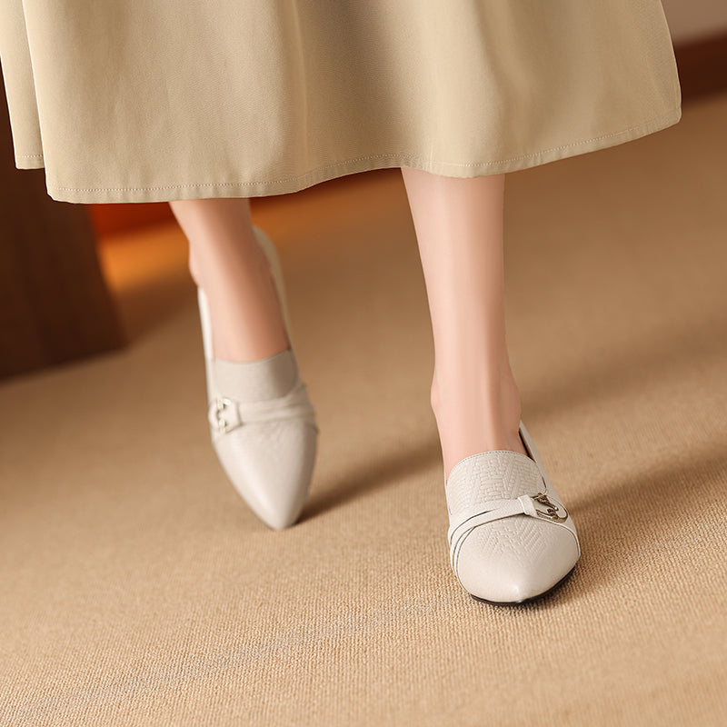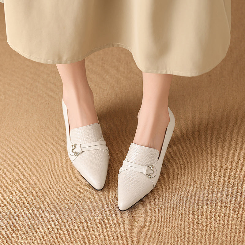 TinaCus Handmade Women's Genuine Leather Embossed Decor Buckle Pointed Toe Low Heel Loafers Shoes
