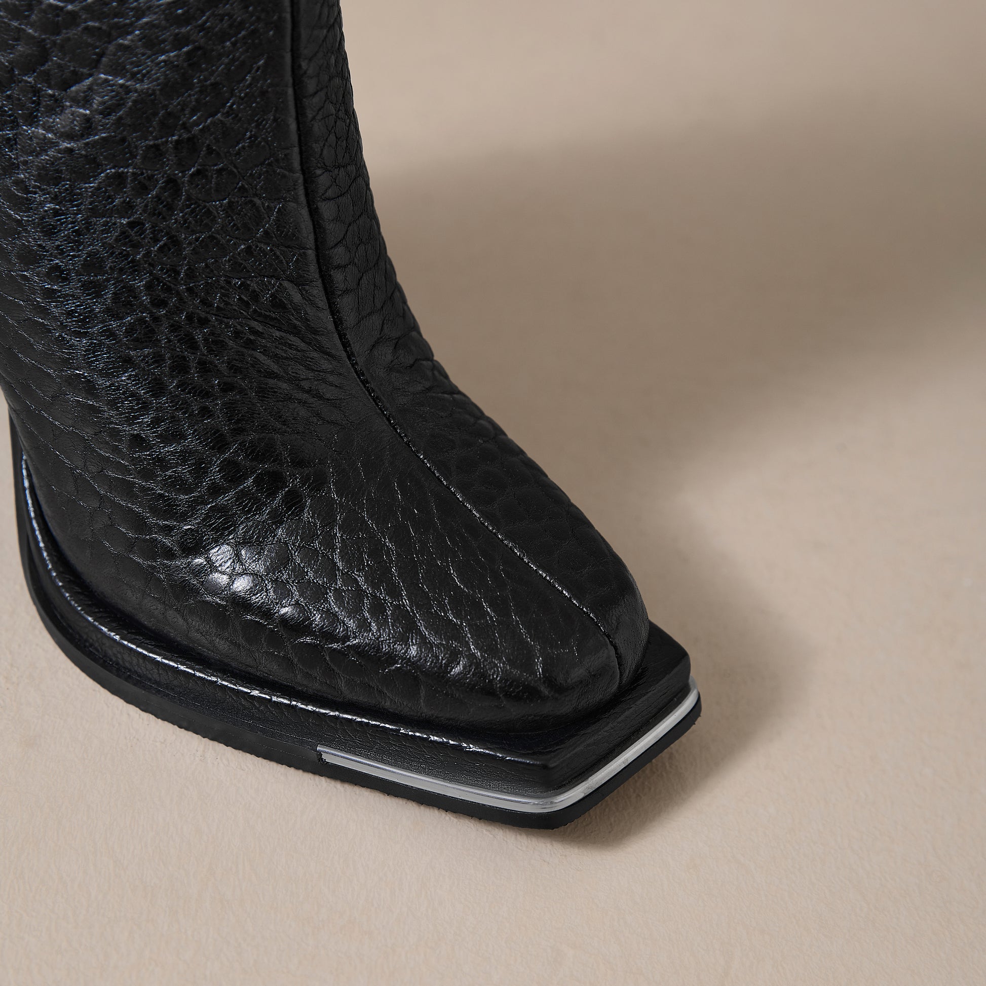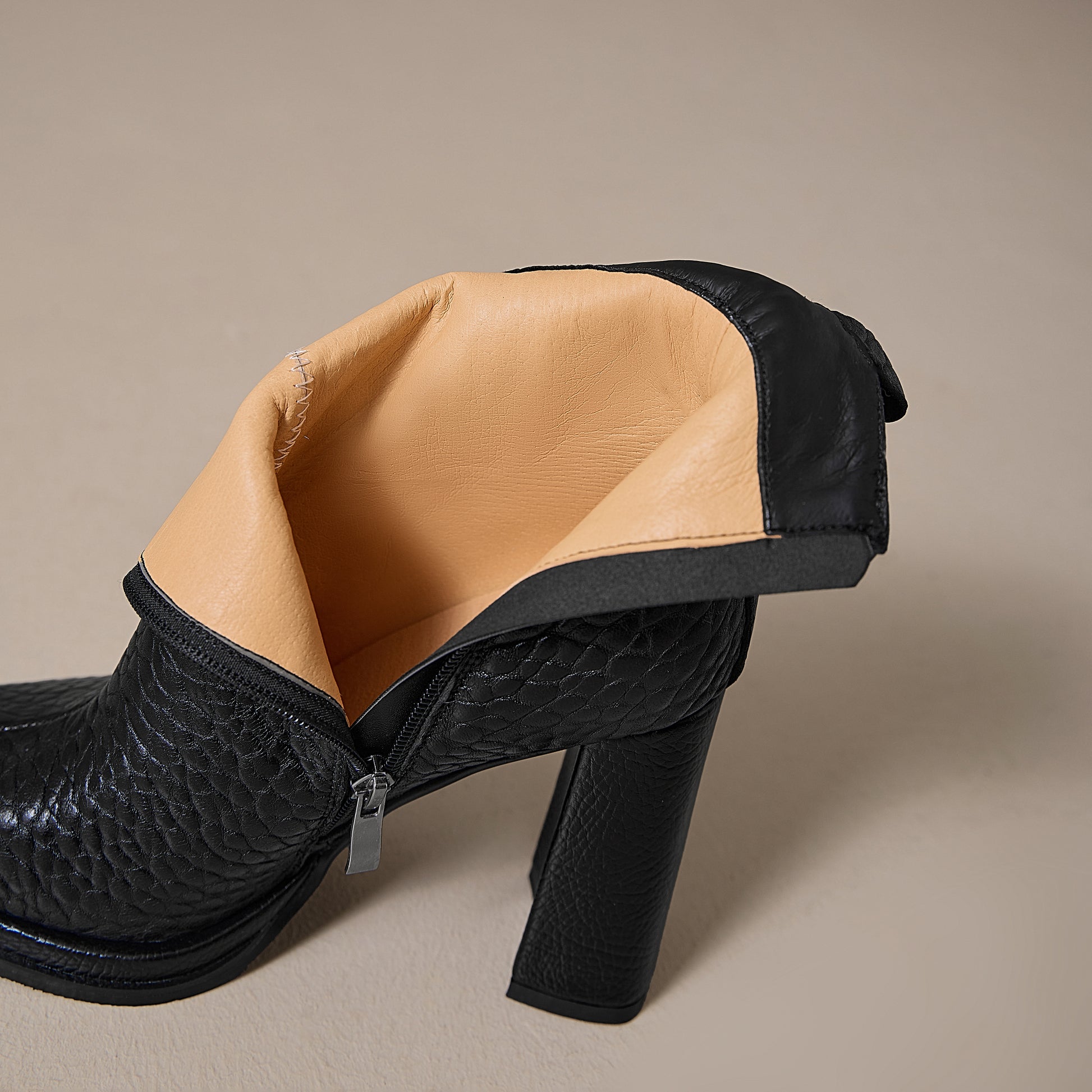 Ankle boots designed with genuine leather, square toe, high heels and zipper to keep up with fashion trend
